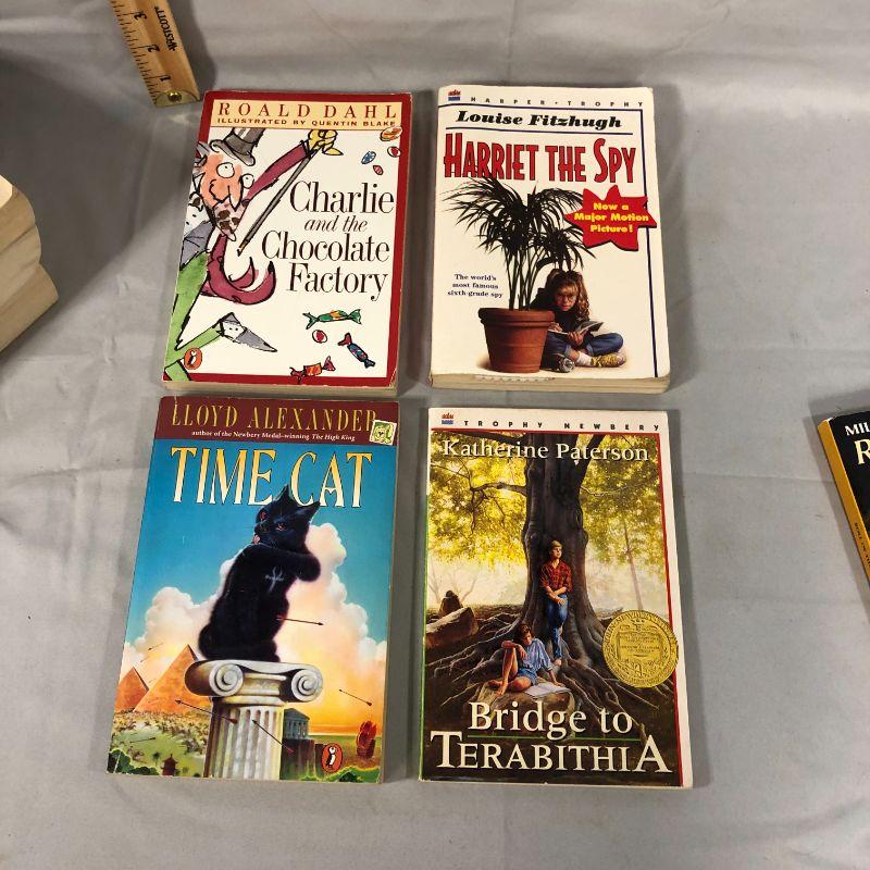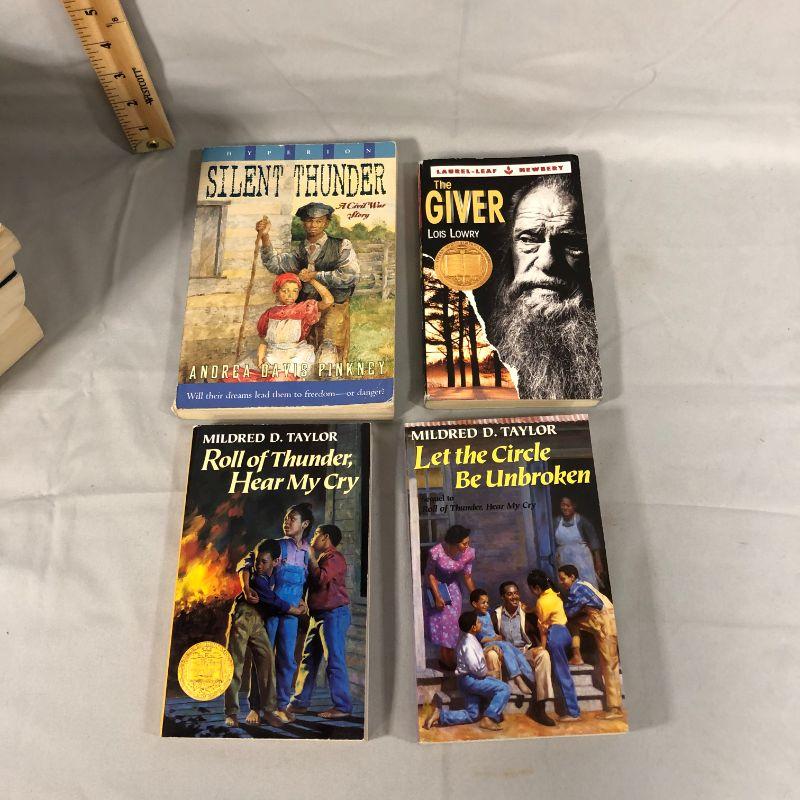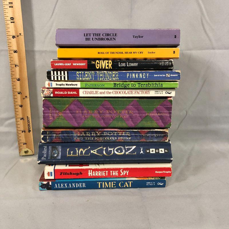 These are all in gently read condition. Some are required reading for kiddos in 5th - 8th grade (The Giver, Roll of Thunder Hear My Cry, Charlie and the Chocolate Factory).