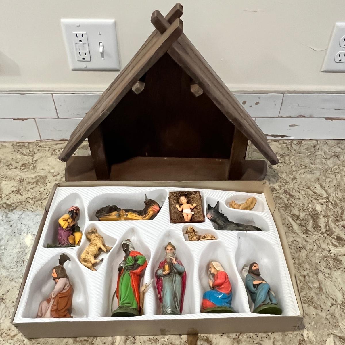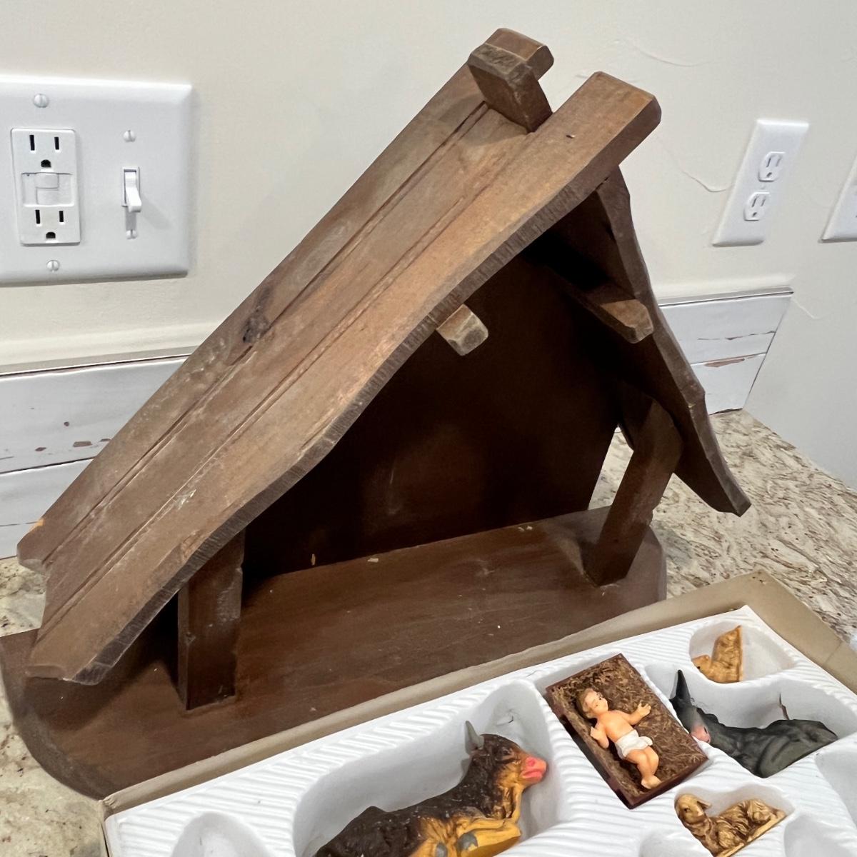 Hand made manger w/ nativity set