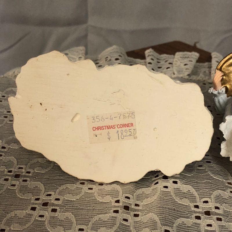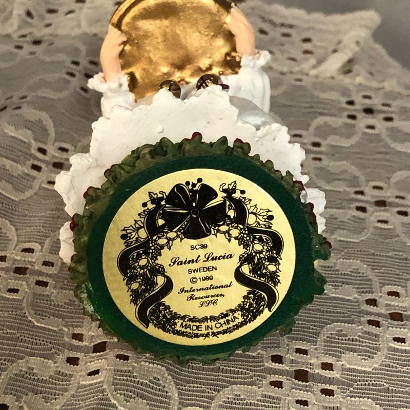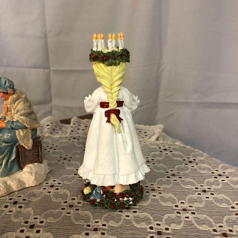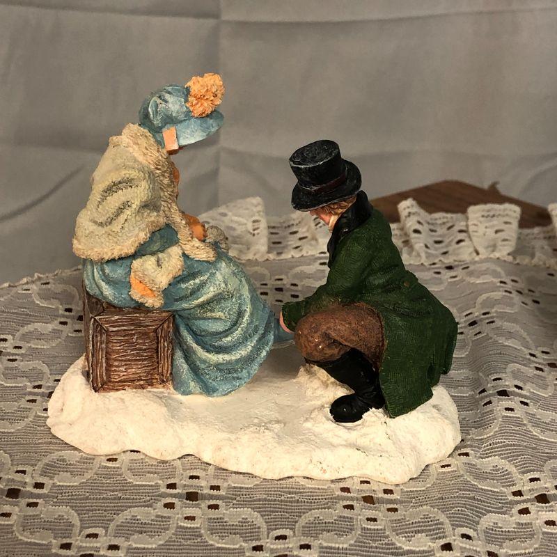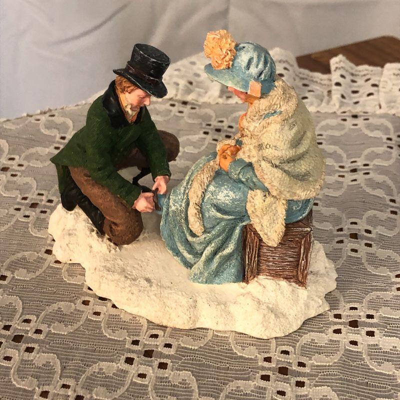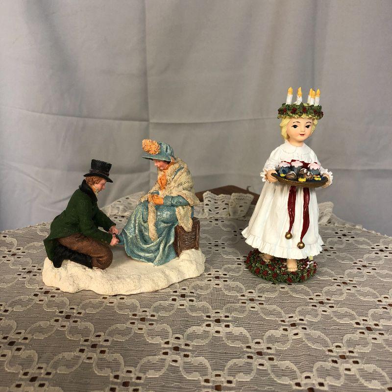 The girl is Saint Lucia and copyrighted in 1999. She is 4.75" tall and in great condition. The second figurine is a man tieing the shoe of his lady, but there is not a maker's mark on this one. It is just over 3.5" tall.