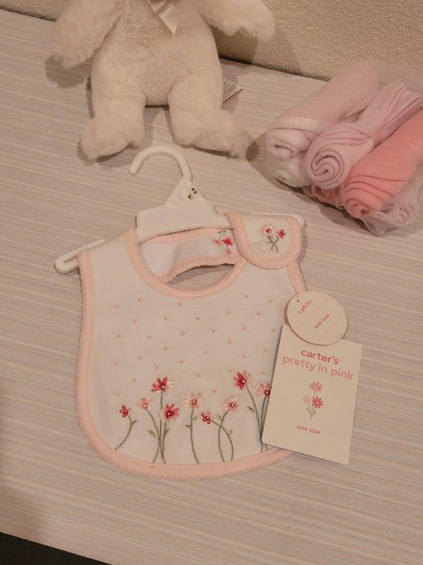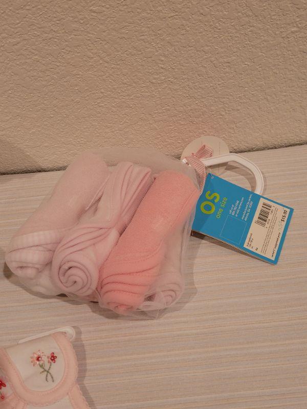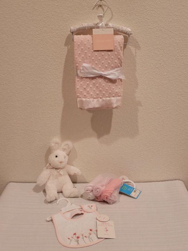 Lot 76: New Baby Girl Blanket, Bib, Washcloths and Bunny