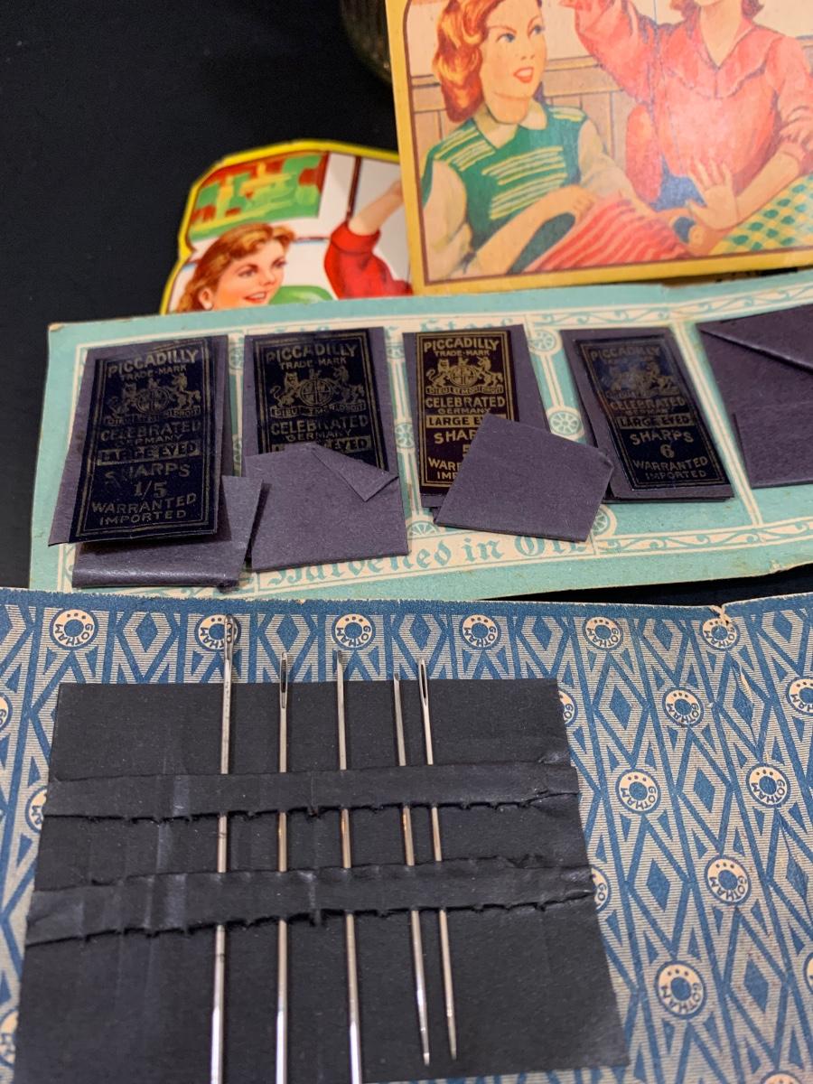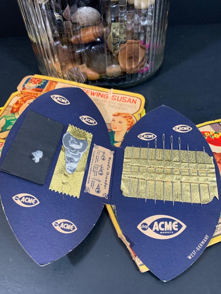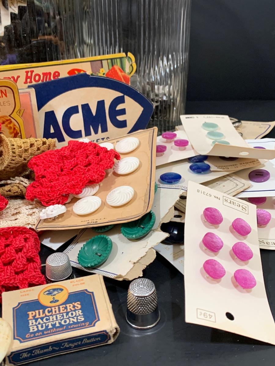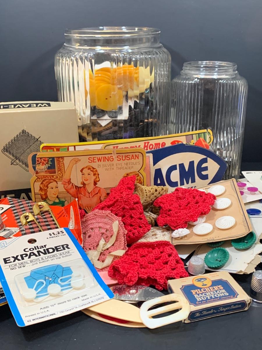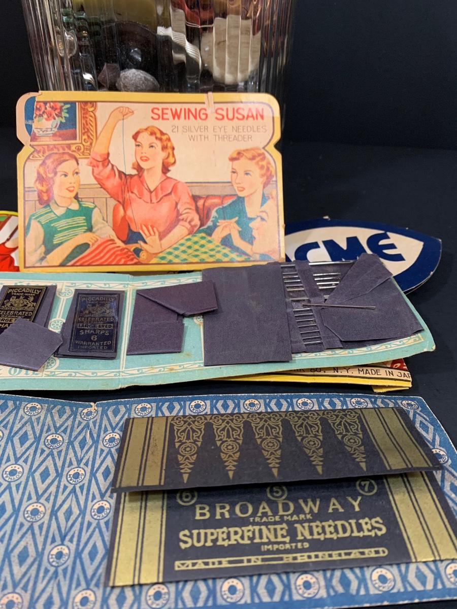Vintage jars filled with antique/vintage buttons, advertising sewing kits, golden needle, button on original cardboard..