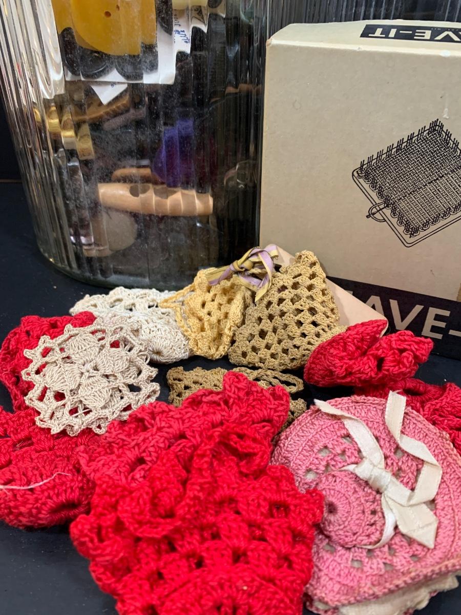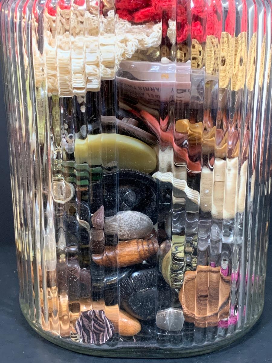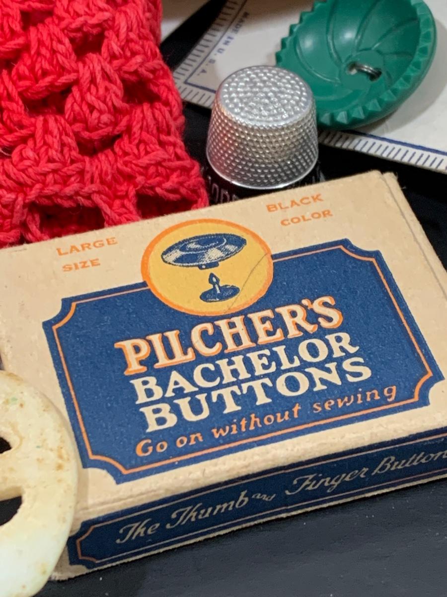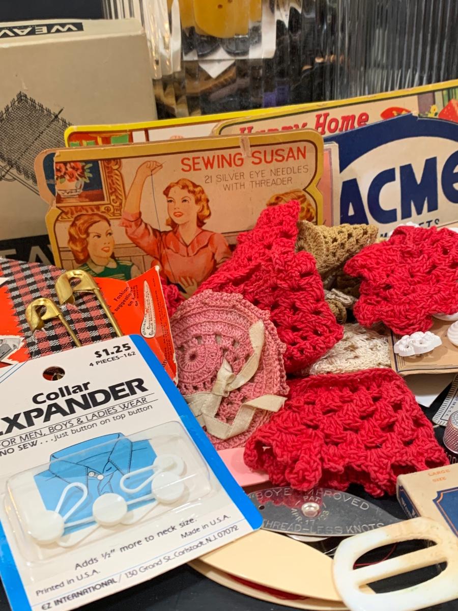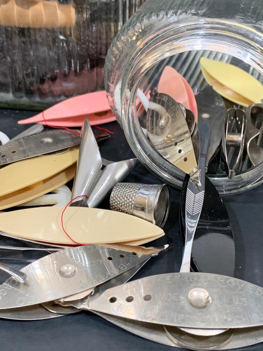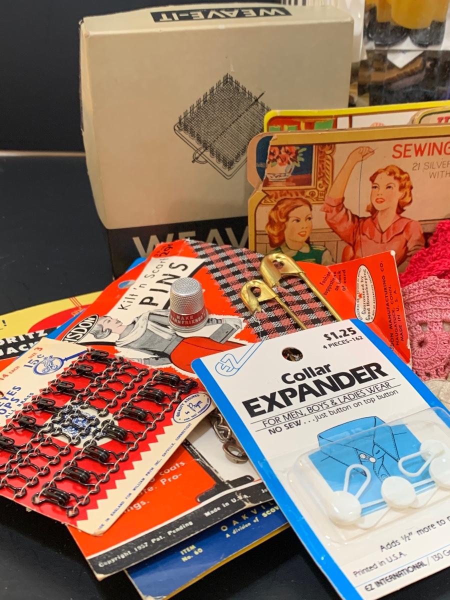 Vintage jars filled with antique/vintage buttons, advertising sewing kits, golden needle, button on original cardboard..