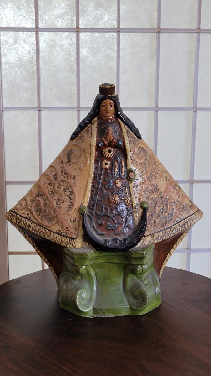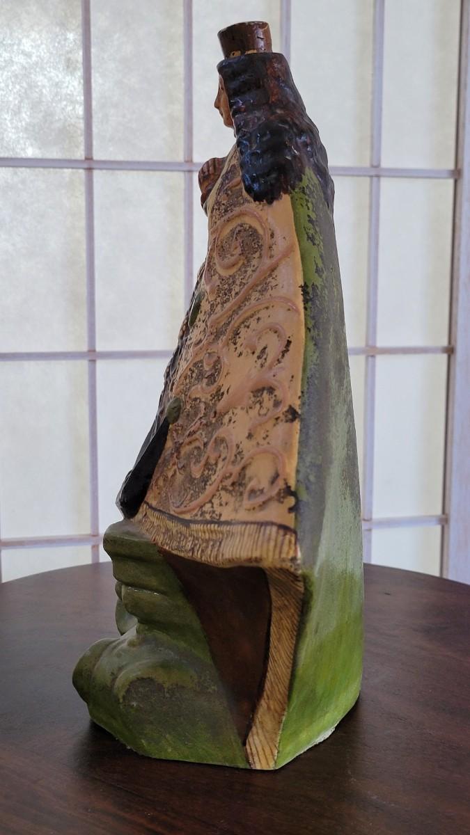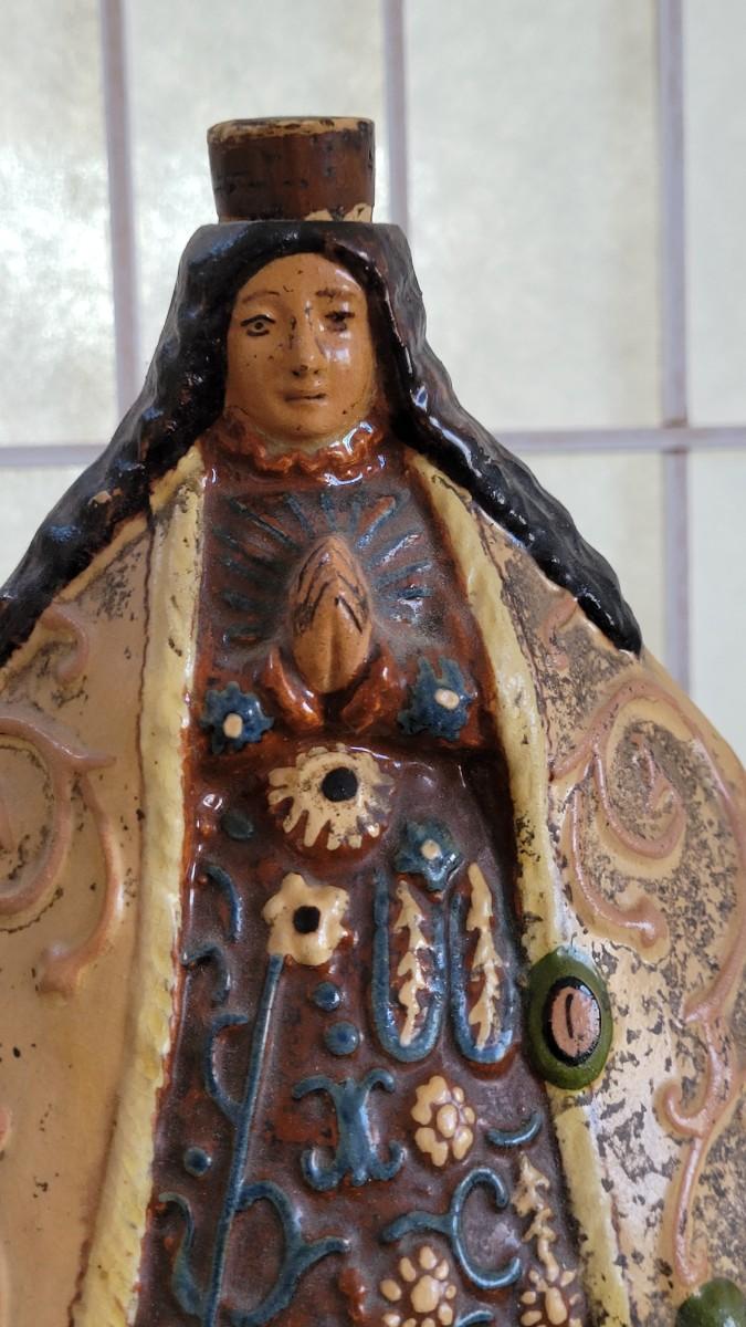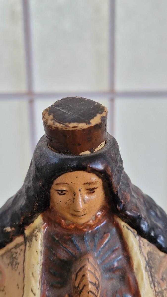 Exquisitely detailed decanter possibly used to hold holy water. Virgin is also known as Our Lady of Expectation and she is the Patroness against storms and lightning.