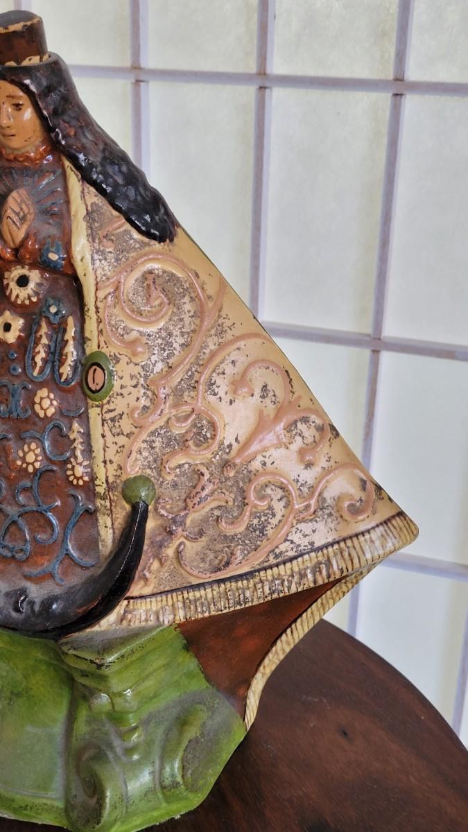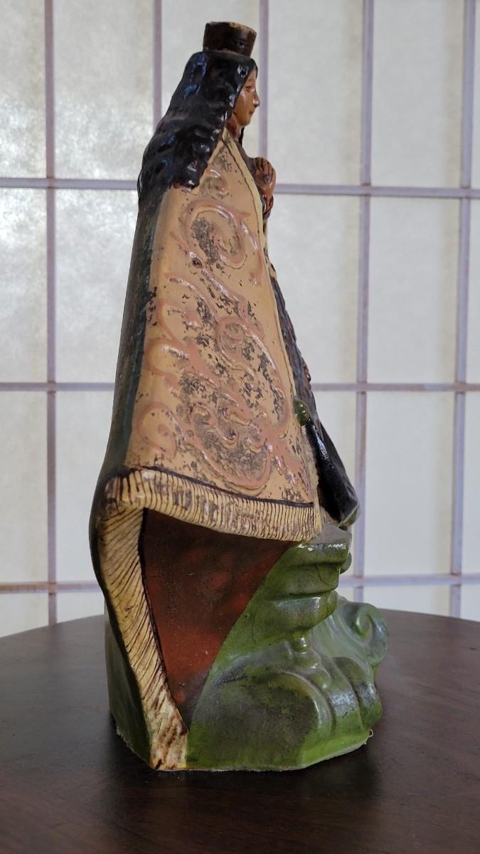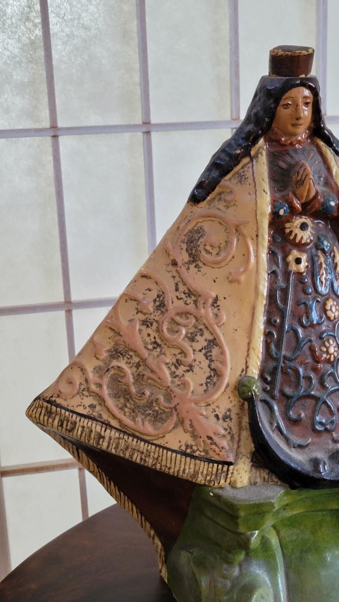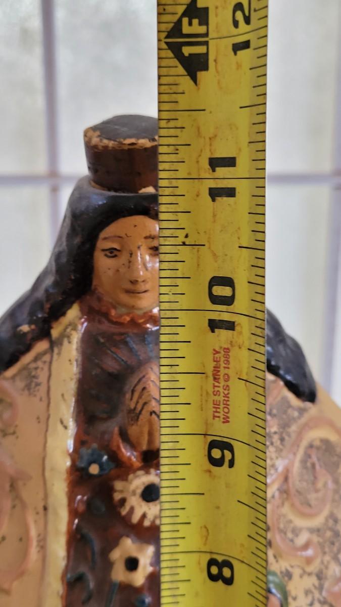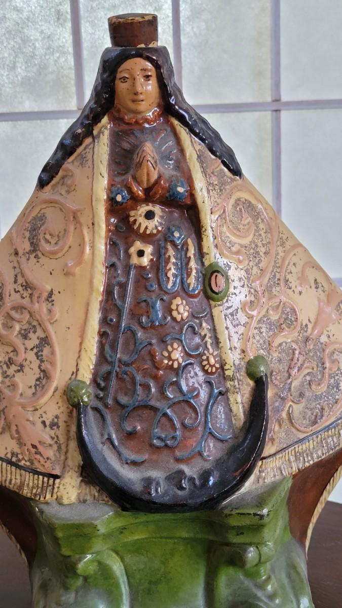 Exquisitely detailed decanter possibly used to hold holy water. Virgin is also known as Our Lady of Expectation and she is the Patroness against storms and lightning.
