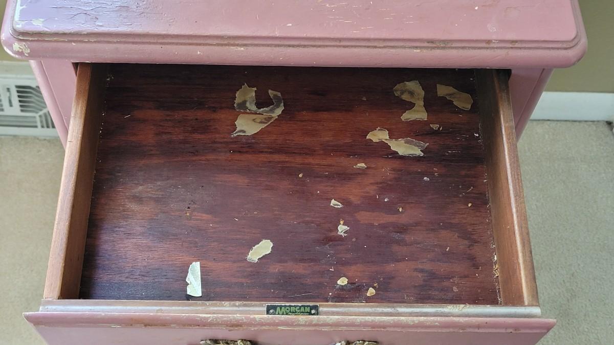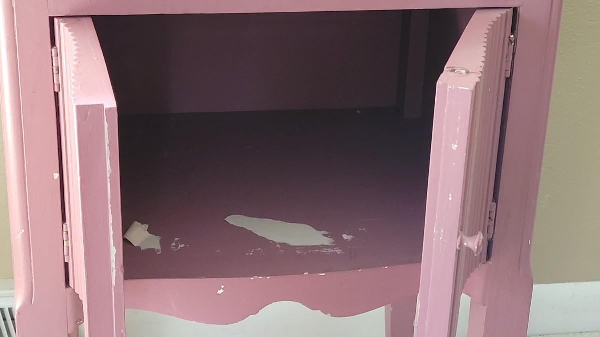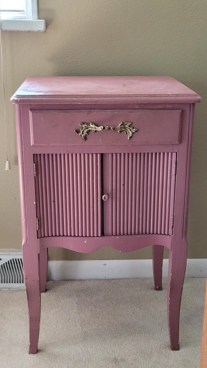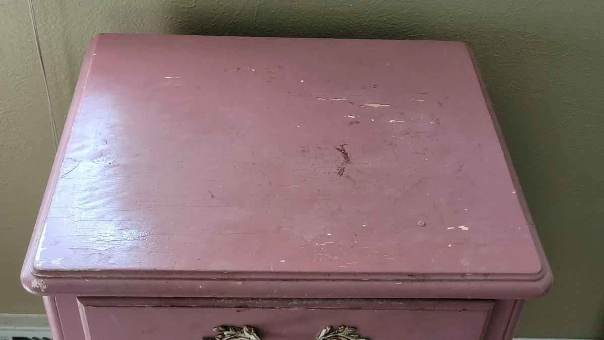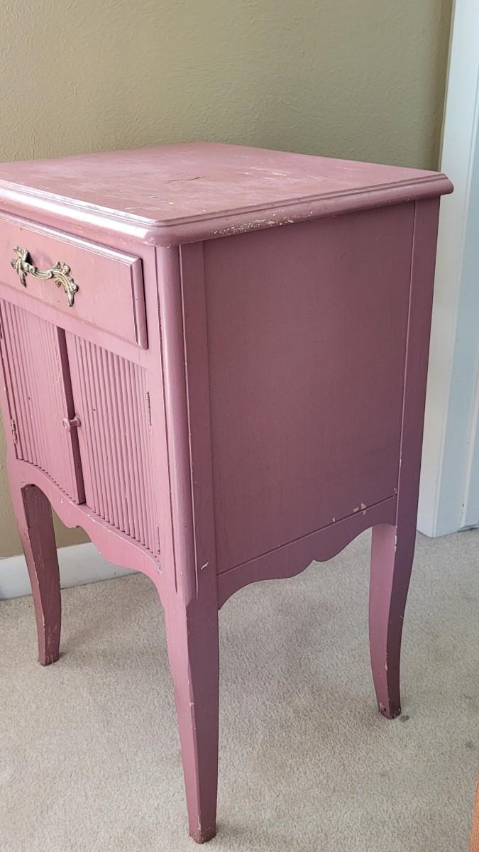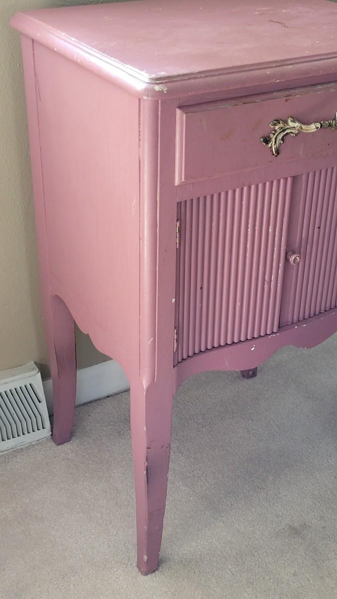 Has been painted pink and the paint is scratched and stained. This would be a great project piece!