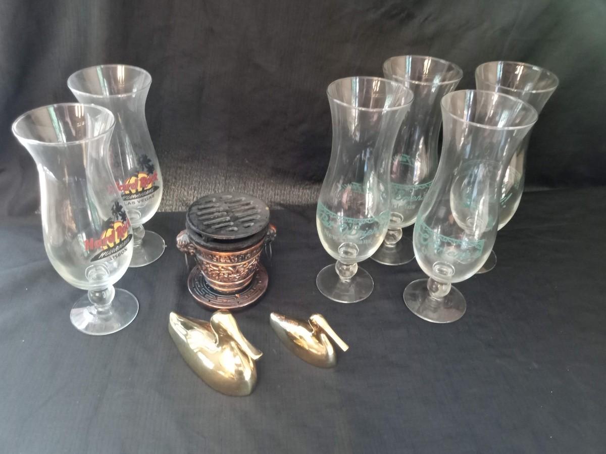 LOT 76  BRASS DUCKS, S'MORES MAKER AND 6 TALL GLASSES