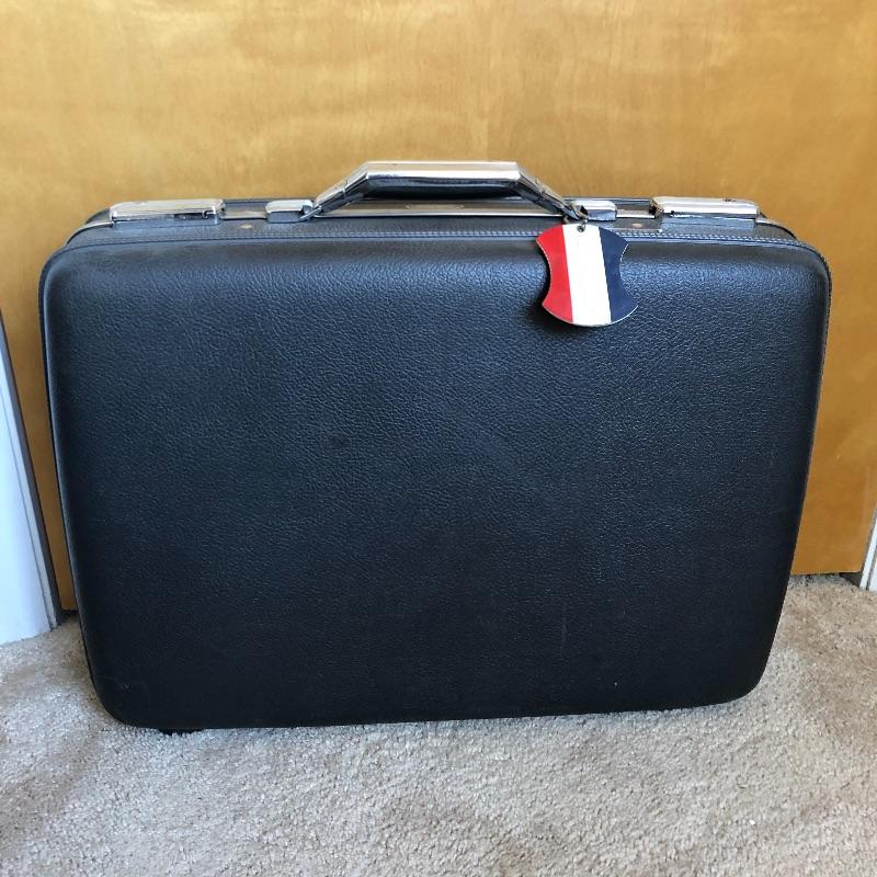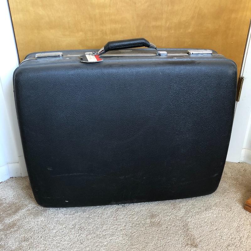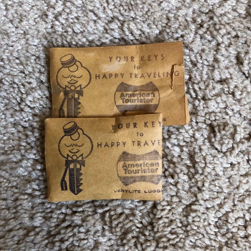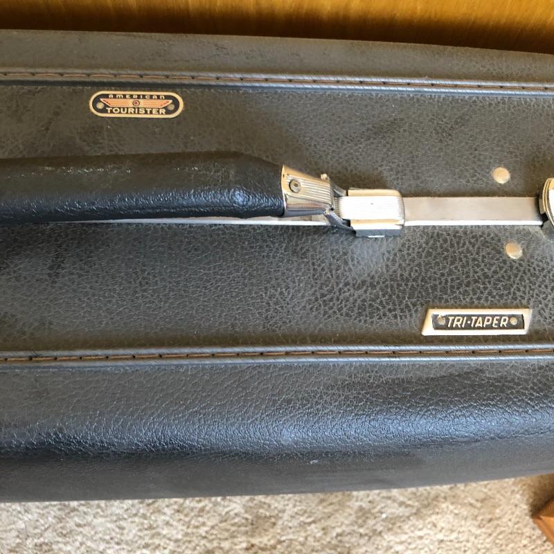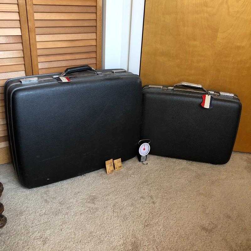 Look stylish with this vintage pair of American Tourister suitcases. Lot includes two matching American Tourister suitcases with keys and a scale. Largest suitcase has two small tears on separator inside case. Largest case measures 8” x 24” x 20”.