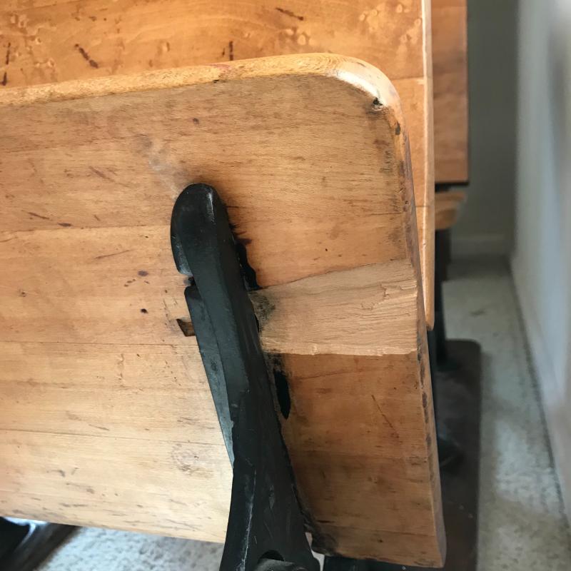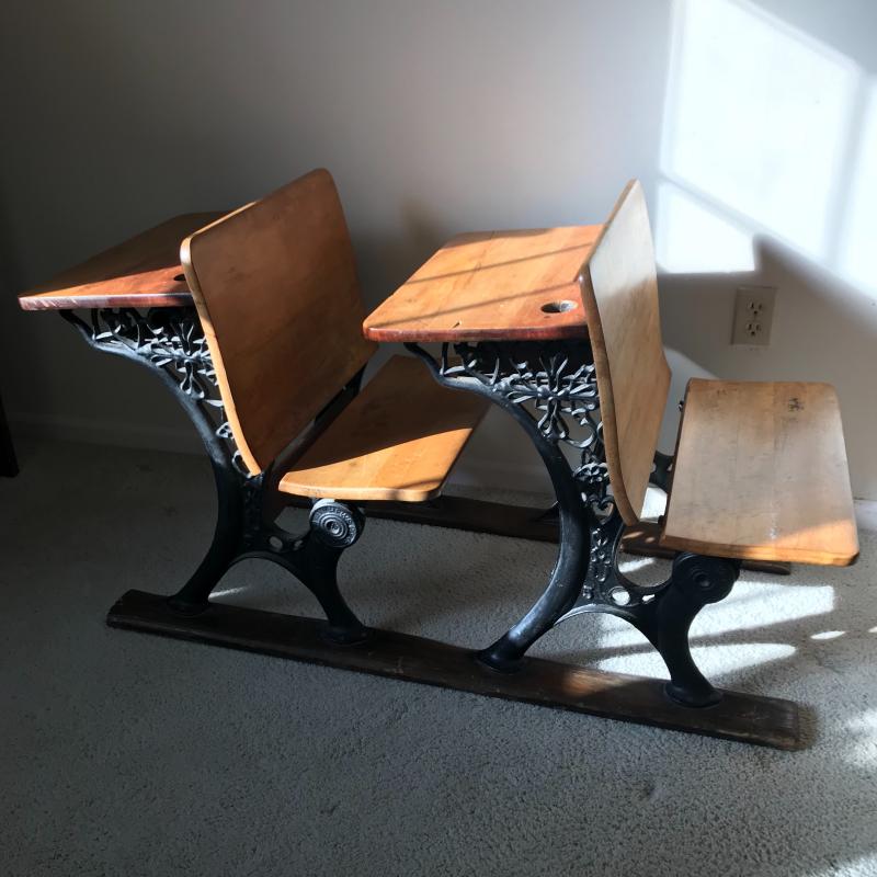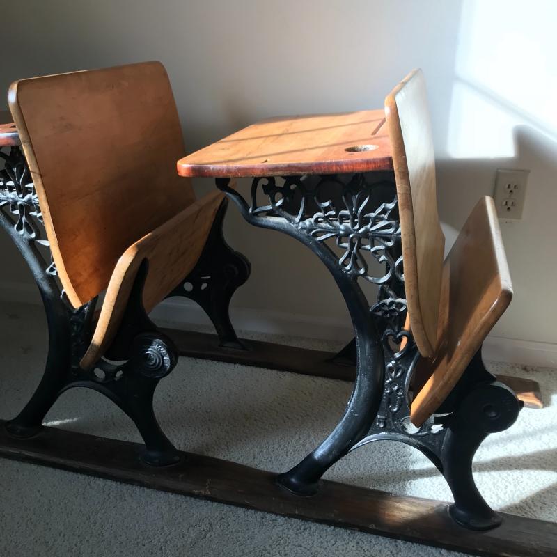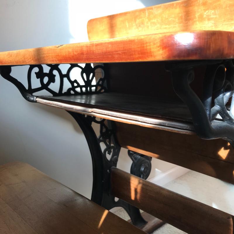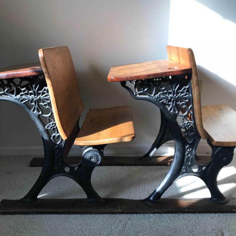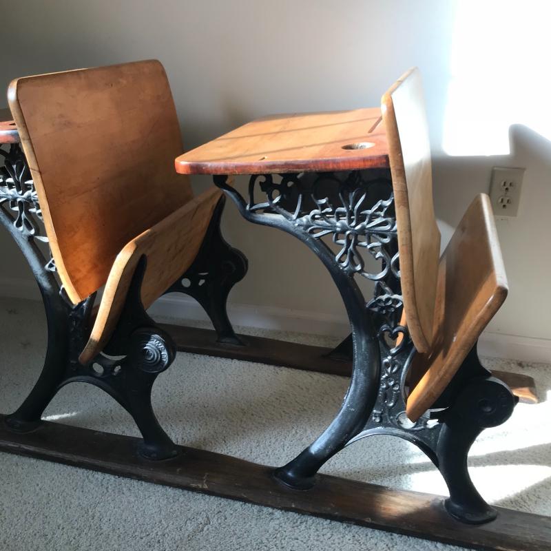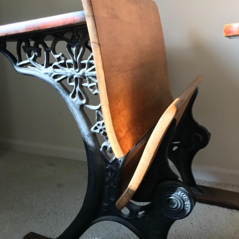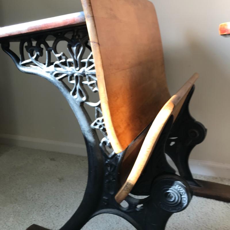 Beautiful Design in these Antique wood and iron school desks. Marked “Andrews Co Chicago” on Iron. Wooden Seats swivel up. Both seats are attached to a wooden base that keeps them together. One seat has broken piece where it is attached. It lays on top of metal rather than secured. Still swivels up without a problem. See photos. 45”l x 20.5”w x 27”h. No shipping. Local pick up only in Asheville, NC