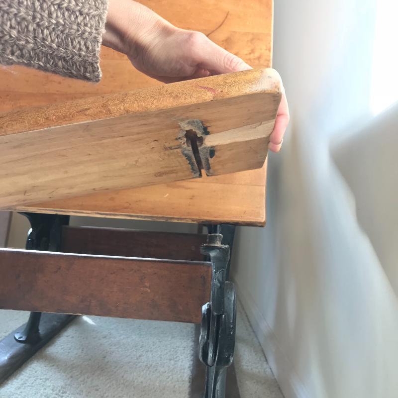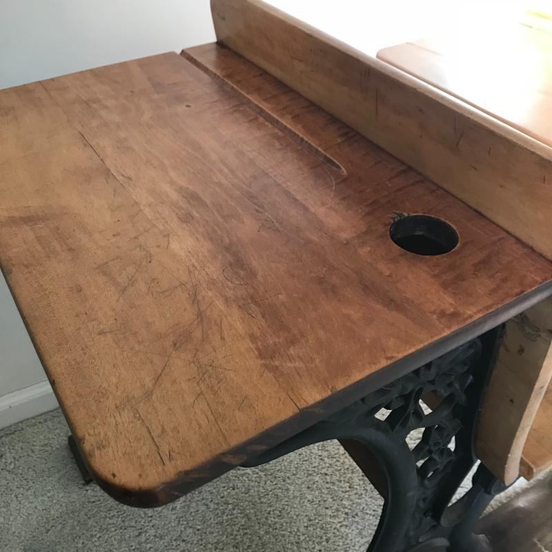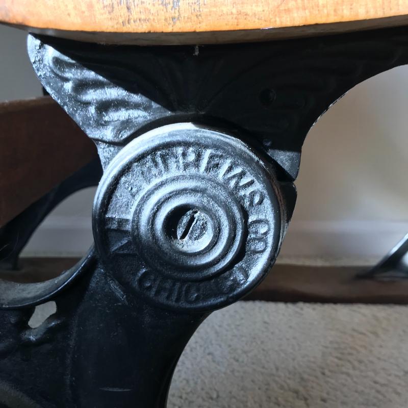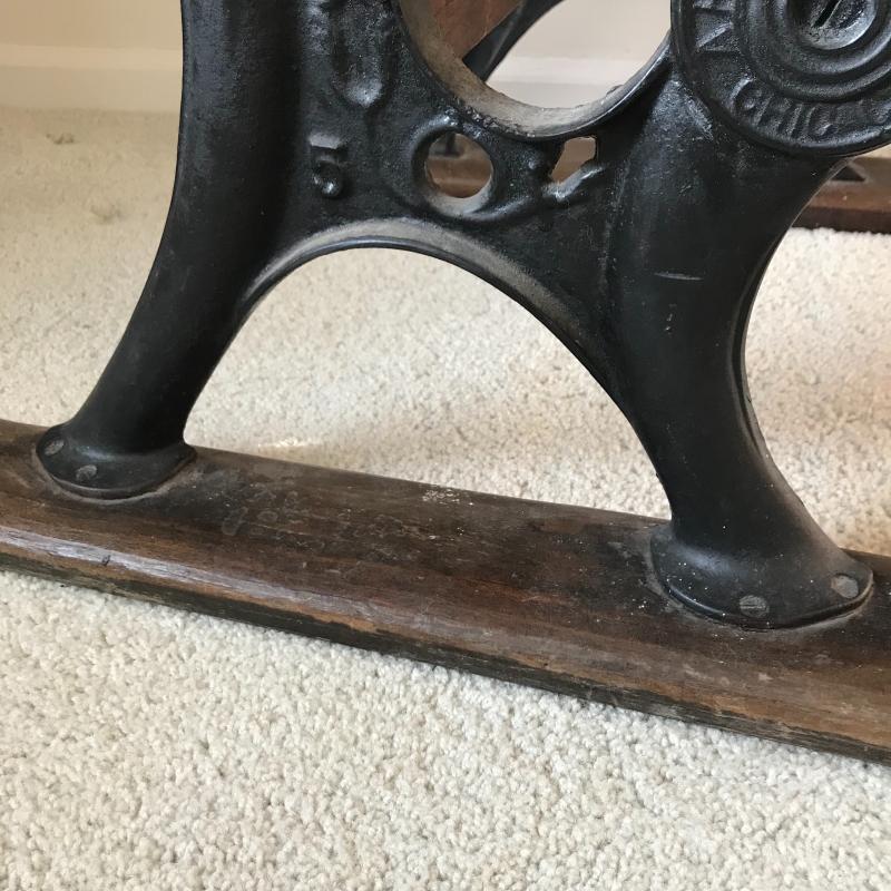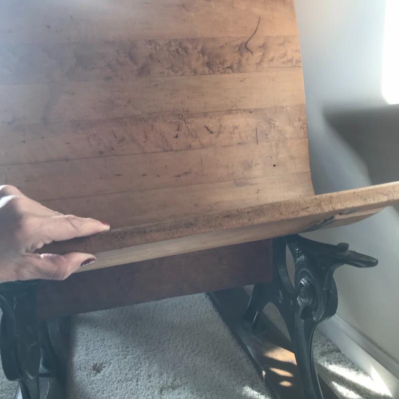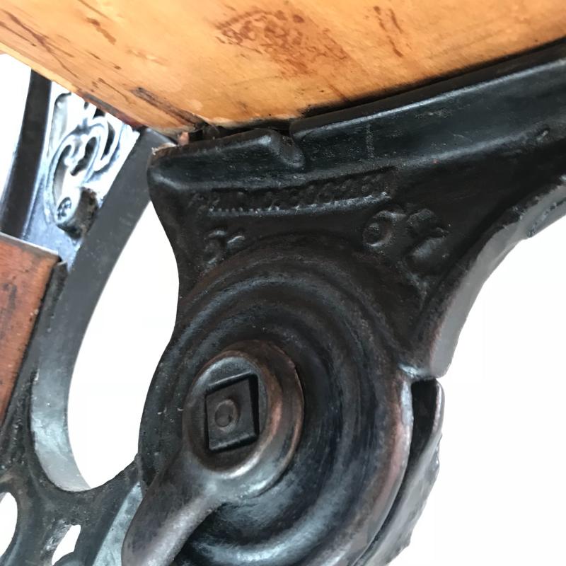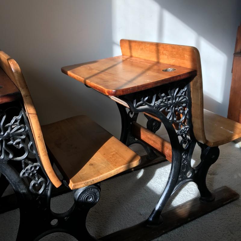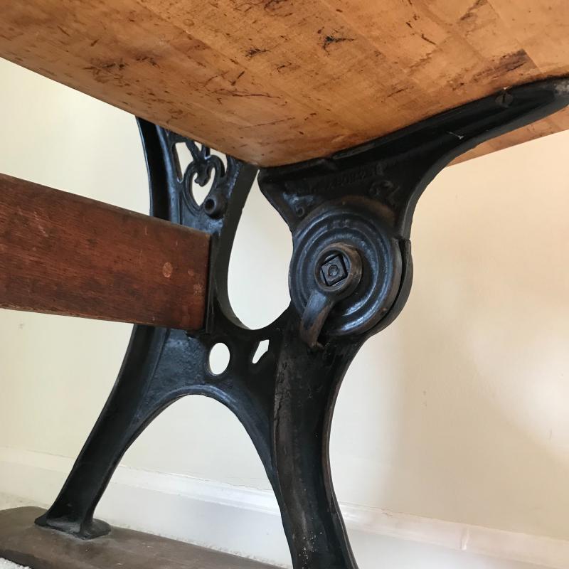 Beautiful Design in these Antique wood and iron school desks. Marked “Andrews Co Chicago” on Iron. Wooden Seats swivel up. Both seats are attached to a wooden base that keeps them together. One seat has broken piece where it is attached. It lays on top of metal rather than secured. Still swivels up without a problem. See photos. 45”l x 20.5”w x 27”h. No shipping. Local pick up only in Asheville, NC