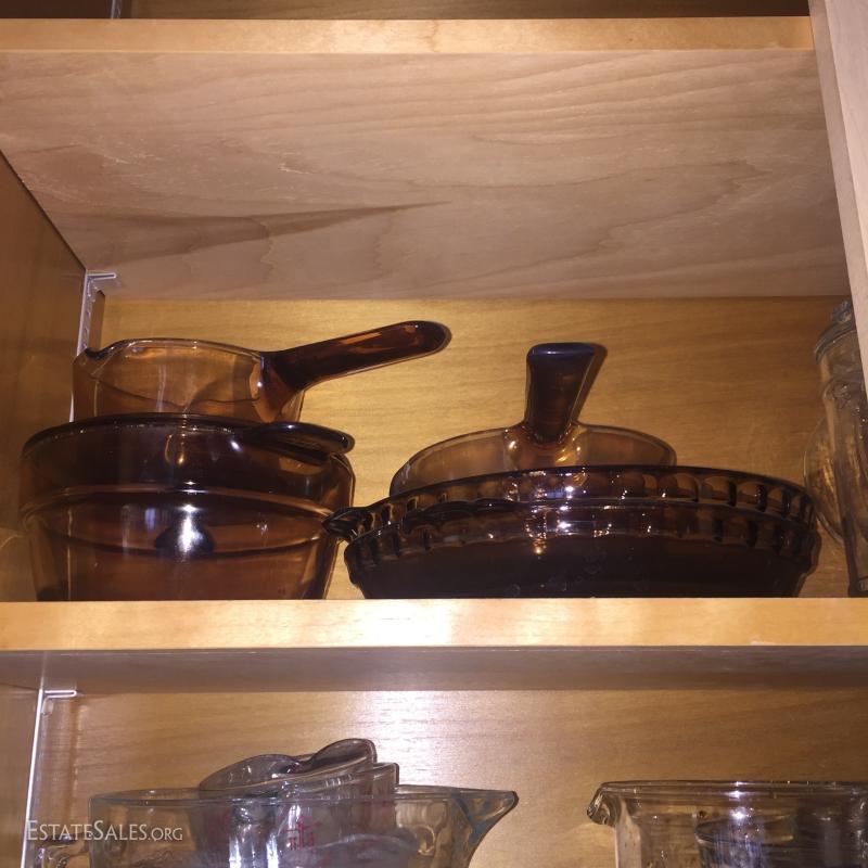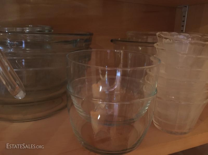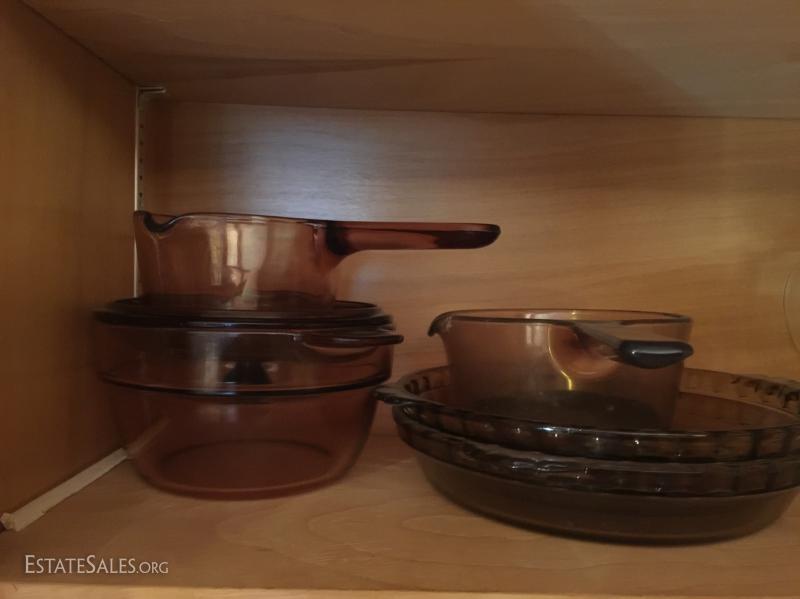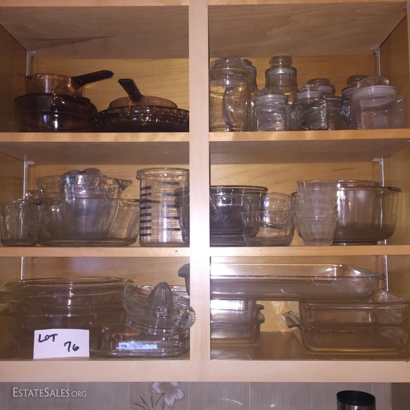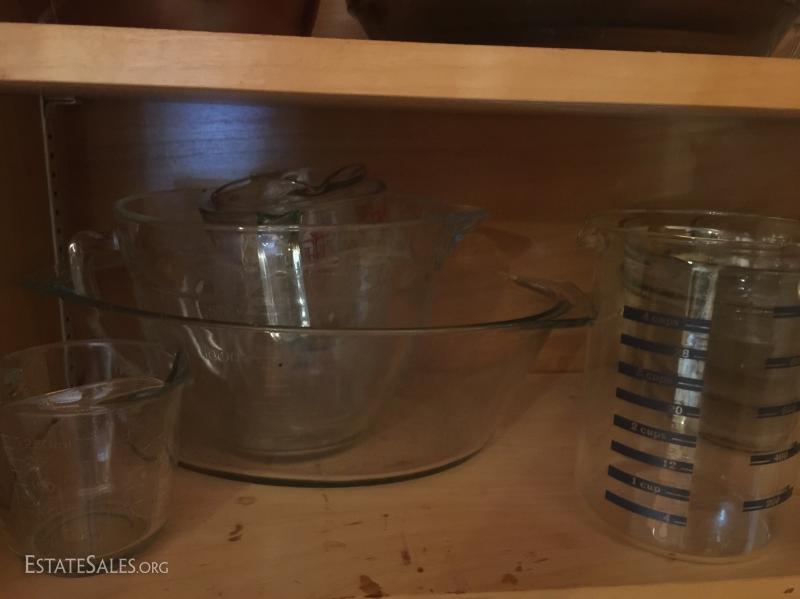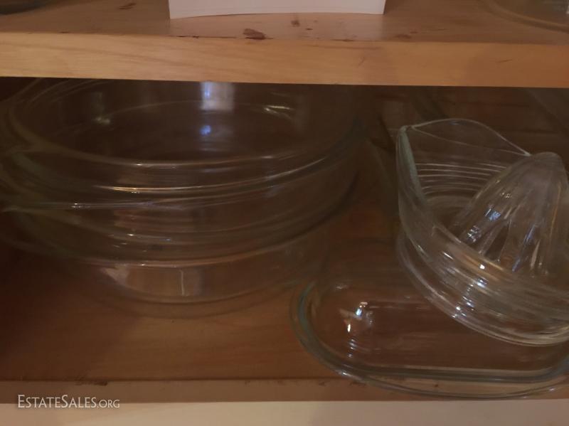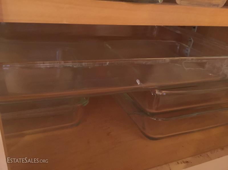 Lot includes: 5 cranberry pieces by Pyrex; 9 misc canisters; 25+ random baking dishes; bowls, measuring cups etc