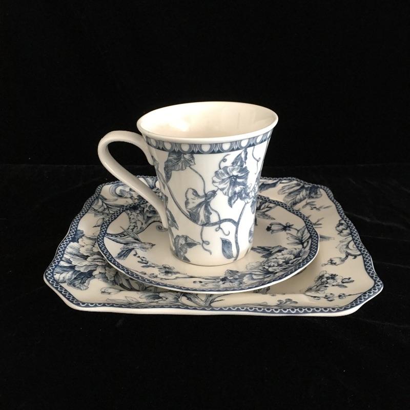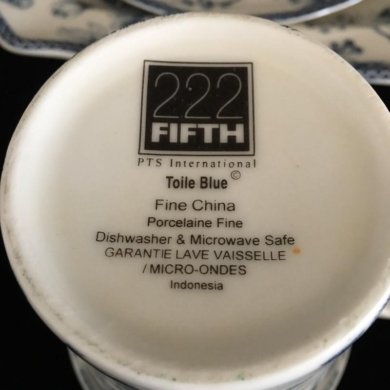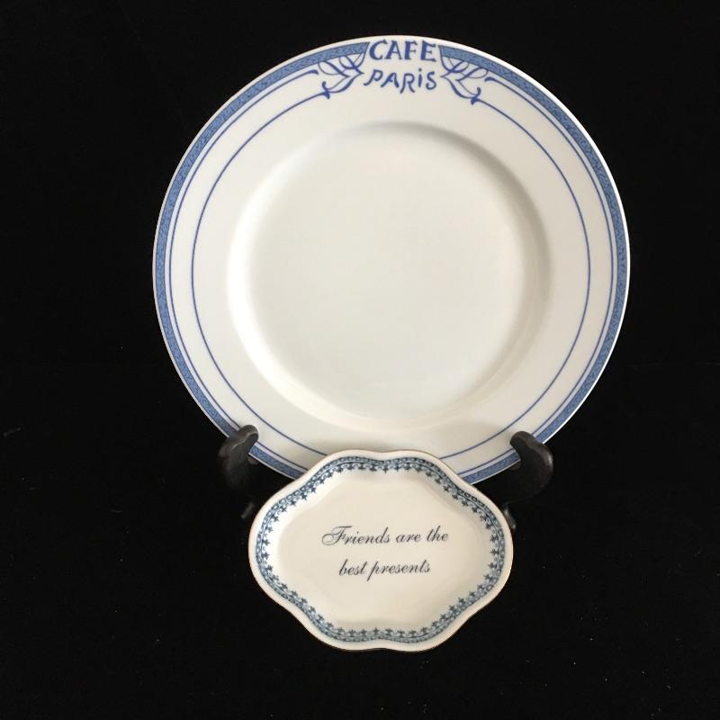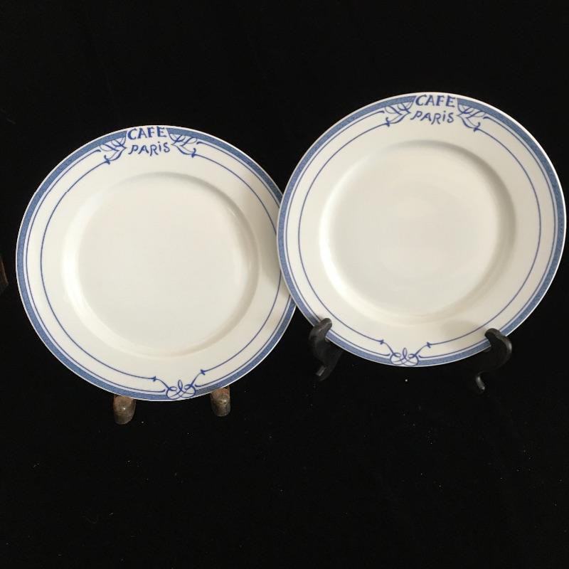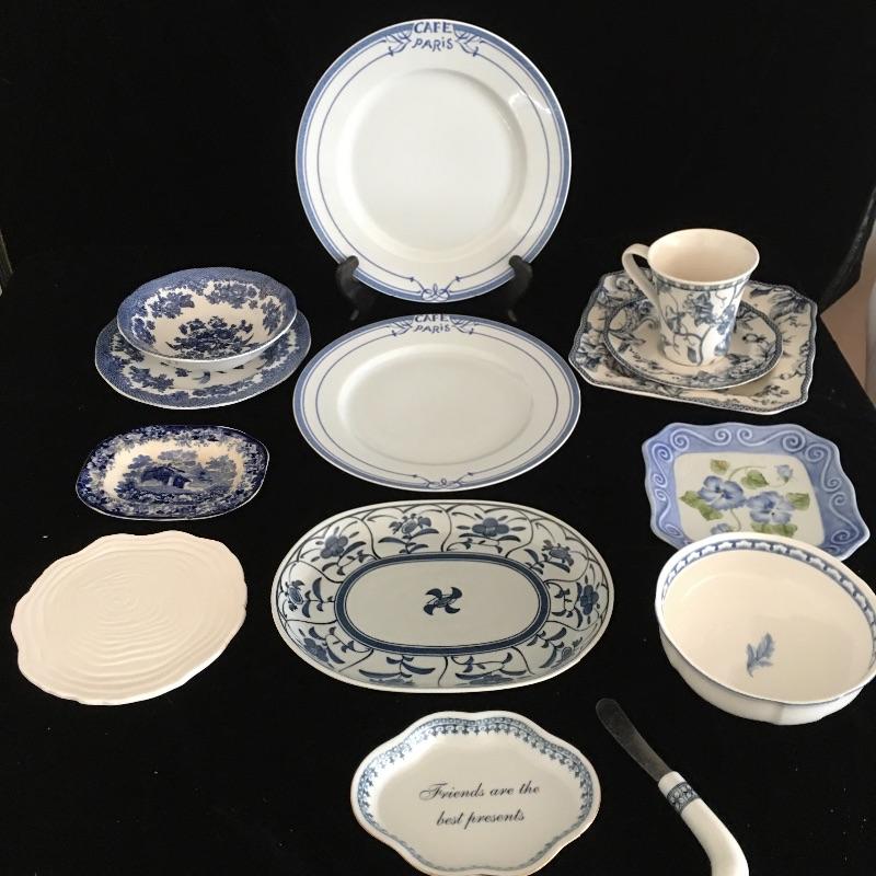 Blue and white dishware includes a pair of Cafe Paris plates, matching bowl and plate, matching cup, saucer and plate and a variety of blue and white dishes. Largest plate measures 10.25”.