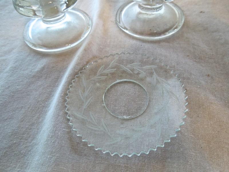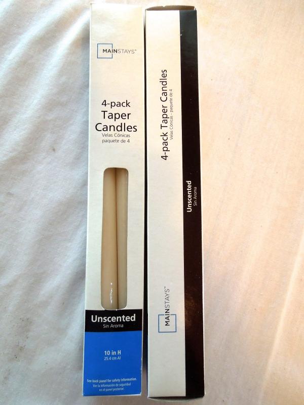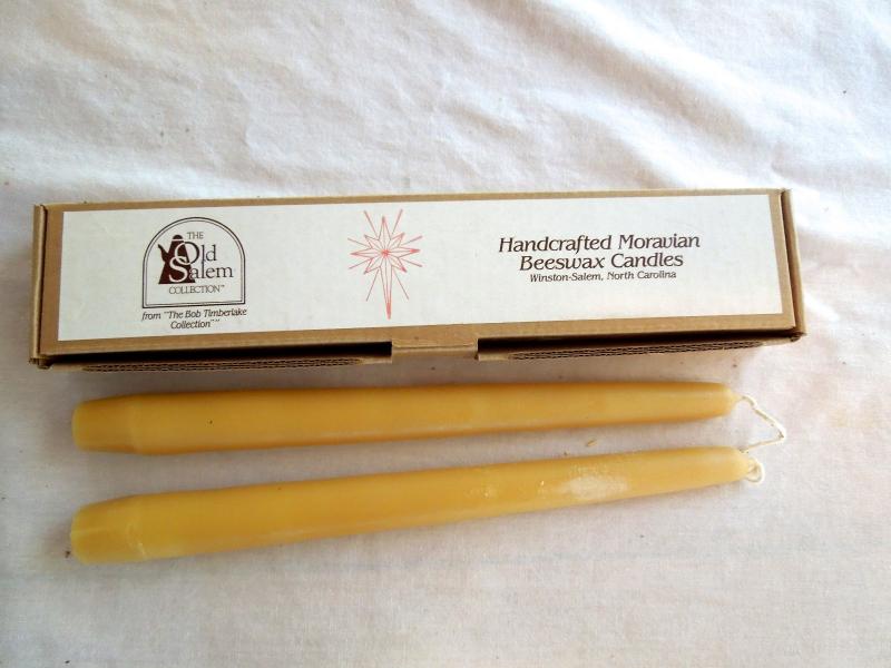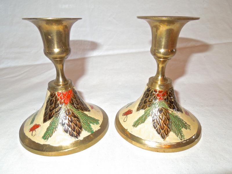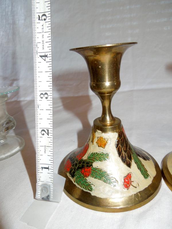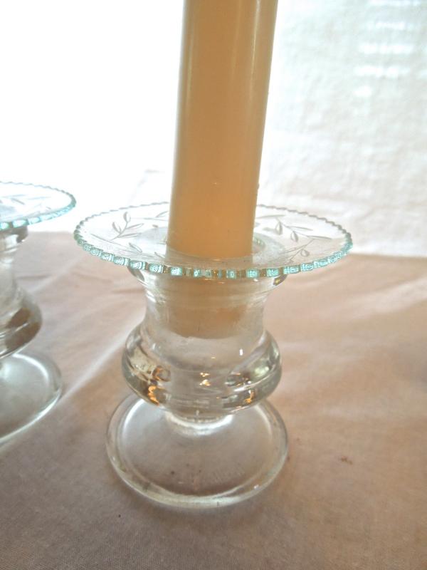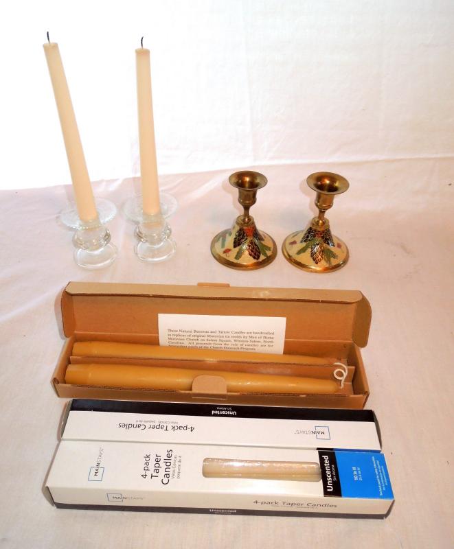 Pair of short clear glass candle holders with candles and additional pair of antique etched glass drip protectors; 8 taperes white candles in boxes; 2 beeswax tapers; and a pair of enameled brass short candle holders with fruit motif.