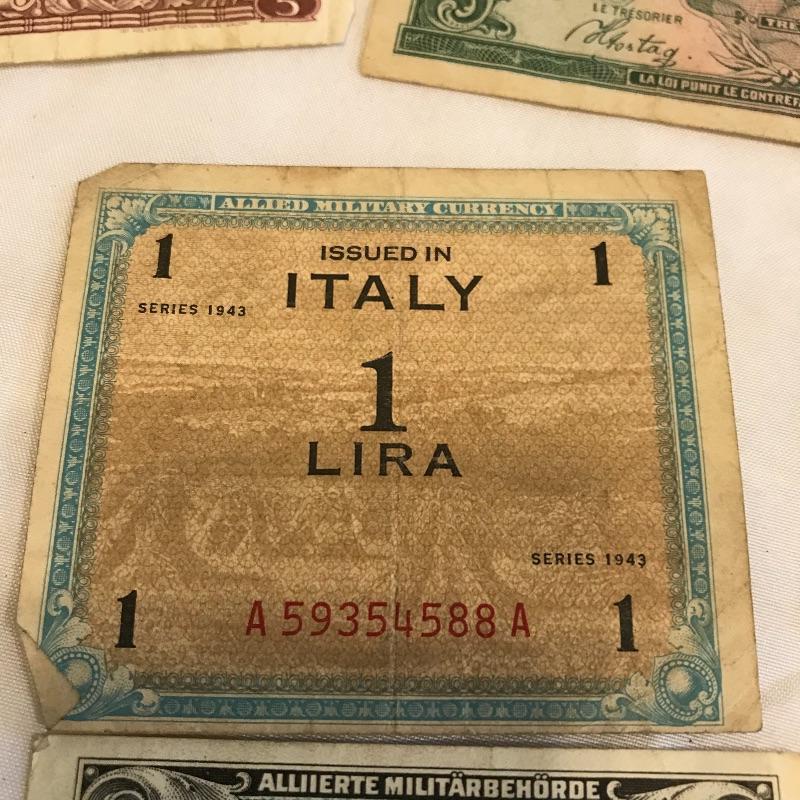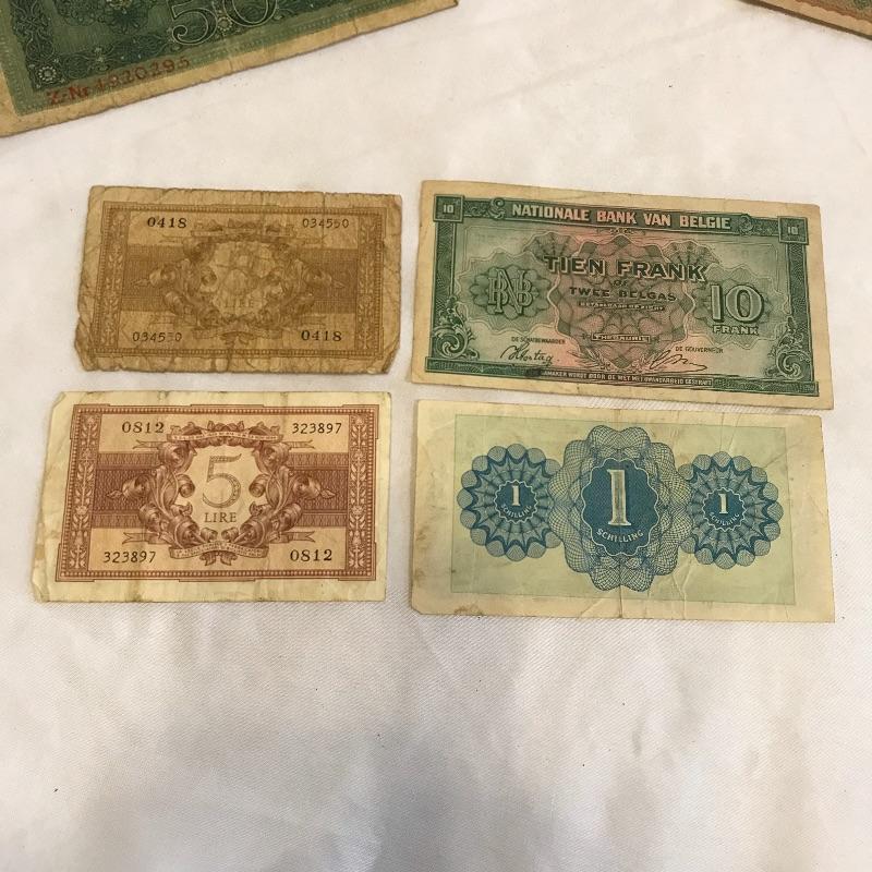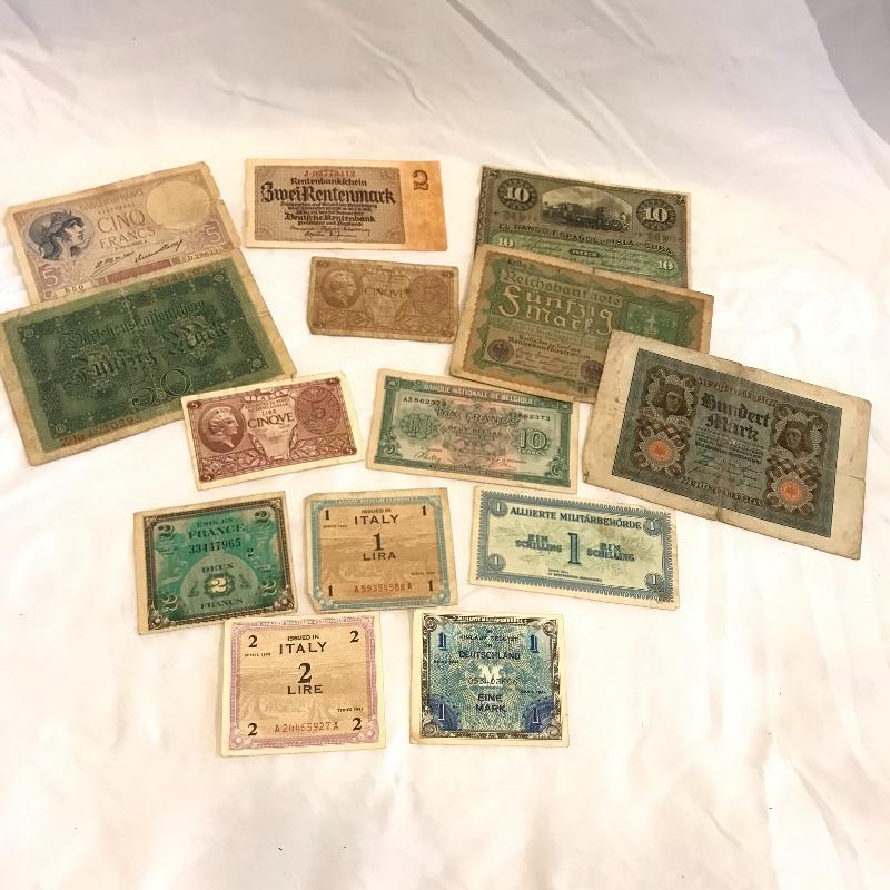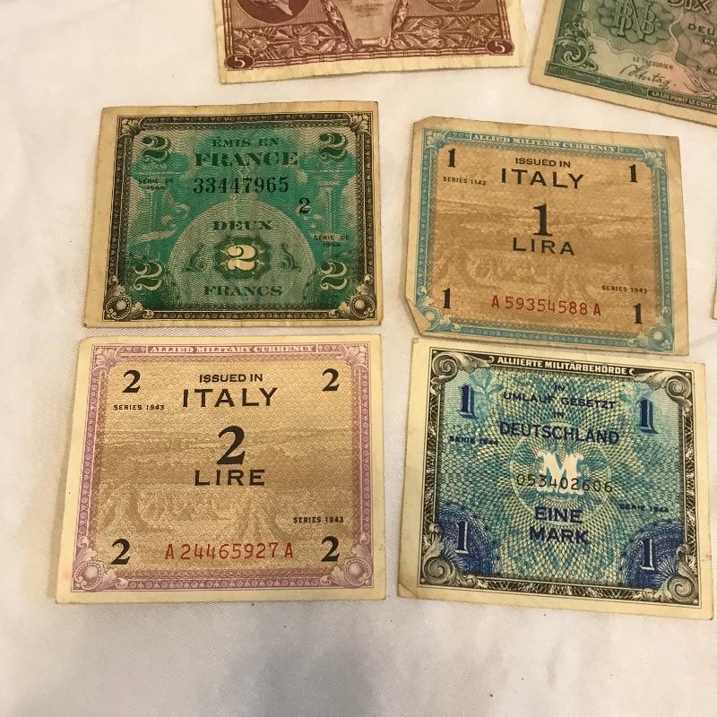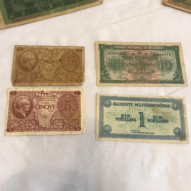 We have a fascinating collection of foreign notes full of history. Four notes appear to be military currency from Germany, Italy and France during WWII. These notes are in great condition for their age with some minor folding along the corners. Lot also features two 1944 5 Lire in varying conditions, a nice 1 Schilling from 1944 and six more notes of various condition from Europe and Cuba. See images. Shipping available. * Please note, there are no refunds or returns for items purchased at auction. Please be sure to review carefully prior to bidding. We can not verify or authenticate these notes.