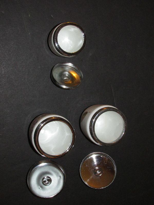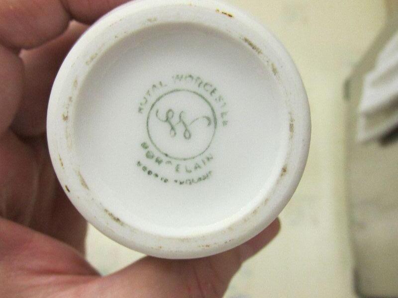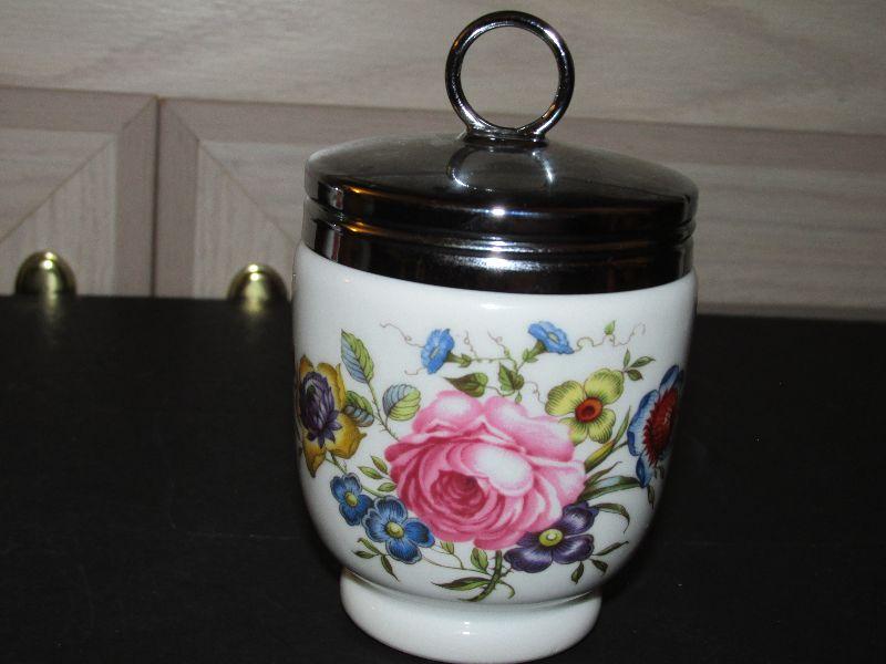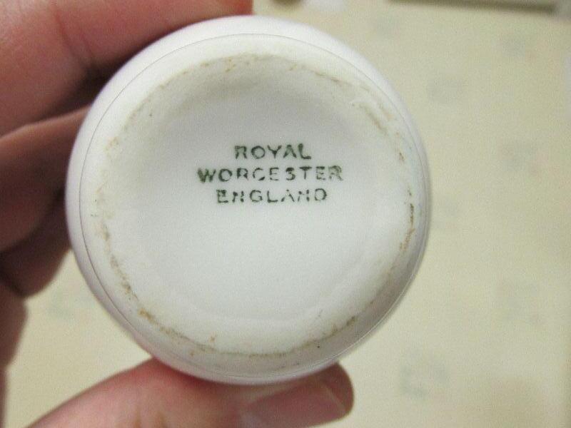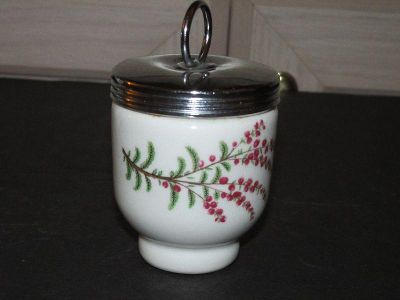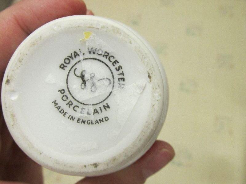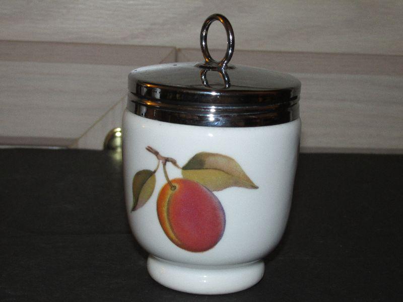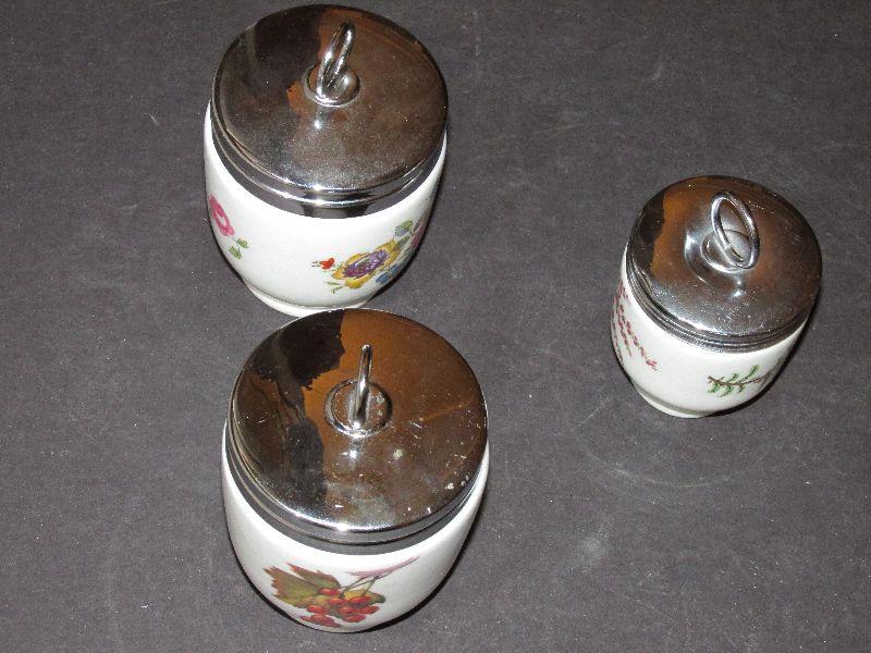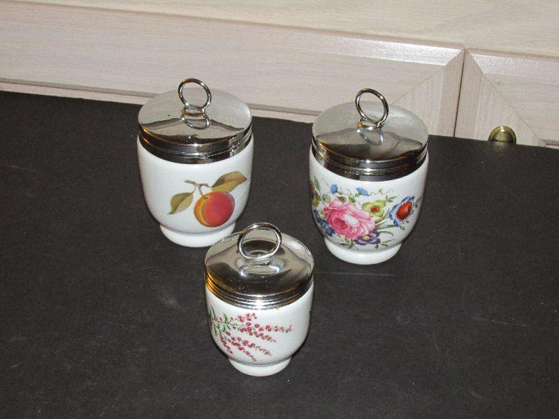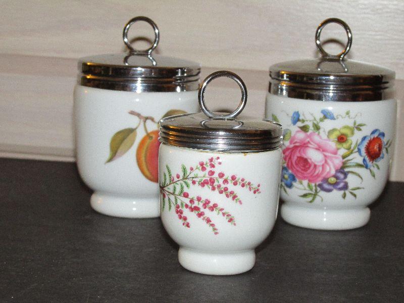 Collection of 3 Royal Worcester Egg Coddlers. One is a Type 8- Bournemouth King Size. The small one is Type 7- Dunrobin Standard size. The other is a Type 9- Red Currant, Plum, and Leaf King Size. The Type 9 has a chip on the bottom rim shown in photo. The other two have no chips or cracks.