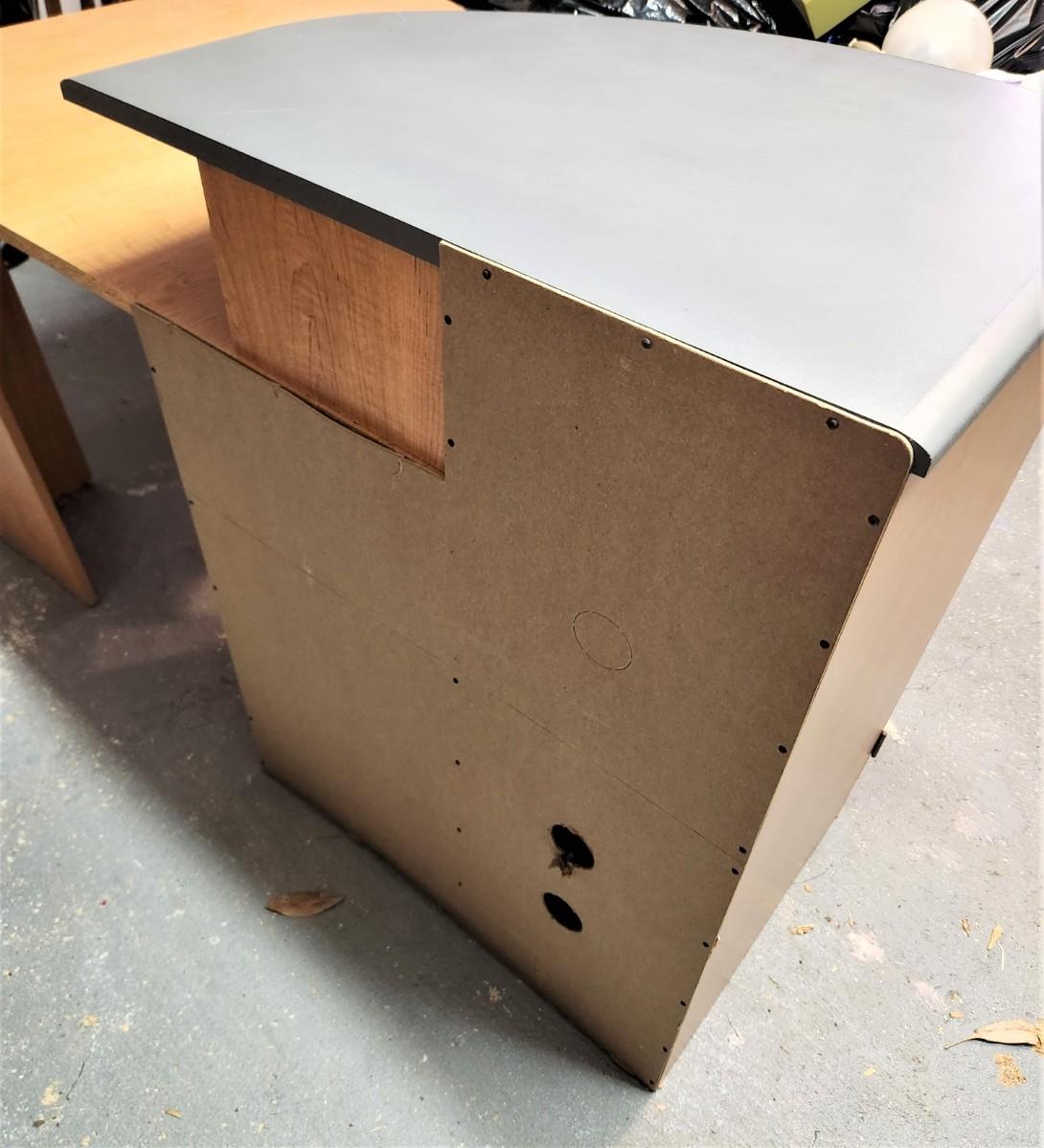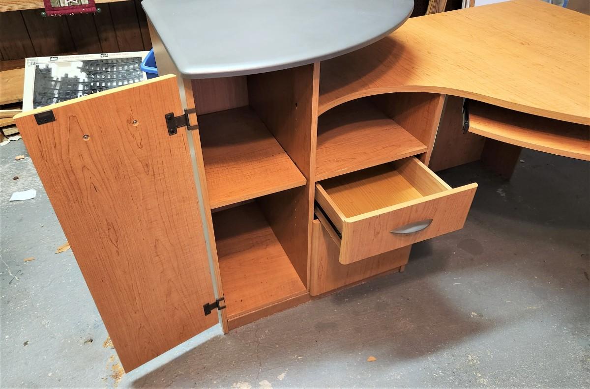 Perfect computer desk for home office or teenager's room - 2 drawers, 1 side cabinet, pull out keyboard rest, finished in front and on the sides - holes for cords. Gently used. 59" across - 38.5" deep, 36" tall at tallest point.