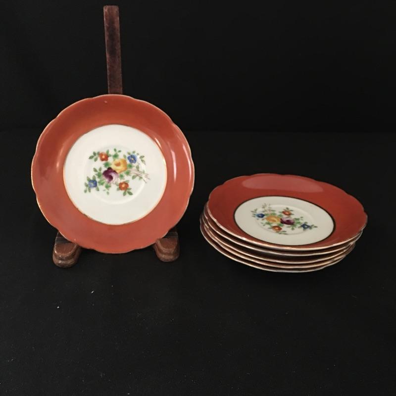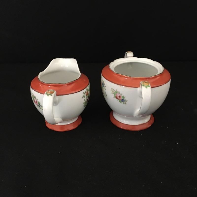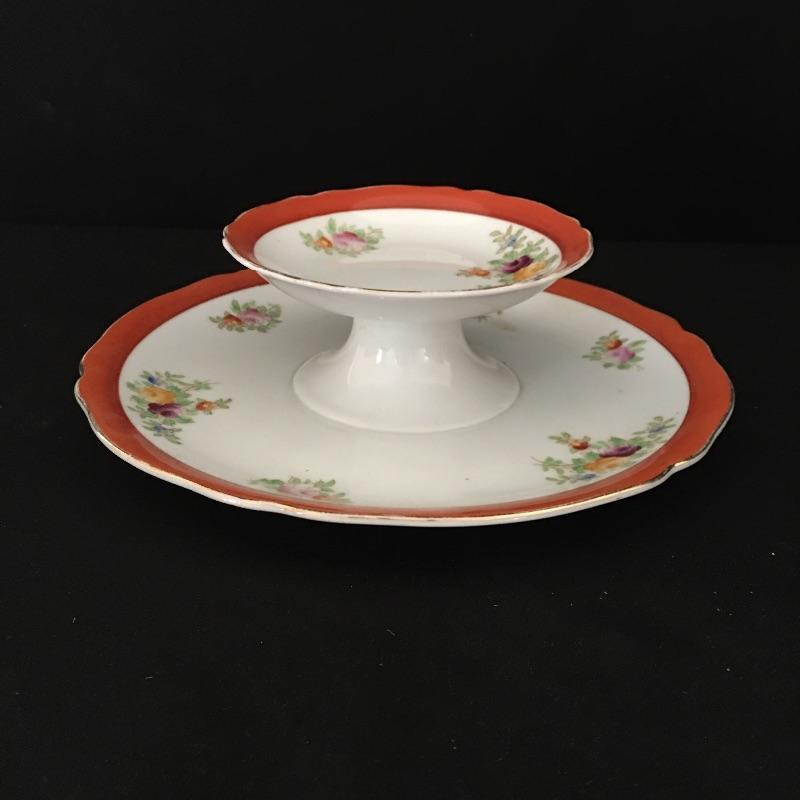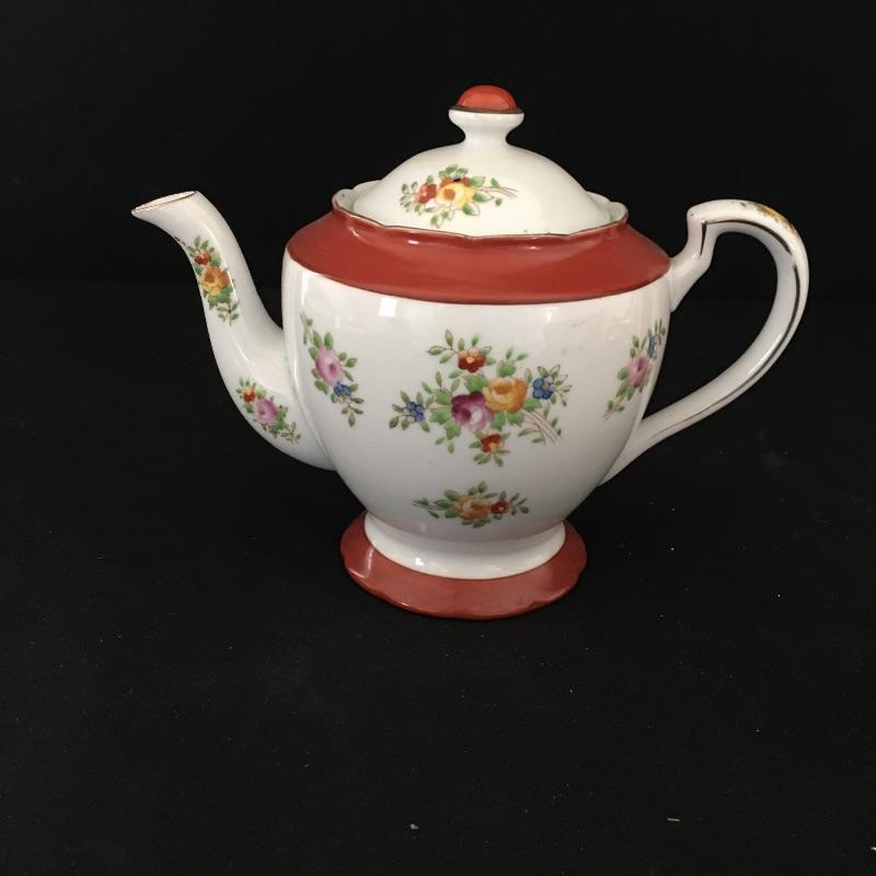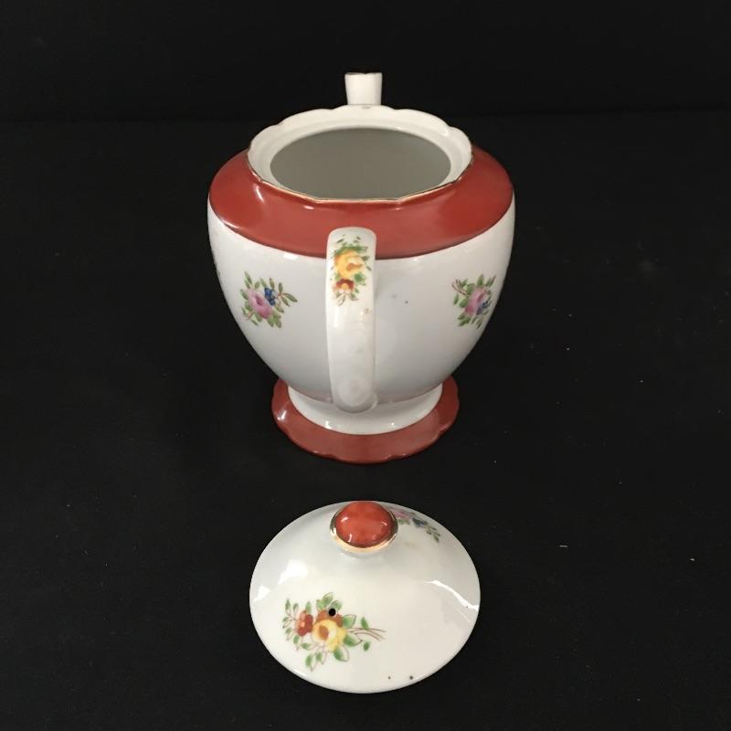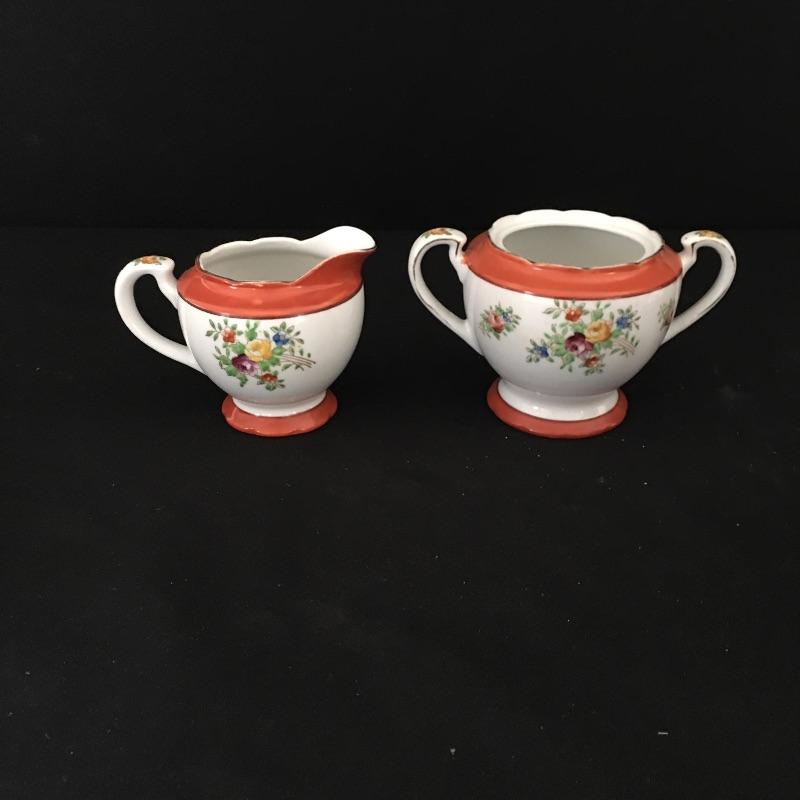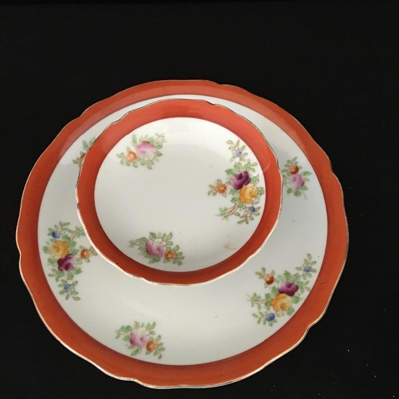 Coronation gold rimmed three piece, six person tea set with tiered tray, teapot and cream and sugar bowl. Sugar bowl is missing top. Have your friends over and enjoy a nice cuppa. Tray measures 9.5”D x 3.5” tall.