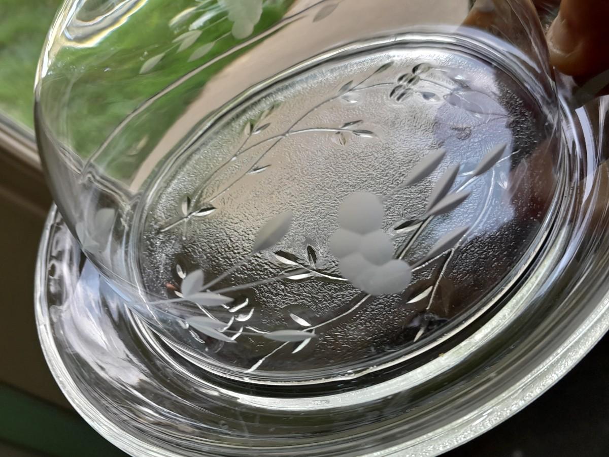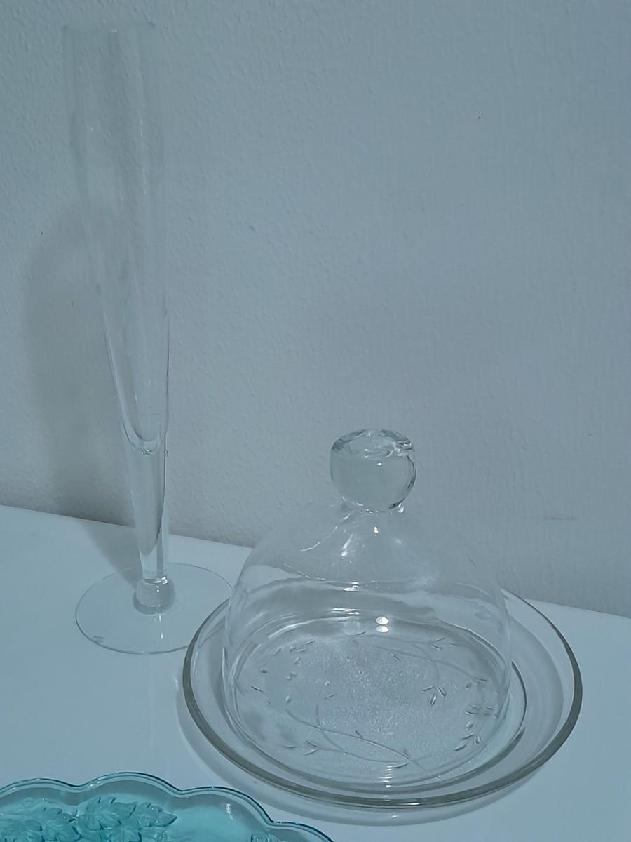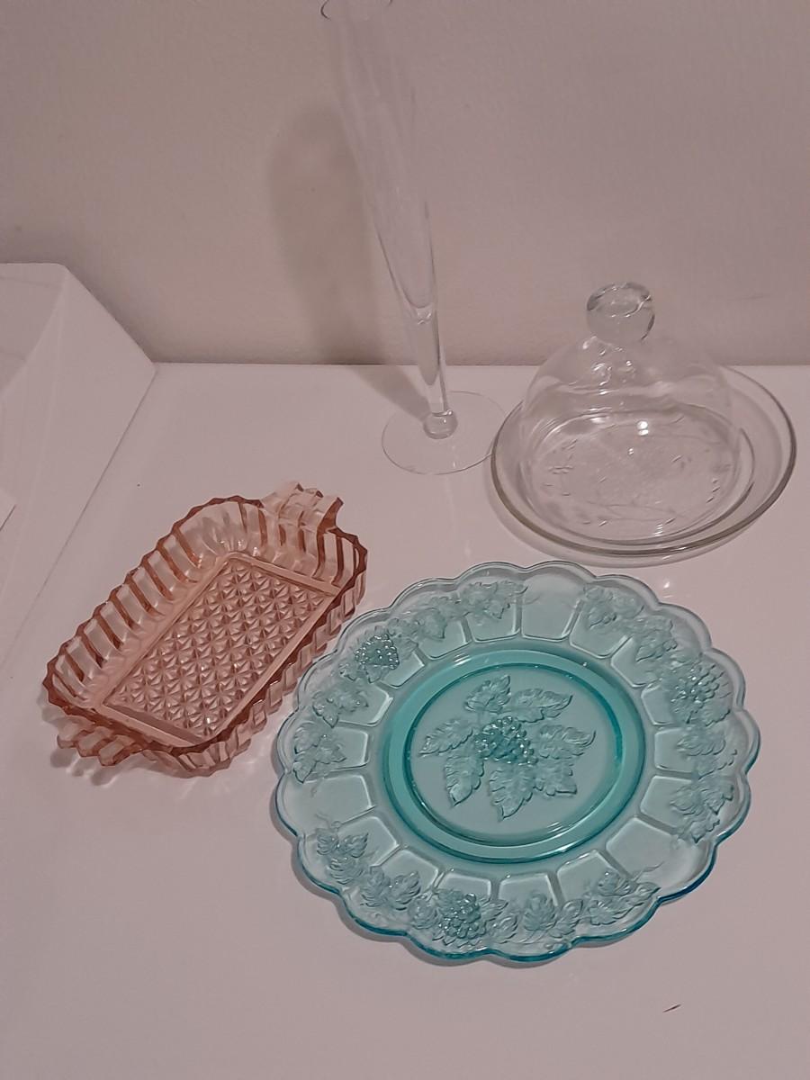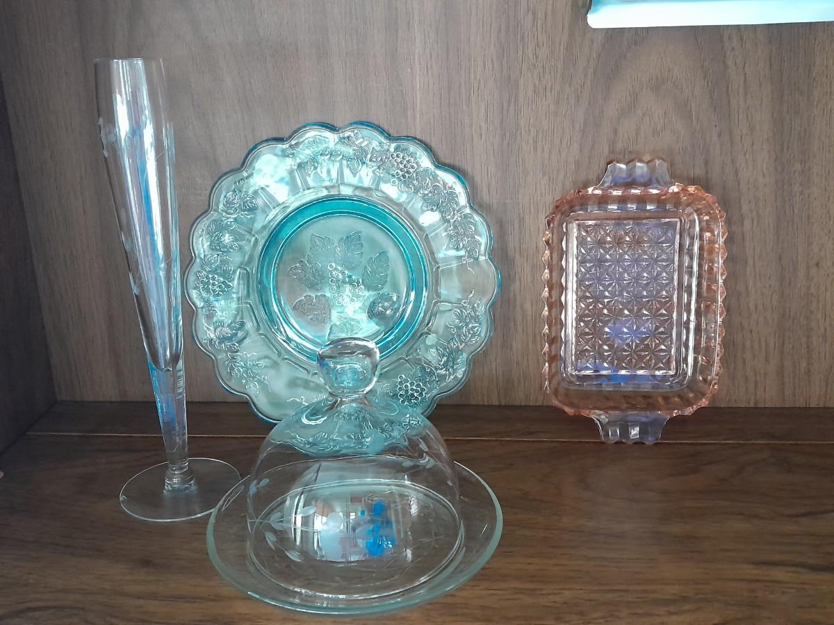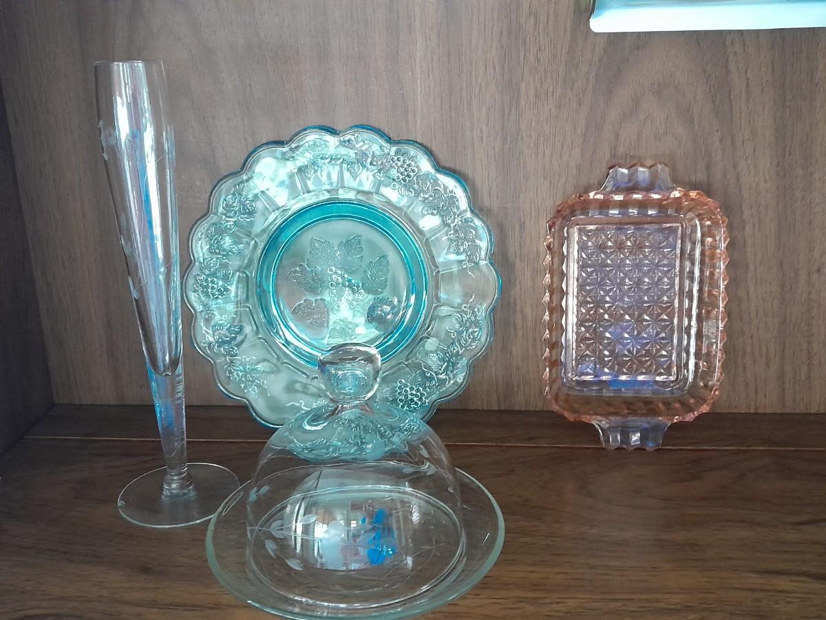 DECORATIVE GLASSWARE LIDDED CHEESE DISH, COLORED GLASSWARE, AND AN ETCHED VASE
