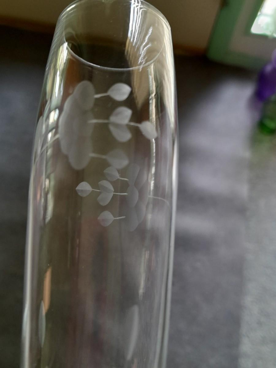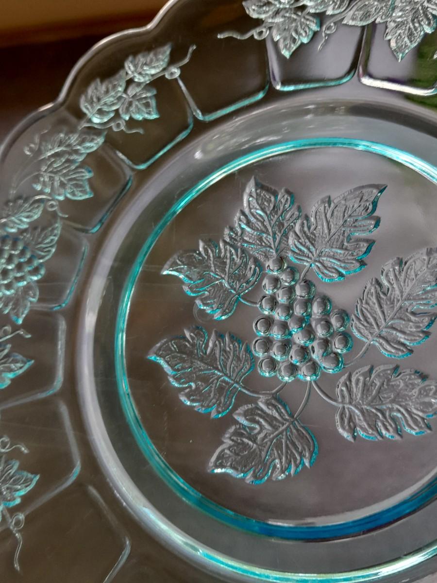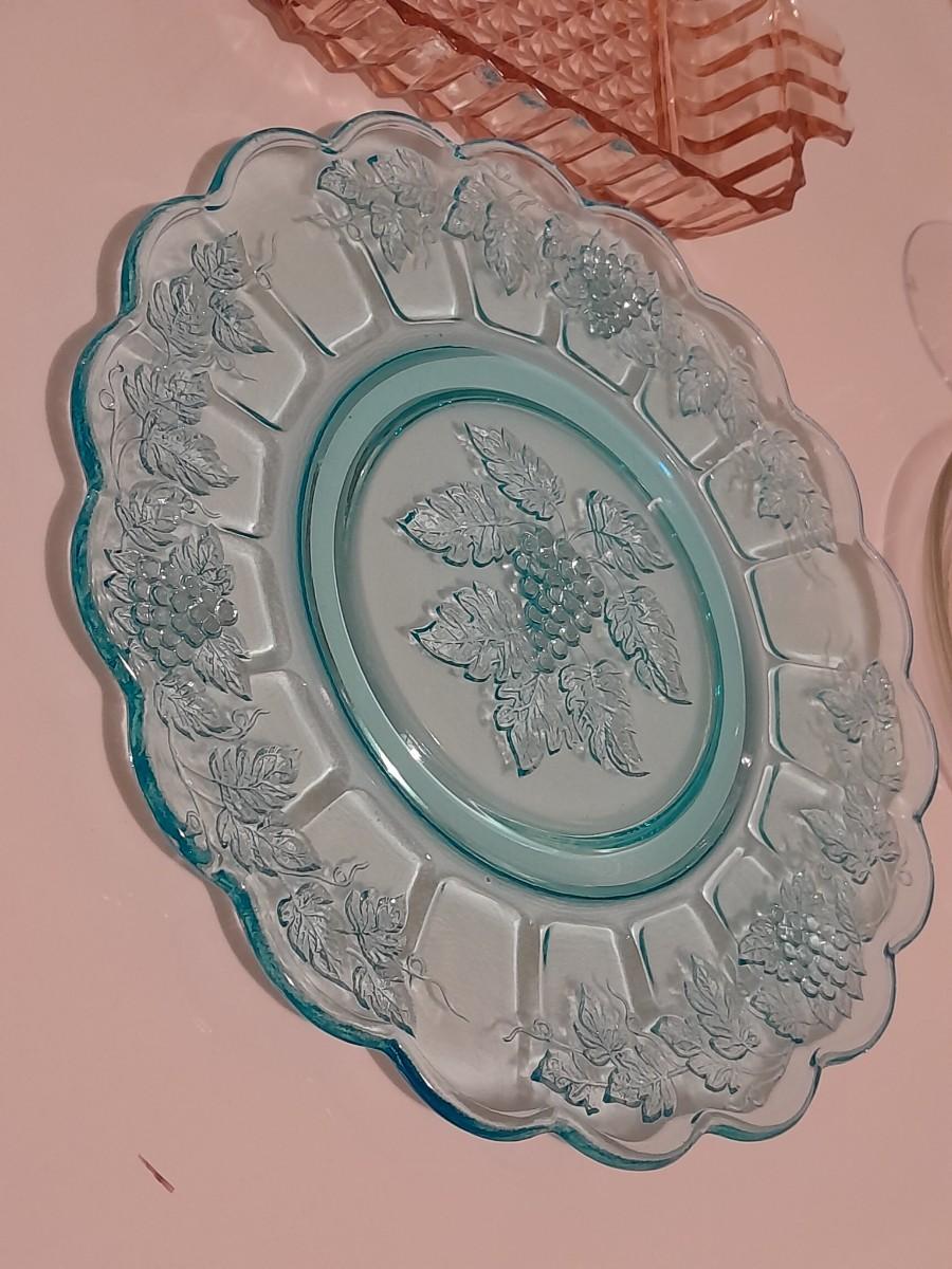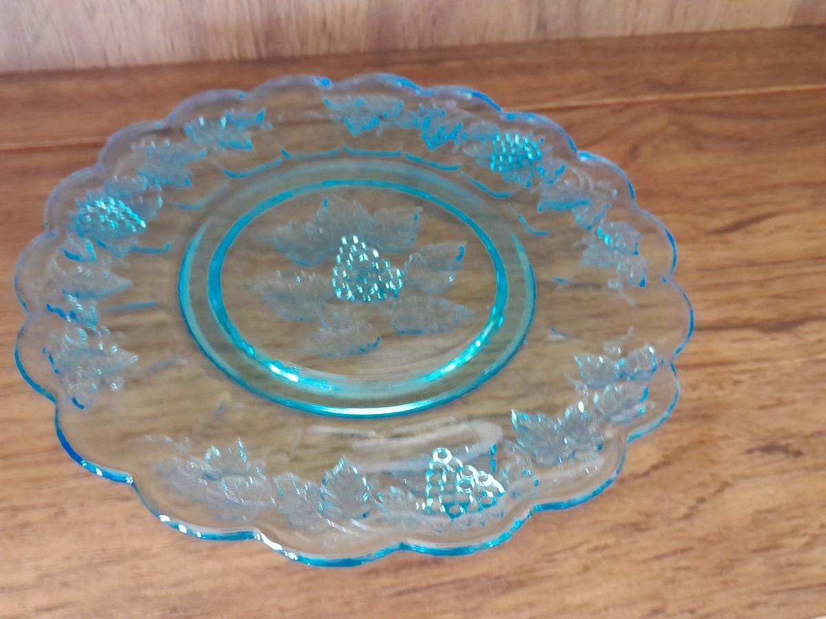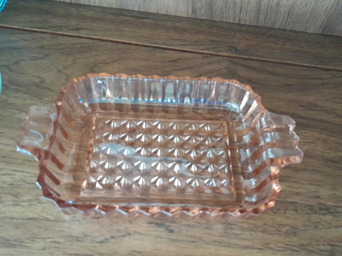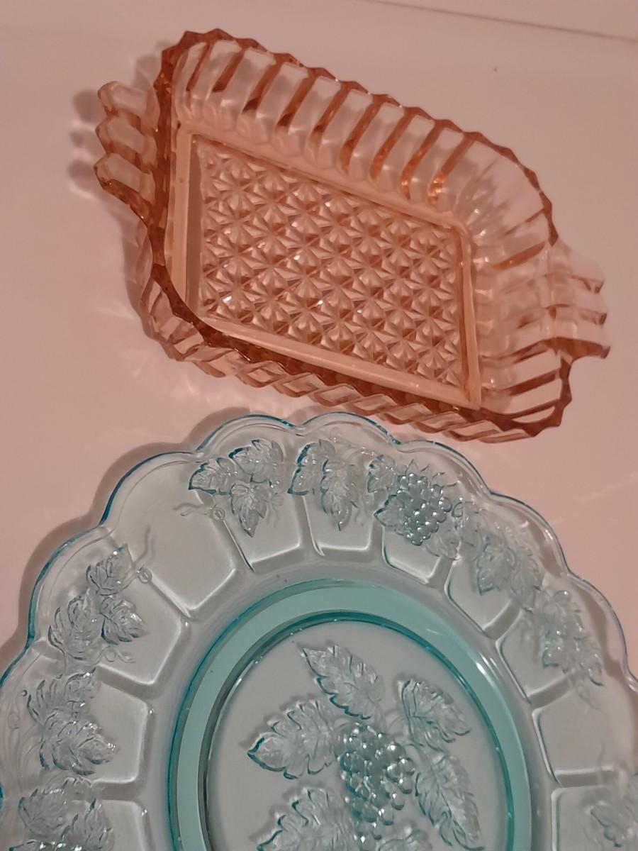 DECORATIVE GLASSWARE LIDDED CHEESE DISH, COLORED GLASSWARE, AND AN ETCHED VASE