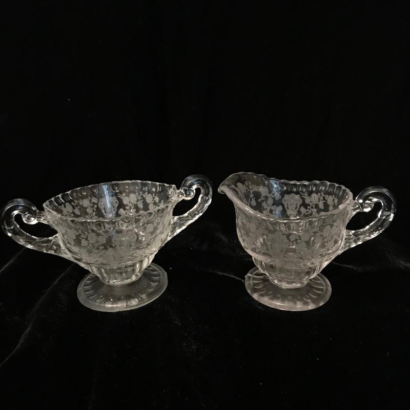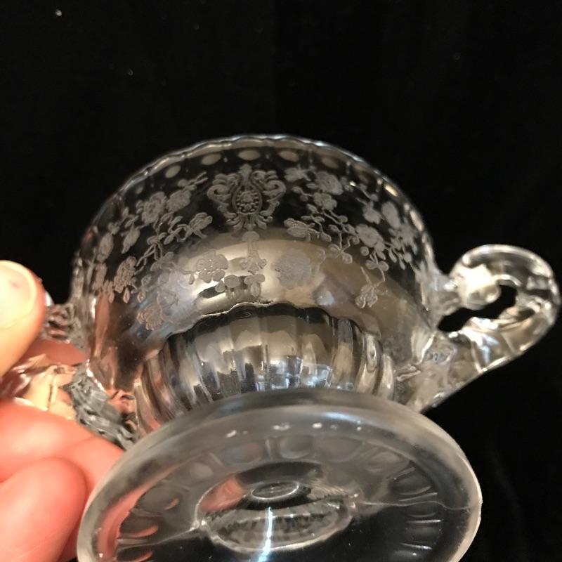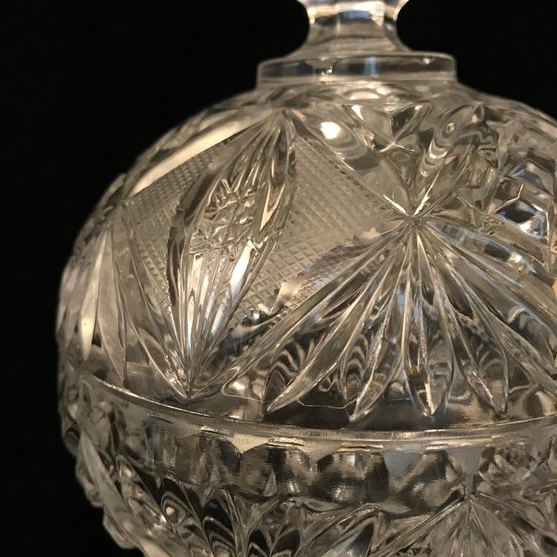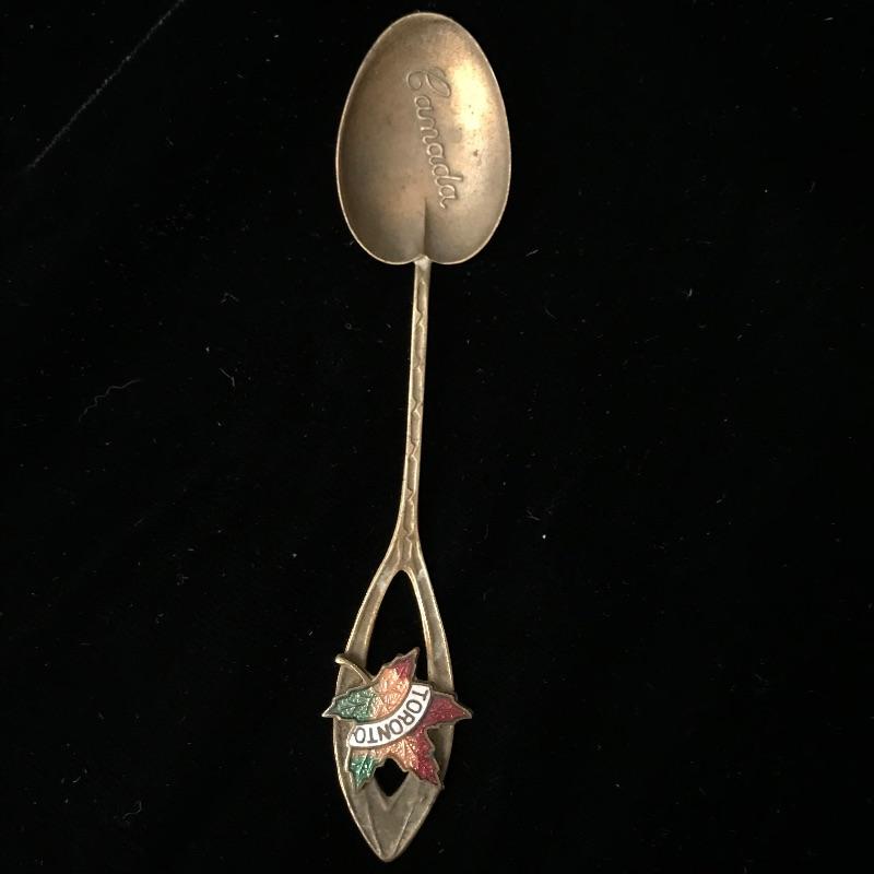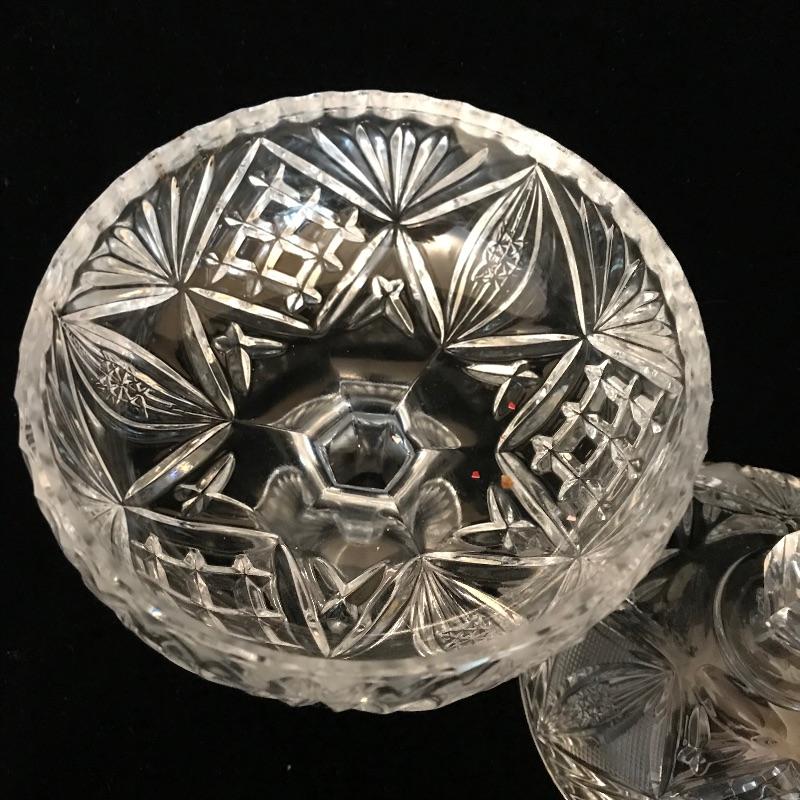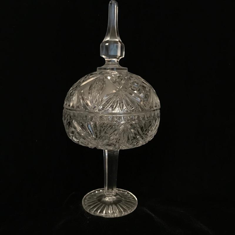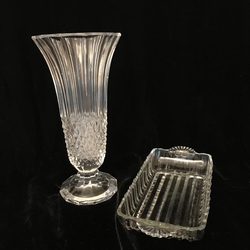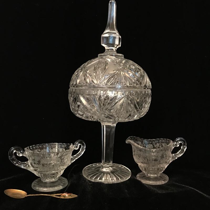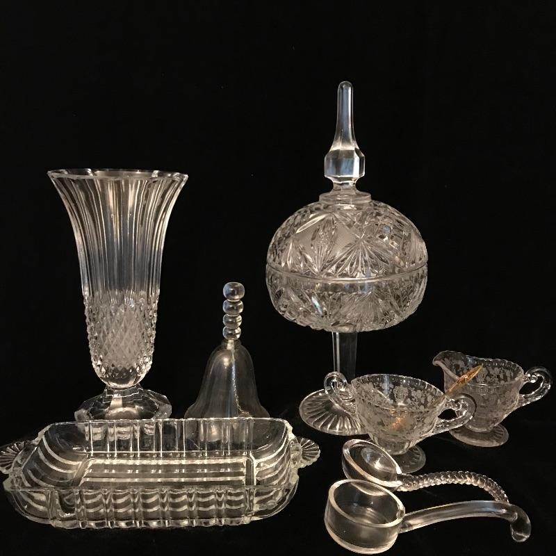 Here’s a few pieces we don’t see very often mixed with everyday necessities. A beautiful lidded candy bowl that could possibly be cut glass and stands about 12” high, a couple of glass serving spoons (one previously had gold accents, but the majority has worn away), a delicate formed/etched sugar and creamer and just in case you needed a little metal Canadian spoon for the sugar bowl, we’ve got you covered there. Lastly, a tall footed vase, a butter style dish and dinner bell. See photos. Shipping available.