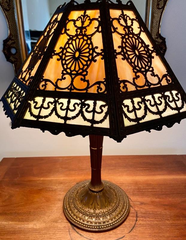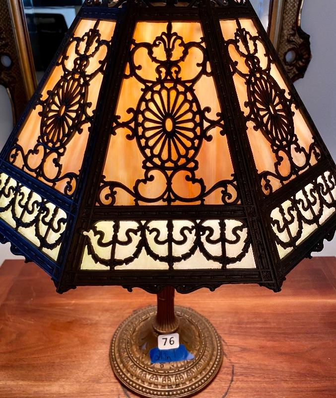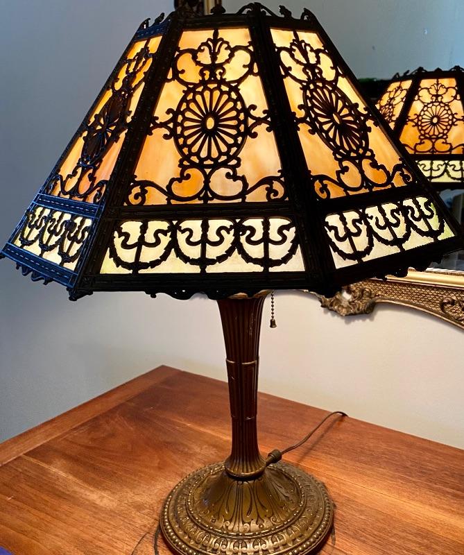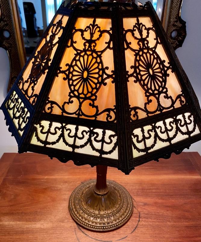 Decorative Edwardian stained glass panel table lamp 17Wx21H. MHW