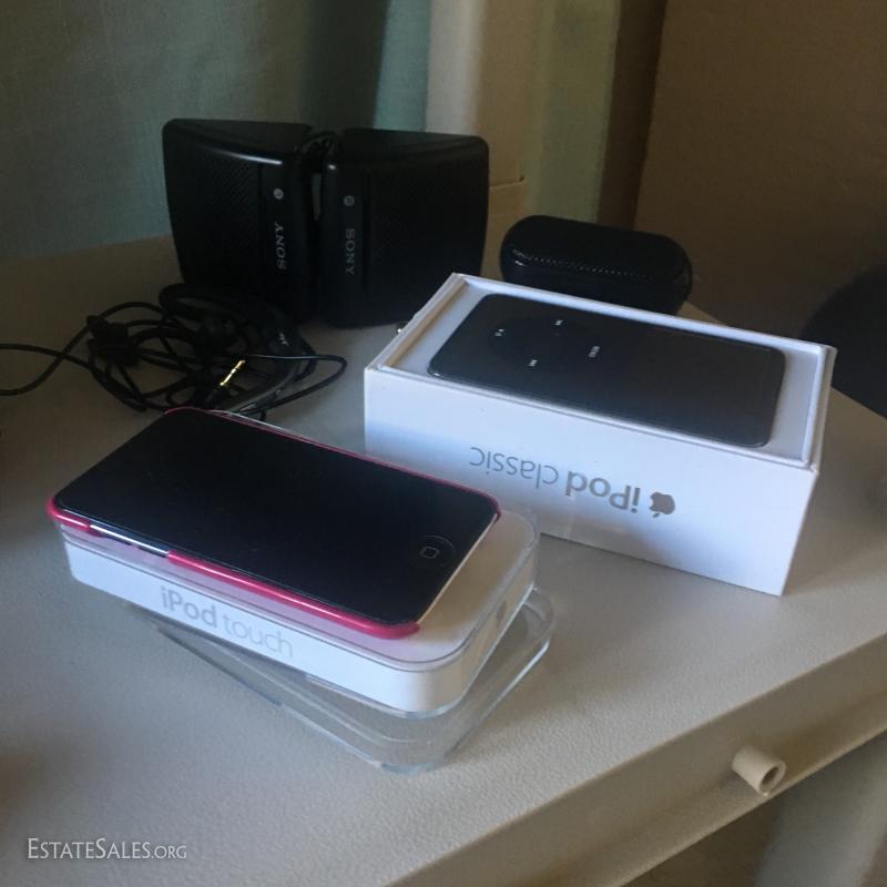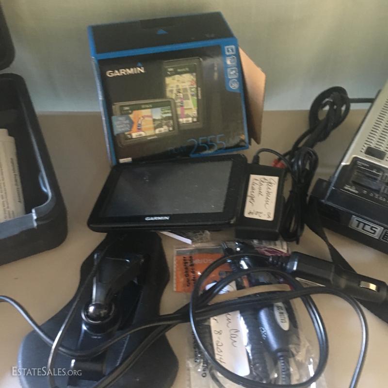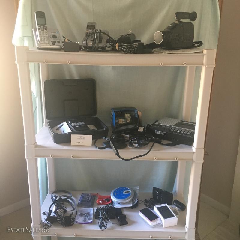 iPod classic (new in box), GE cassette player, Sony speakers, iPod Touch, Nuvi 2555 LMT Garmin, Magnovox EasyCam, Panosonic phone & charger, Moraural earphones, RadioShack mono earphone, Lowrance GlobalNav Sport GPS.