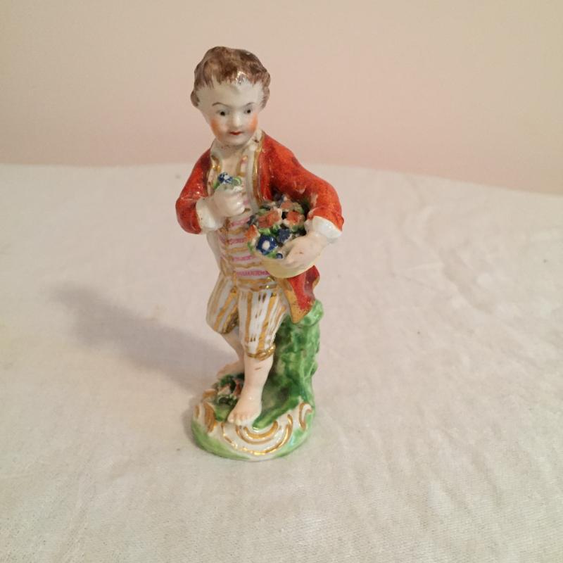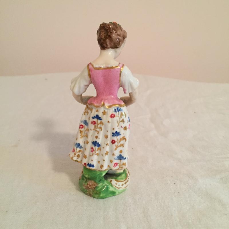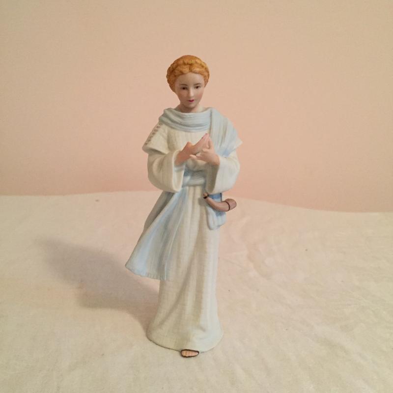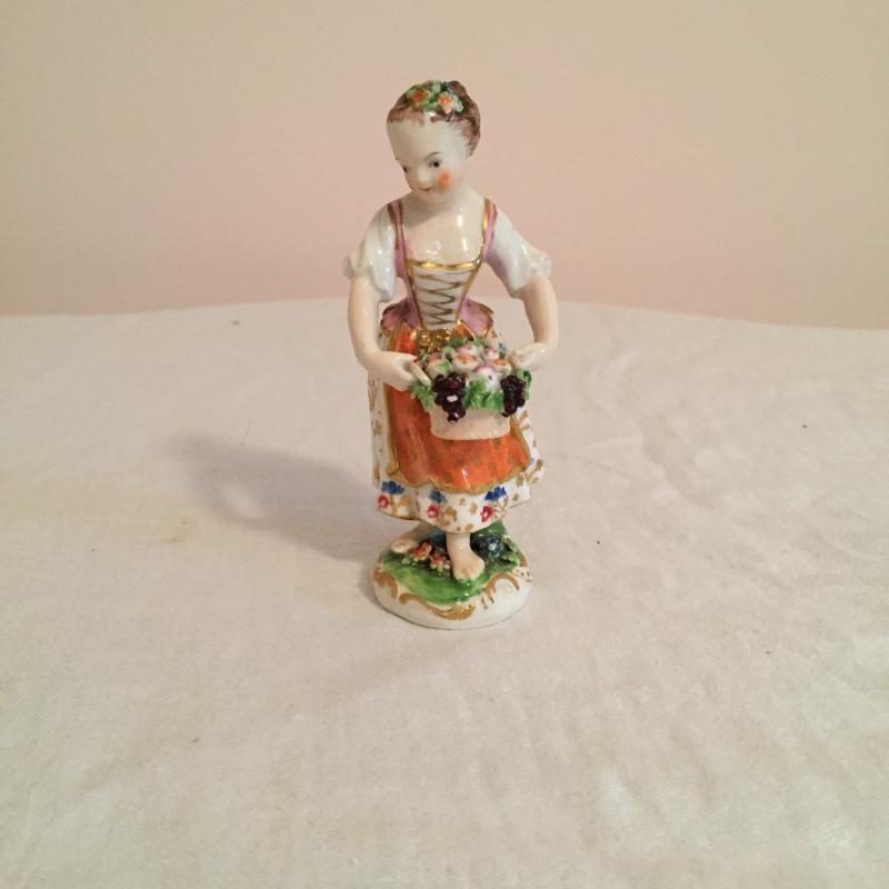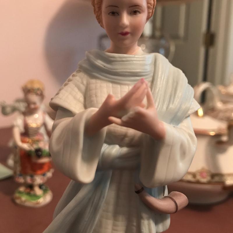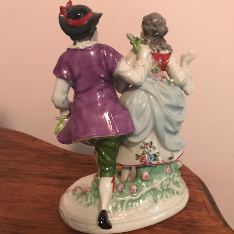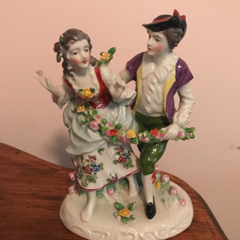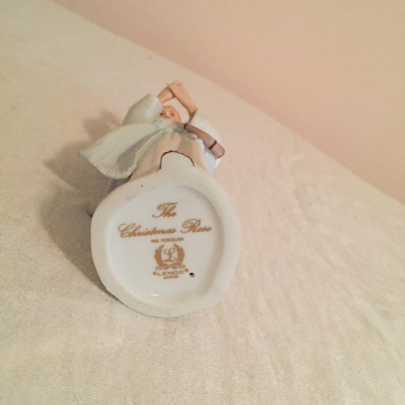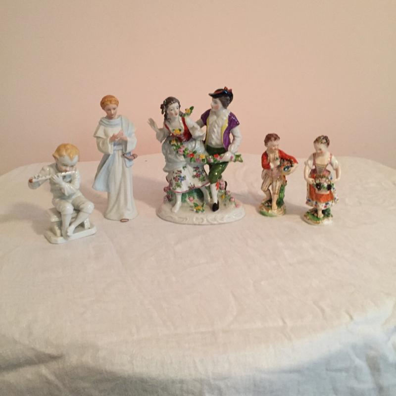 Five Figurines includes a porcelain one called The Christmas Rose by Lenox. Please note the hand is chipped. The others have markings on the bottom that are in photos. For height reference... the man and woman pair measures 7”Tall. Shipping Available