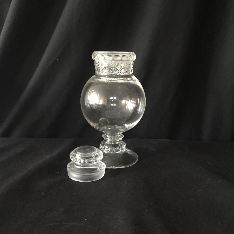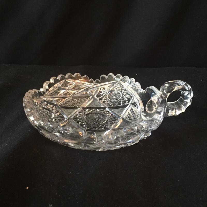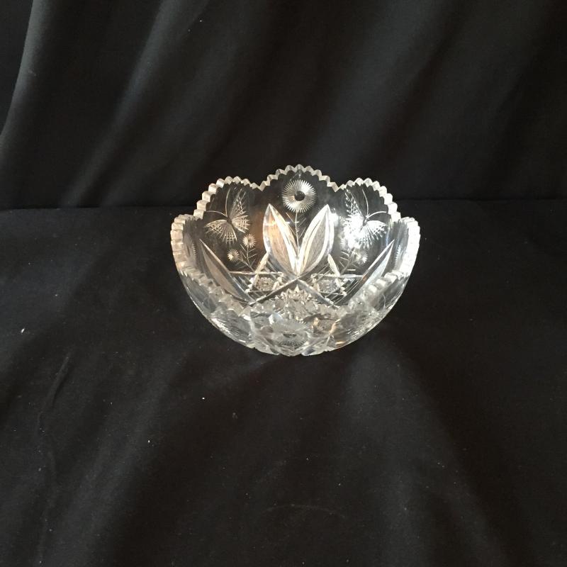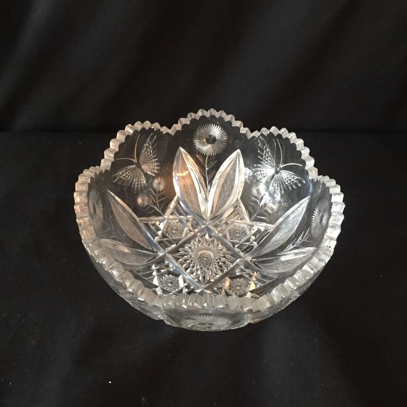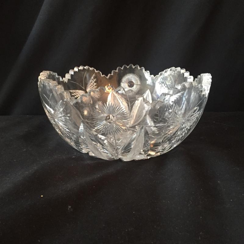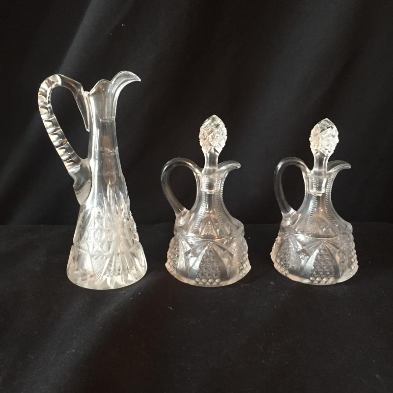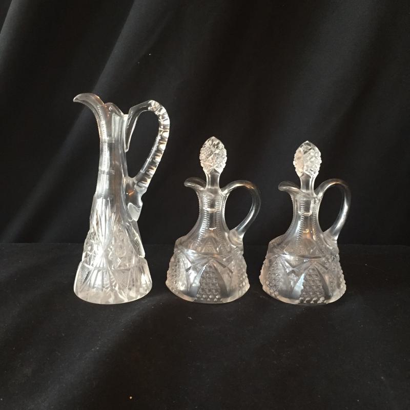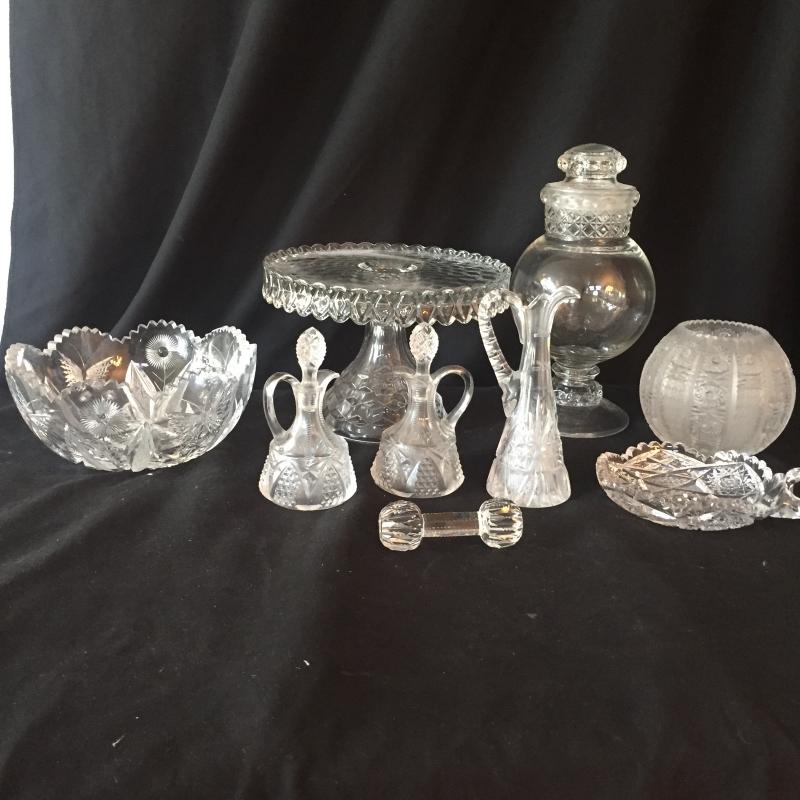 Delightful collection of cut glass pitchers, bowls, paperweight and jar with Fostoria cake platter and crystal saver. No Shipping.