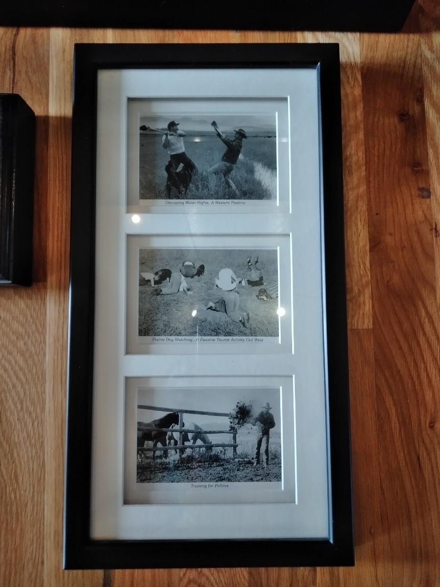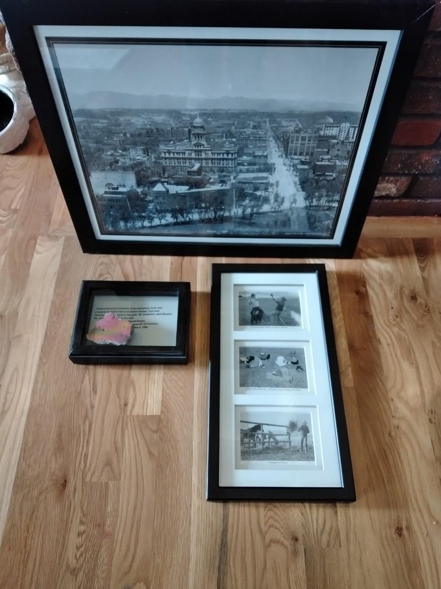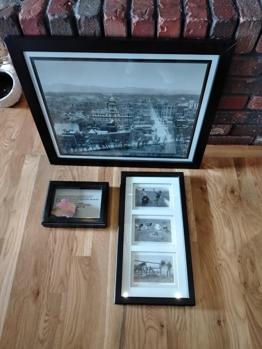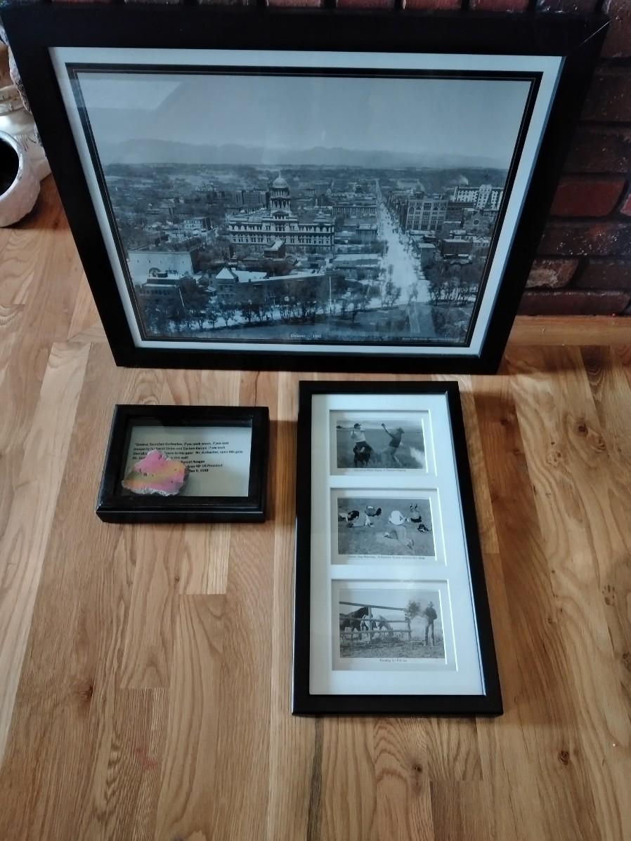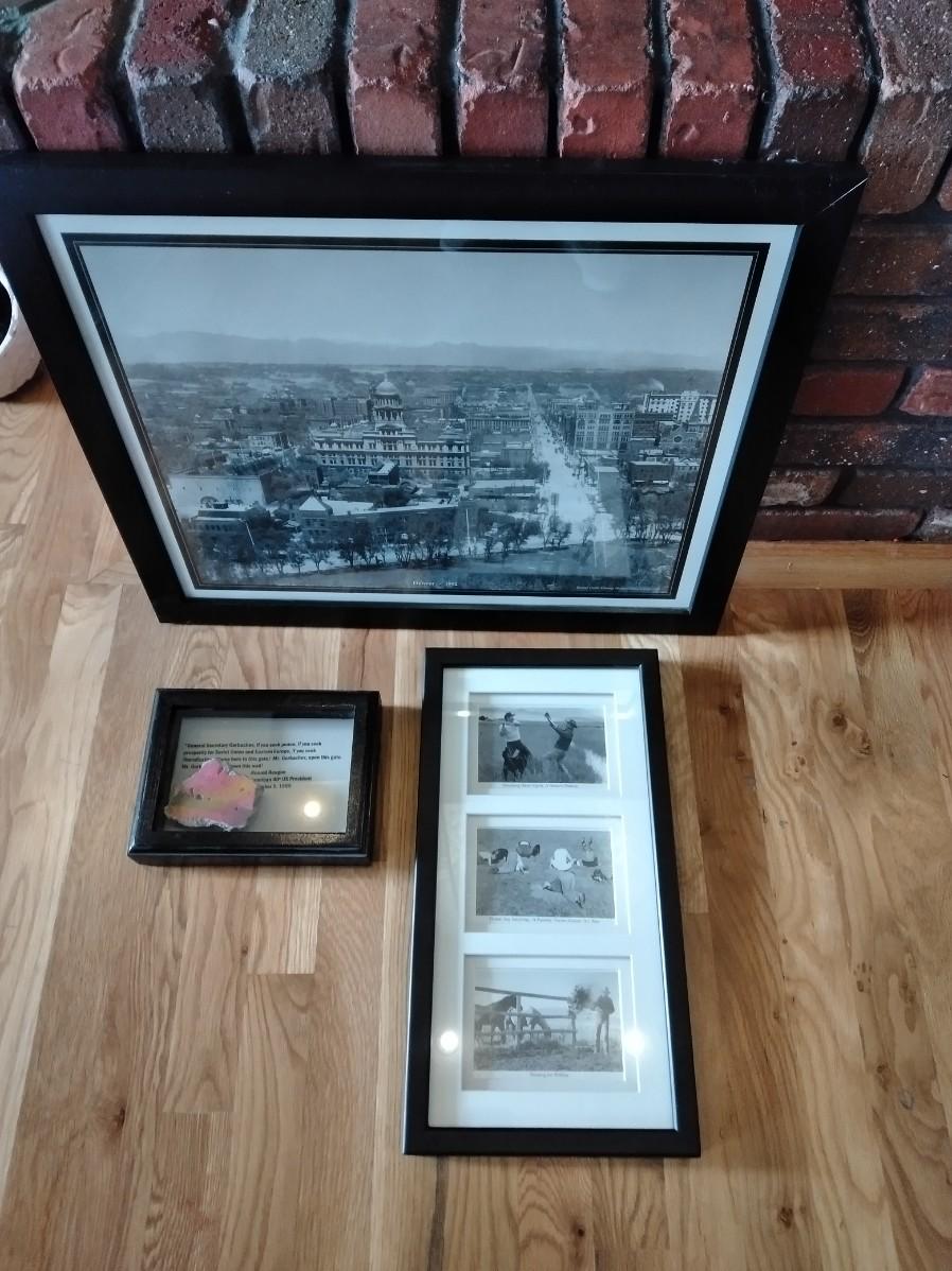 FRAMED 1892 PICTURE OF DENVER, PIECE OF BERLIN WALL, AND A COMICAL FRAMED PICTURE, POLITICAL, PRAIRIE DOG WATCHING, AND WATER RIGHTS.