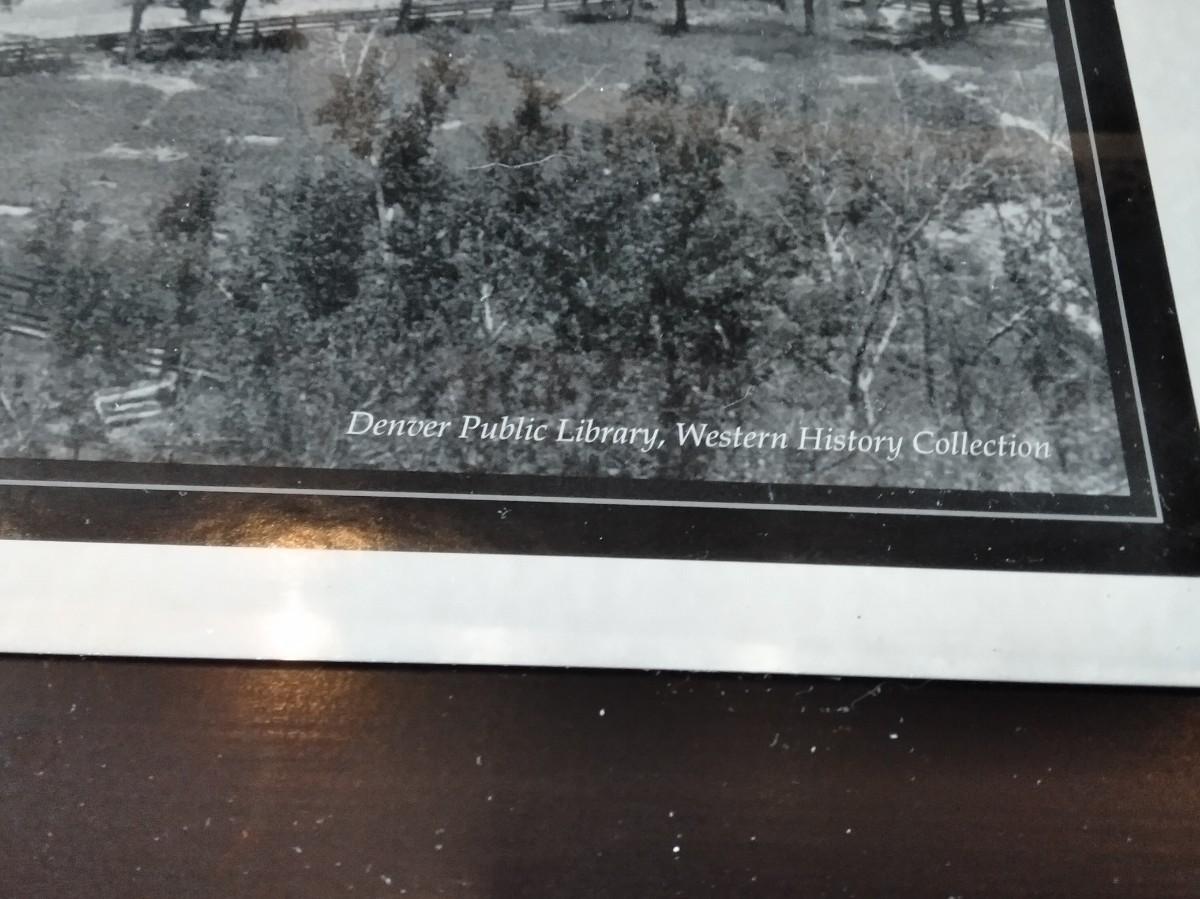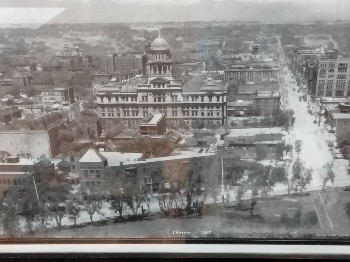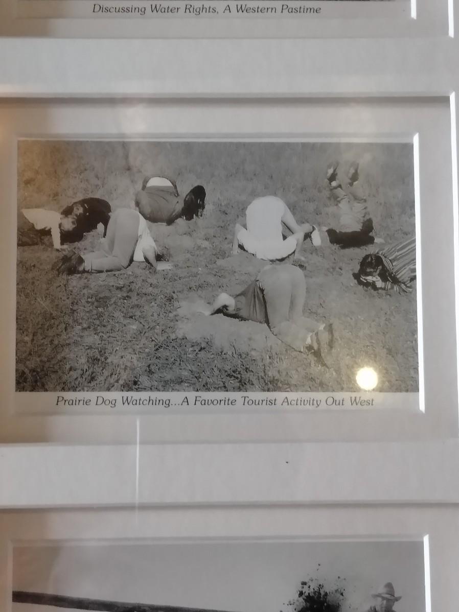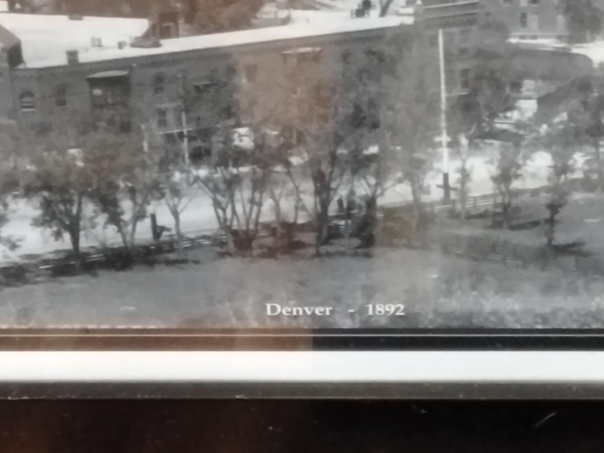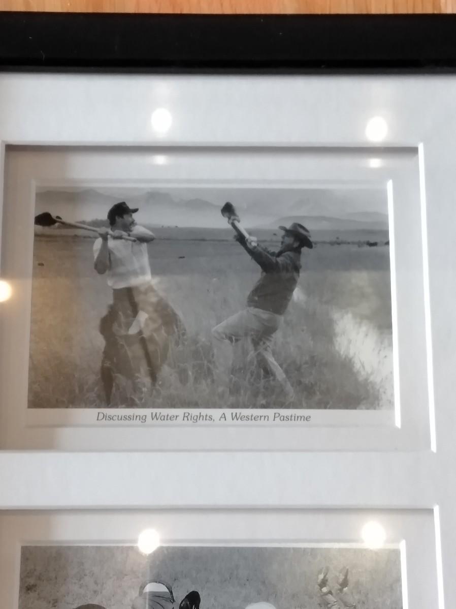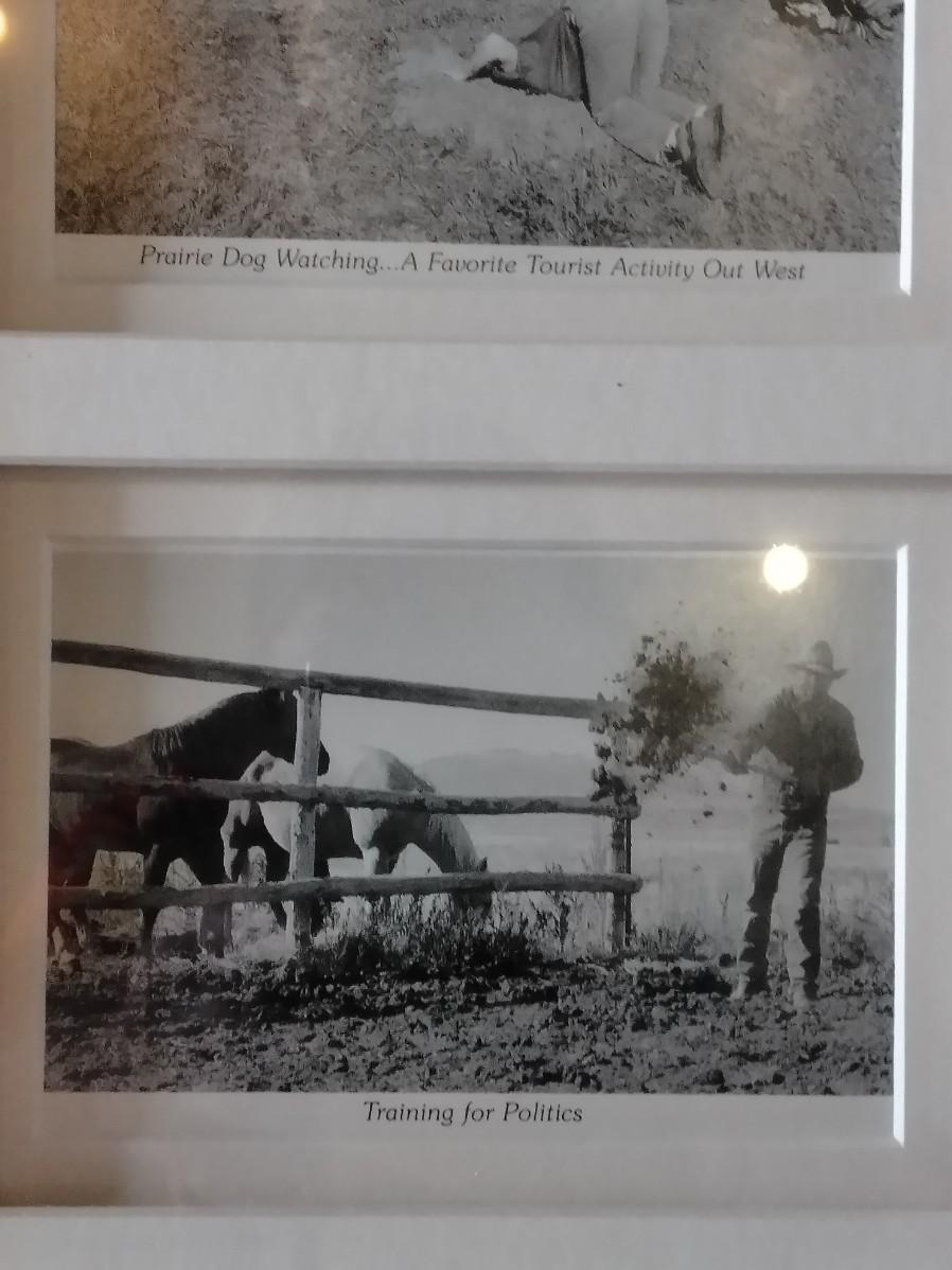 FRAMED 1892 PICTURE OF DENVER, PIECE OF BERLIN WALL, AND A COMICAL FRAMED PICTURE, POLITICAL, PRAIRIE DOG WATCHING, AND WATER RIGHTS.
