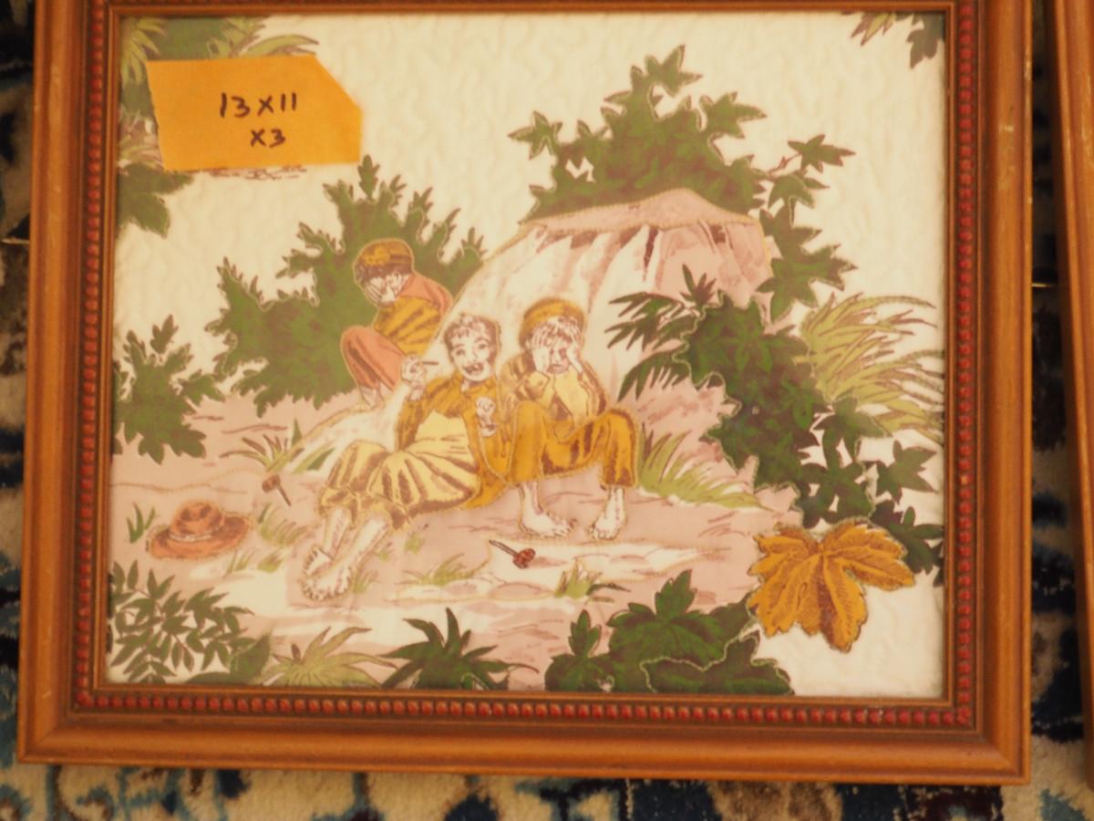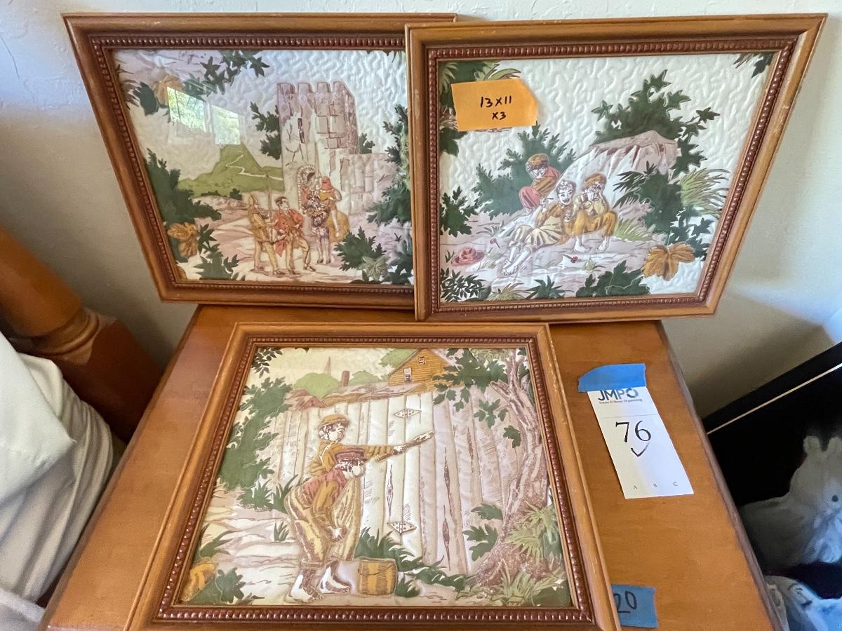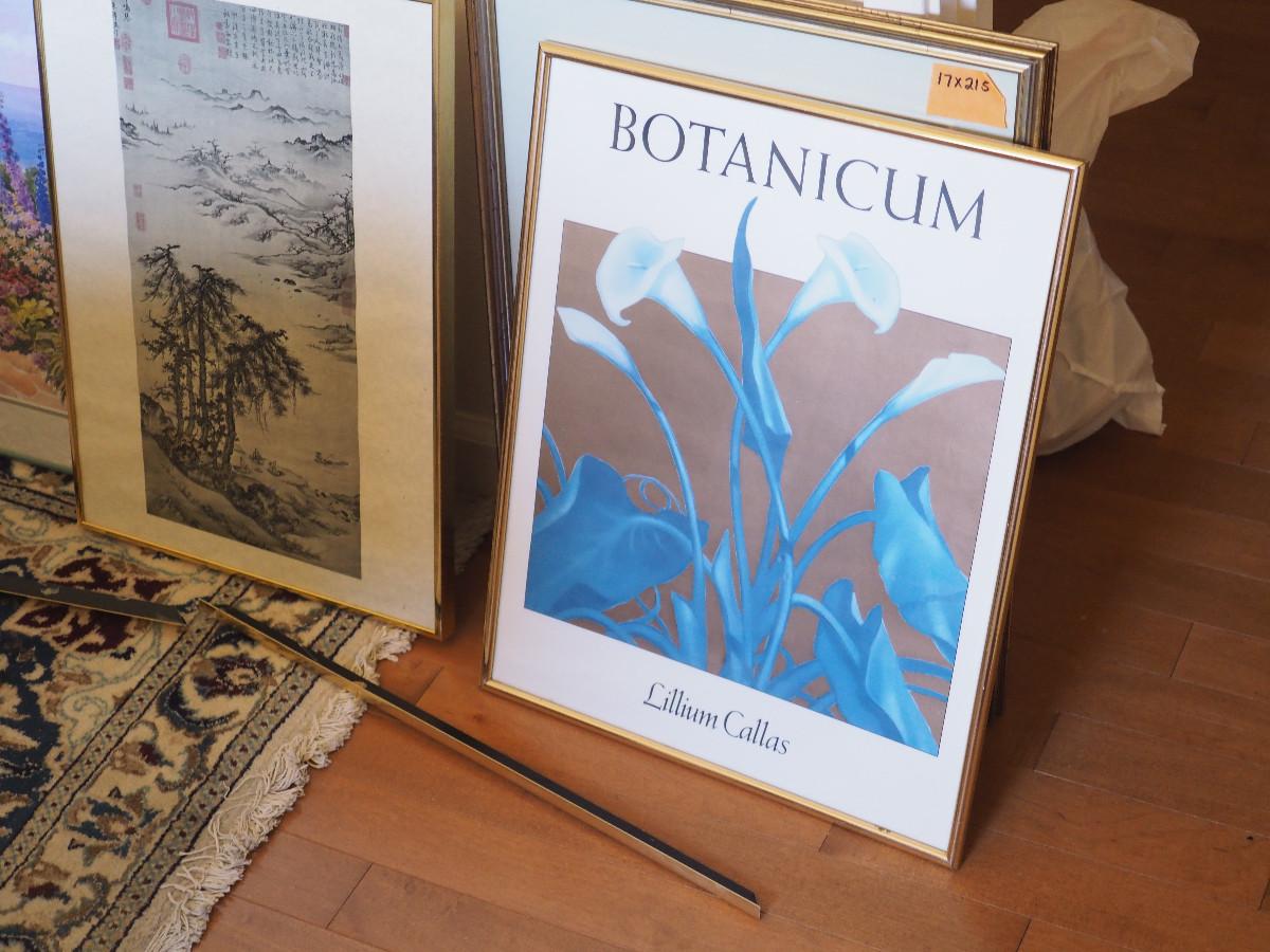 Framed prints, posters, vintage scenes as shown. Set of 3 vintage scenes with matching frames are 13x11". Larger Art are 22x28” & 28x22”. One art, frame is damaged.