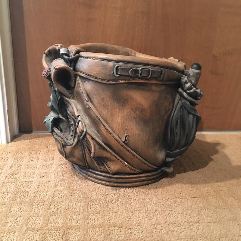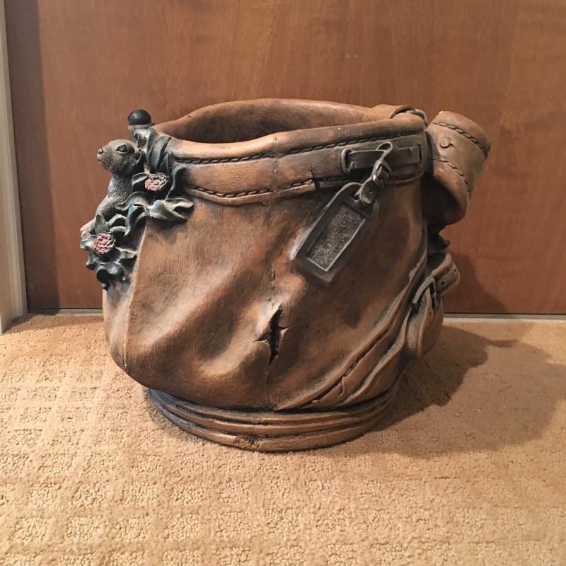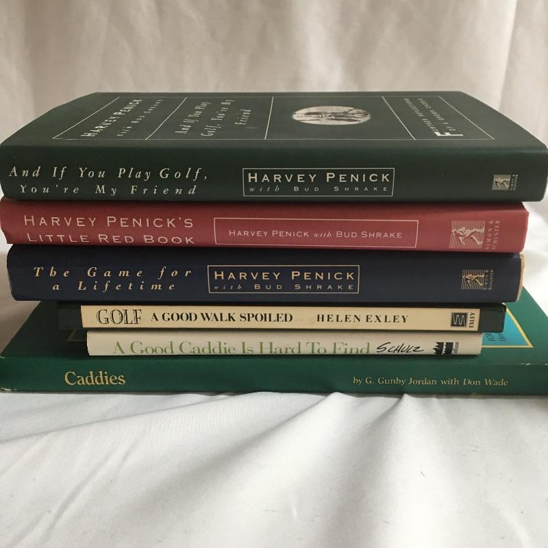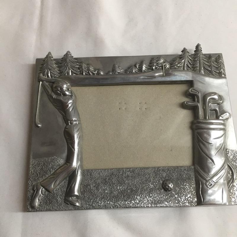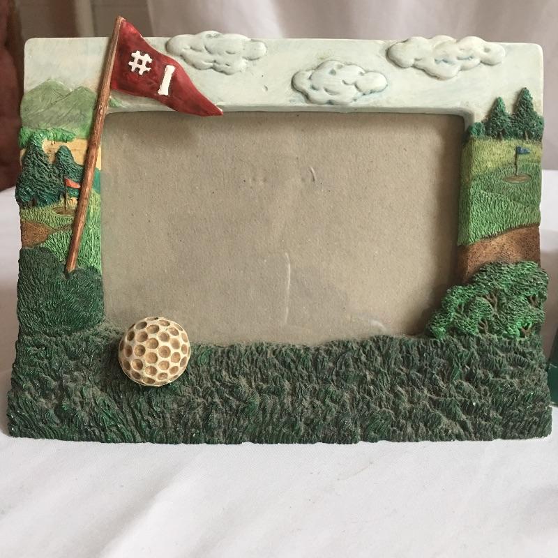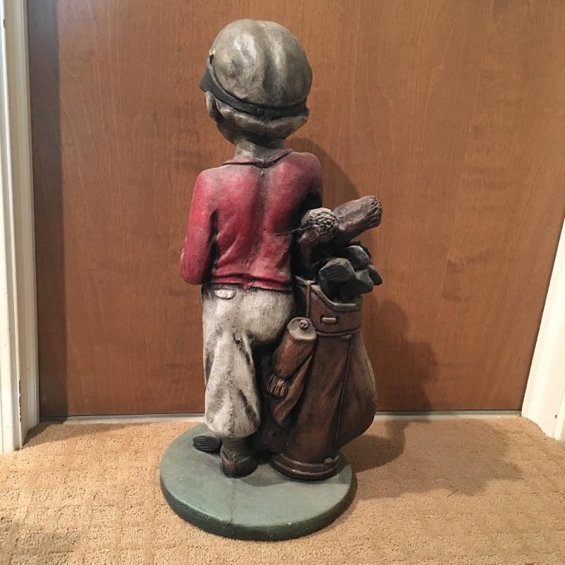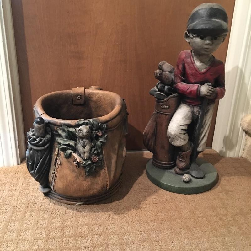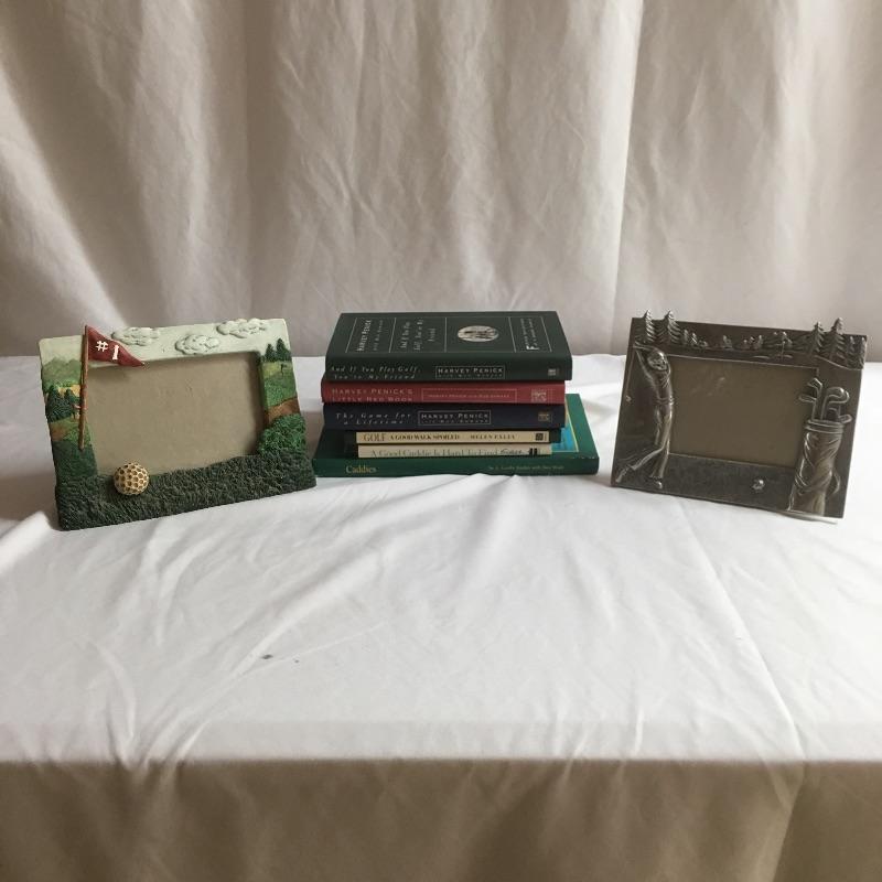 Golf decor includes golf bag planter, golf statue, golf books and a pair of golf themed picture frames. Statue measures 23” tall with a 10” D base.