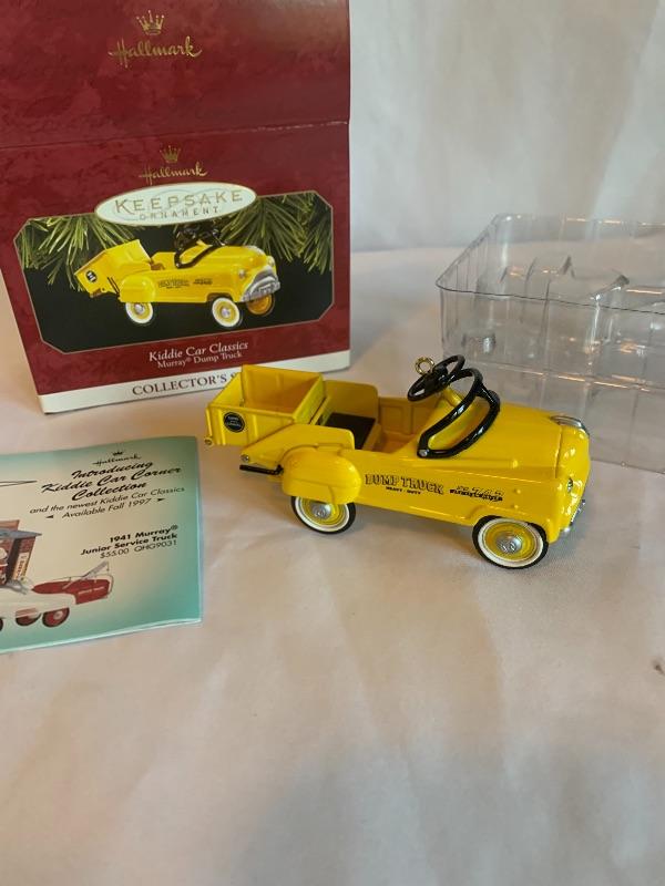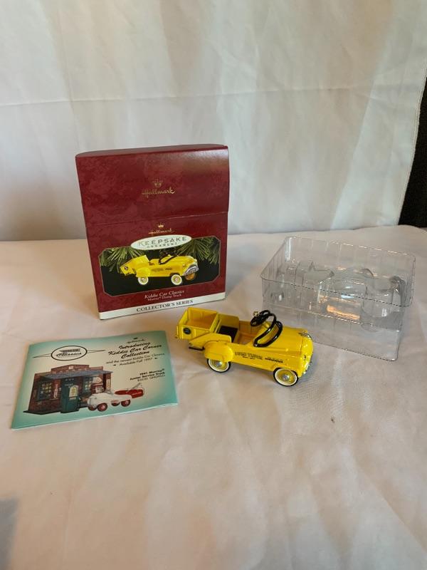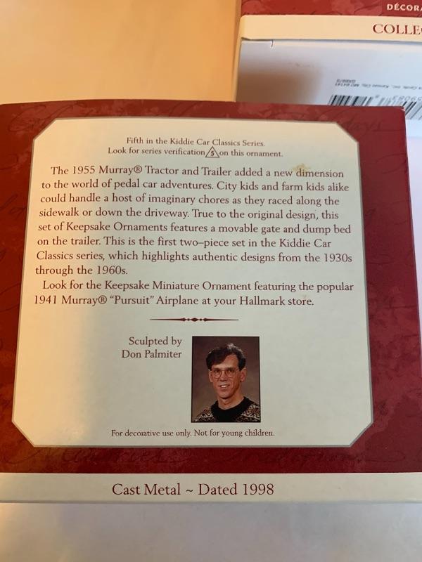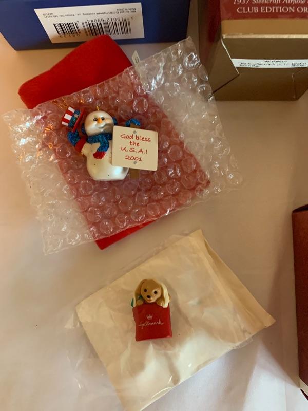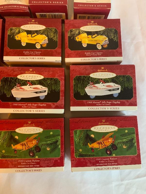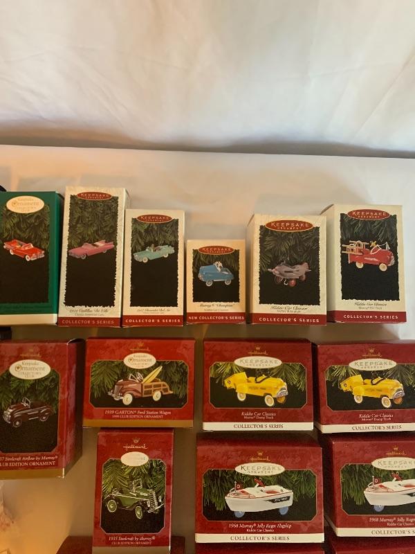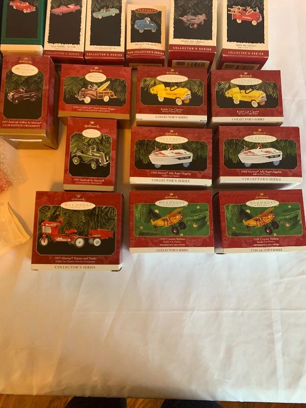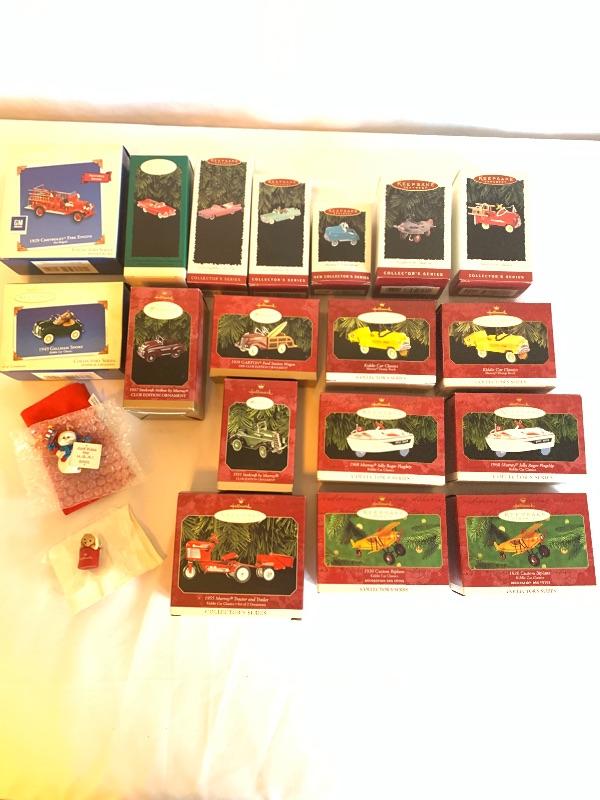 Lot includes eighteen ornaments and two small table toppers. All ornaments are in box and have original wrapping and most do not appear to have been him even. This collection is from the mid 1990’s to early 2000 with three duplicates and others all die-cast metal sculpted by Don Palmiter. Fun holiday gift for that car lover in your family. Shipping available.