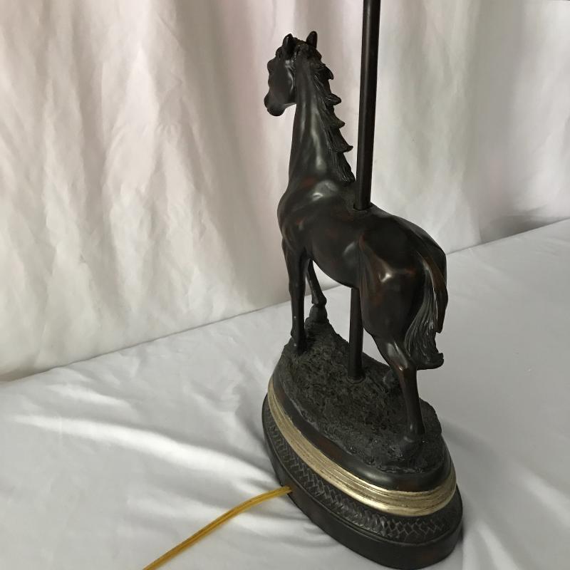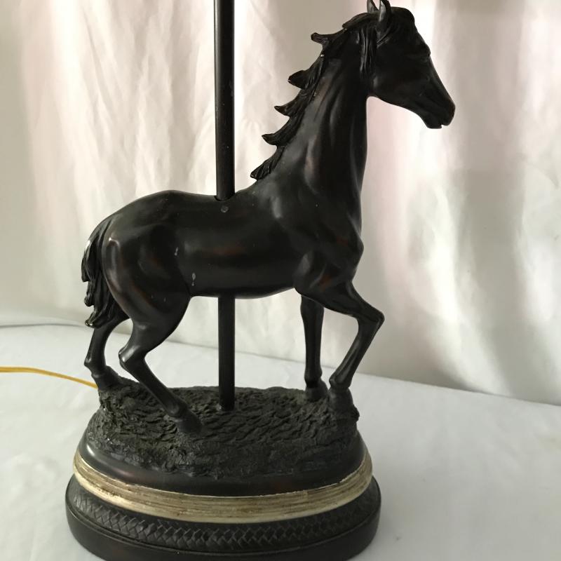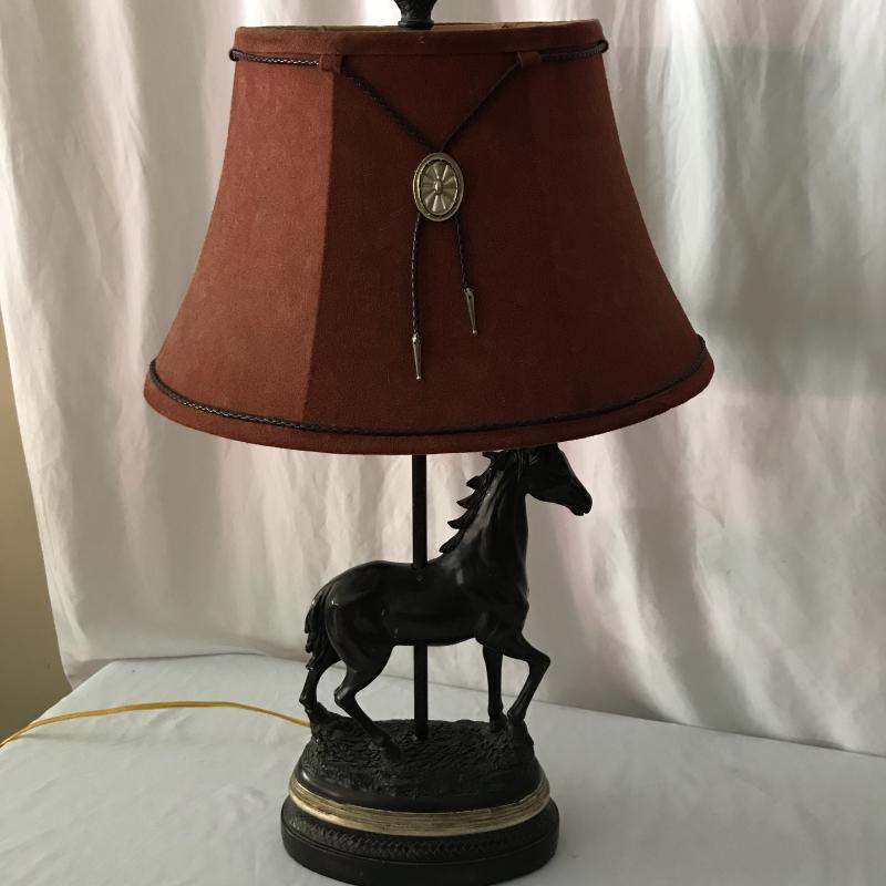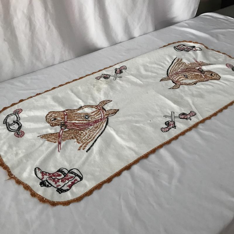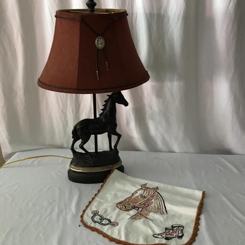 “Running Free” metal horse table lamp. Measures 18” x 13” x 29.5”h with shade. Lot also includes oval table linen with cowboy-inspired needlework that measures 35” x 16” Local pick in Maggie Valley.