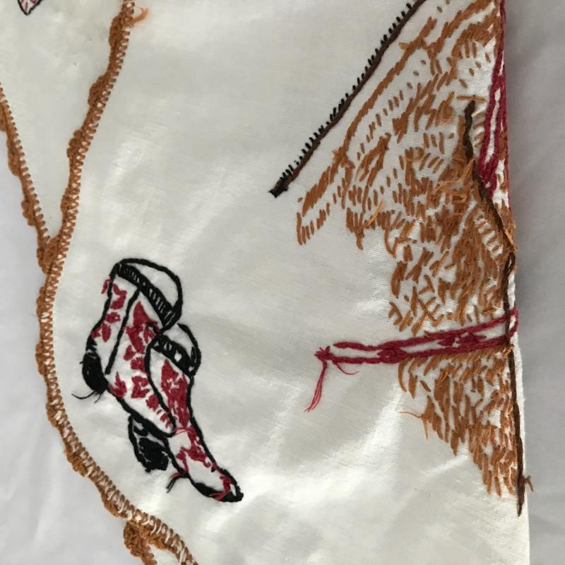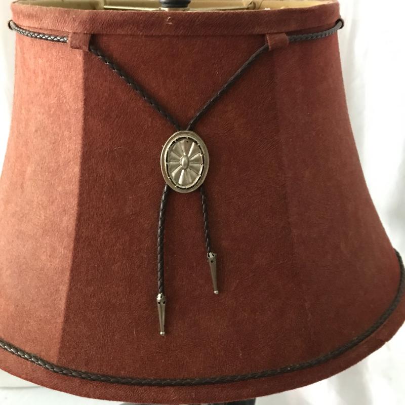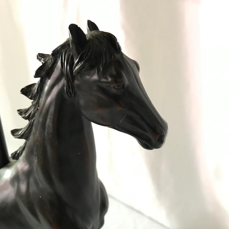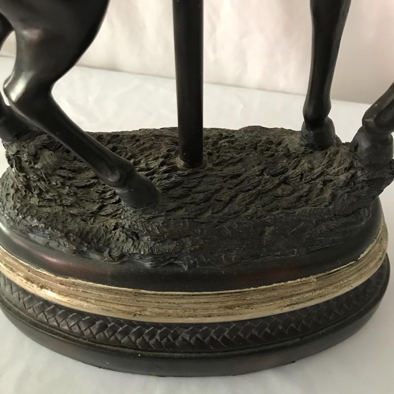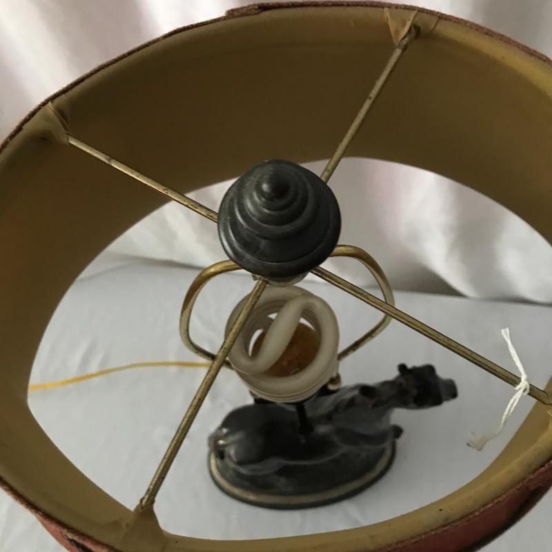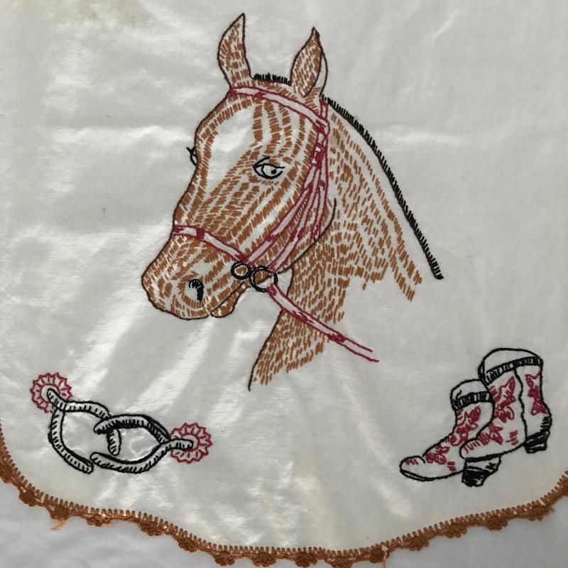 “Running Free” metal horse table lamp. Measures 18” x 13” x 29.5”h with shade. Lot also includes oval table linen with cowboy-inspired needlework that measures 35” x 16” Local pick in Maggie Valley.