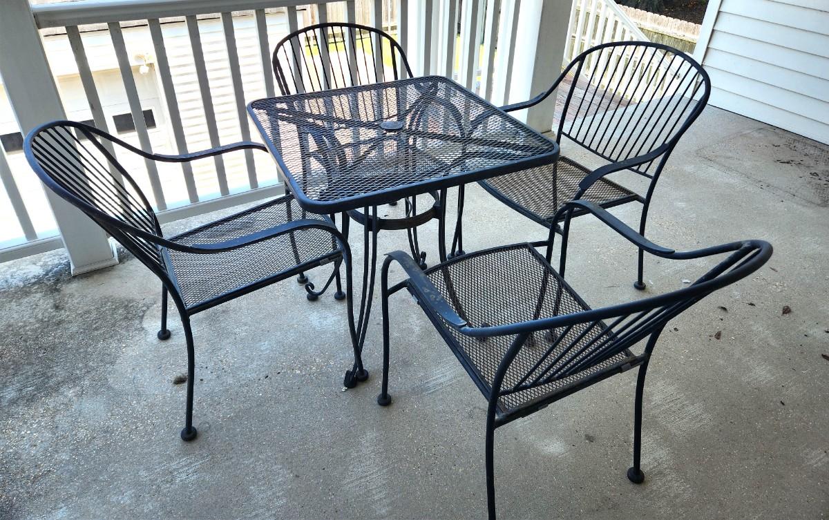 Nice classic iron outdoor set - table and 4 chairs - all in good used condition. Table is 28" x 28". Chairs are 22.5" across, 30" tall. Note: no hole in table for umbrella. This set is on the upstairs back porch.