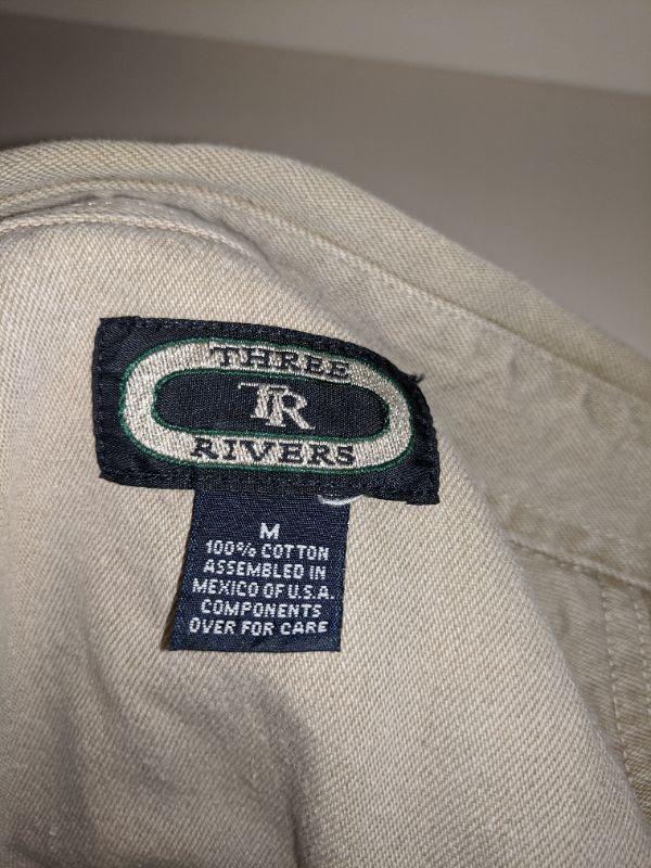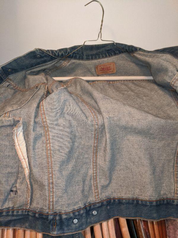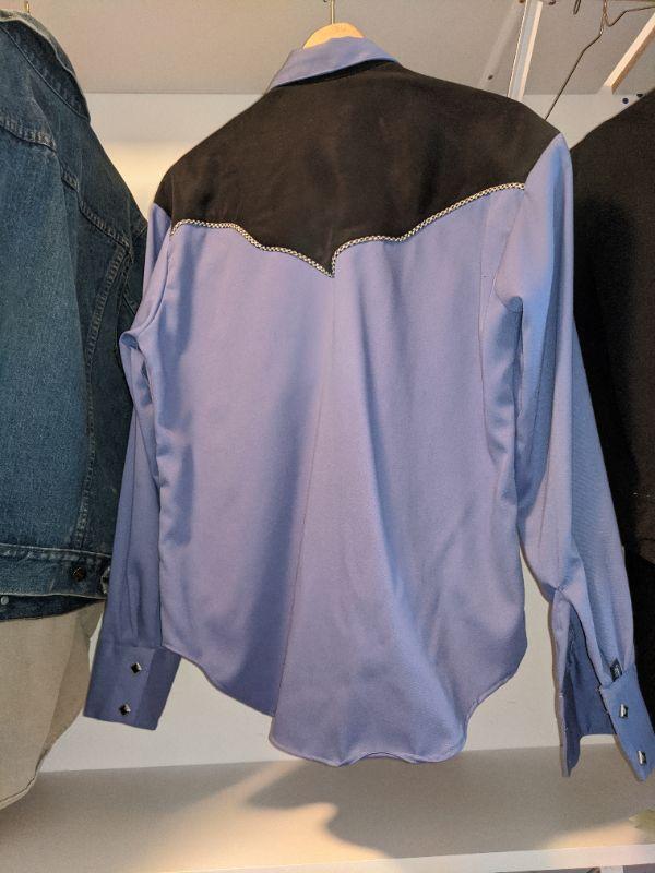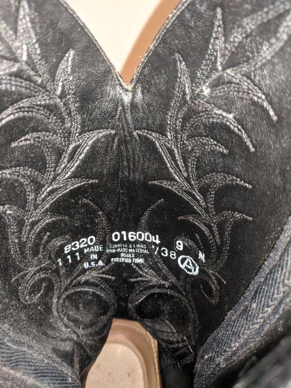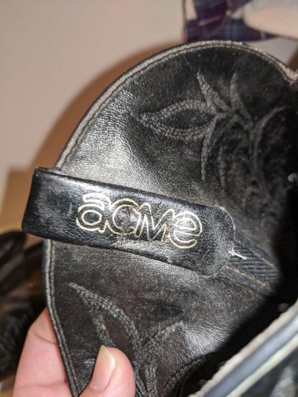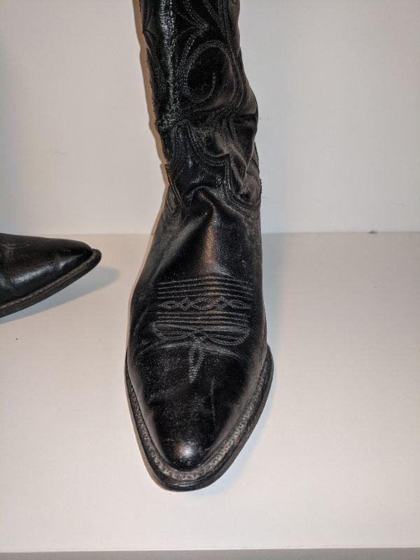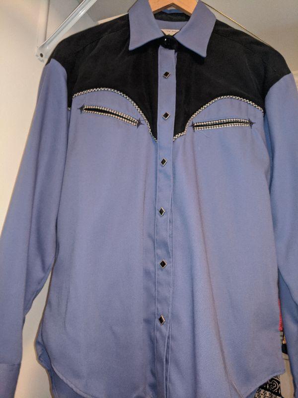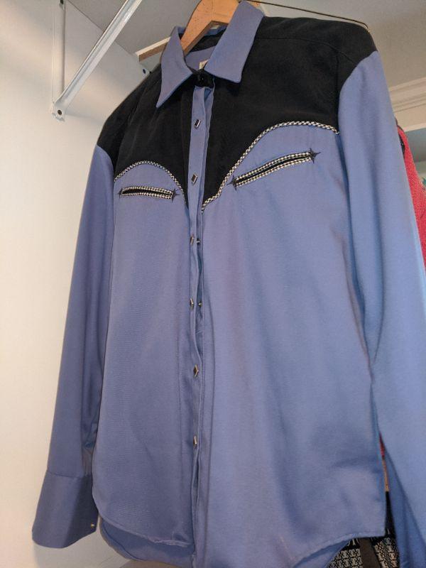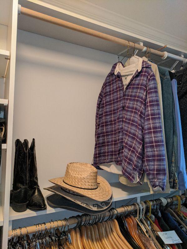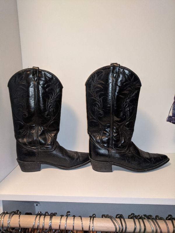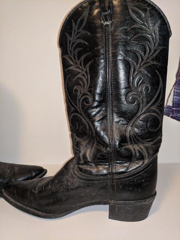 Howdy ya'll! This lot contains 3 shirts, a Levi's jean jacket, a pair of Bogne riding pants size 12, 3 hats and a black, leather pair of size 9 M width women's cowboy boots by acme. The boots have definitely hit a rodeo or two, see pictures.