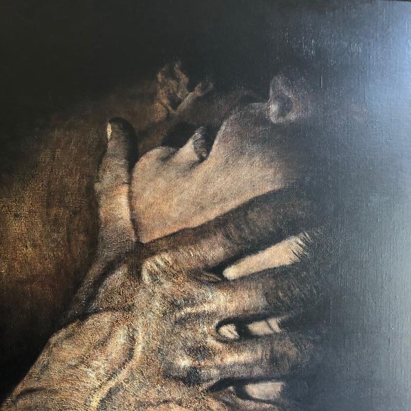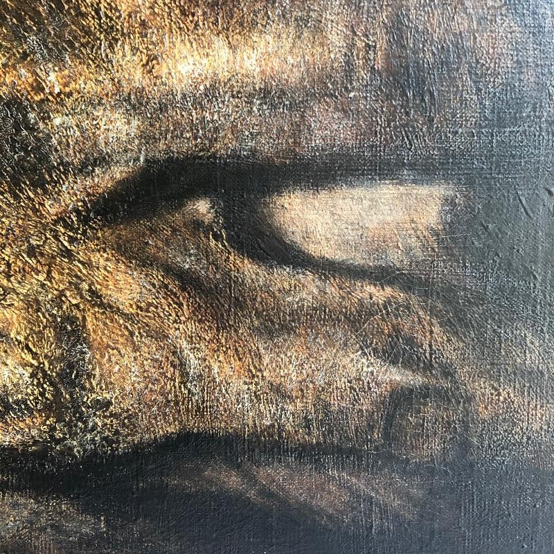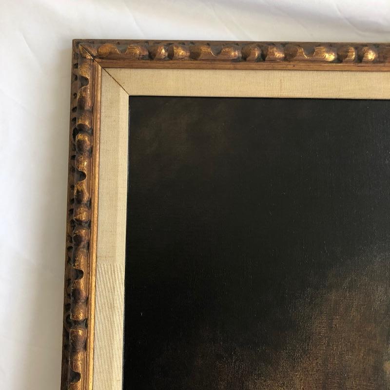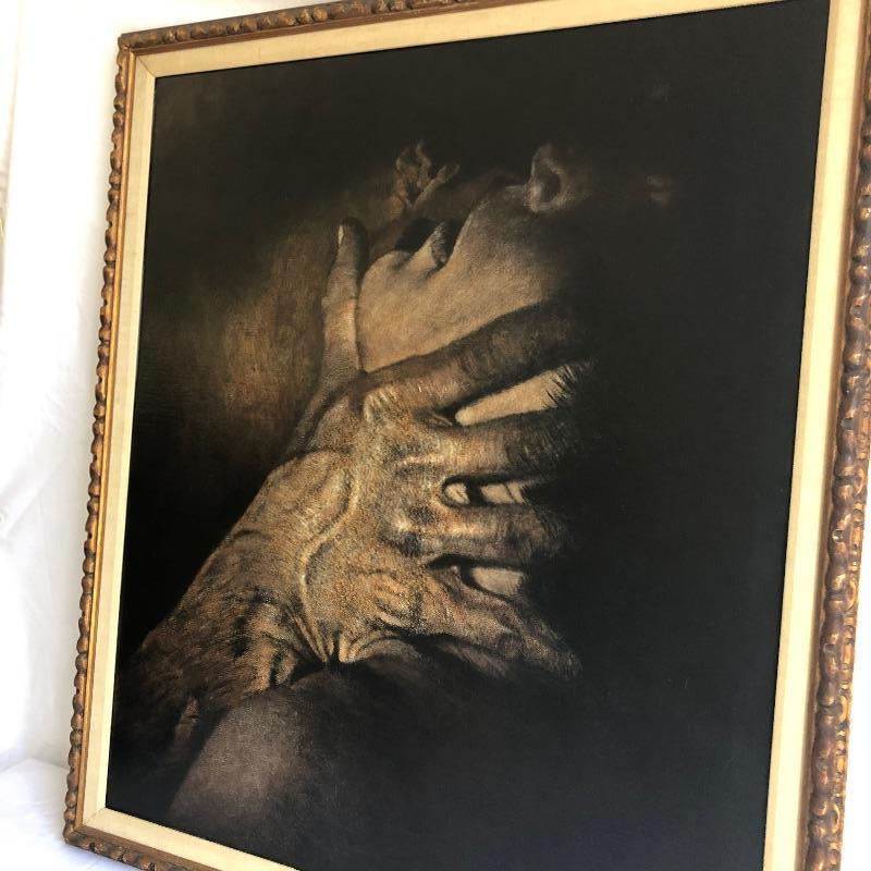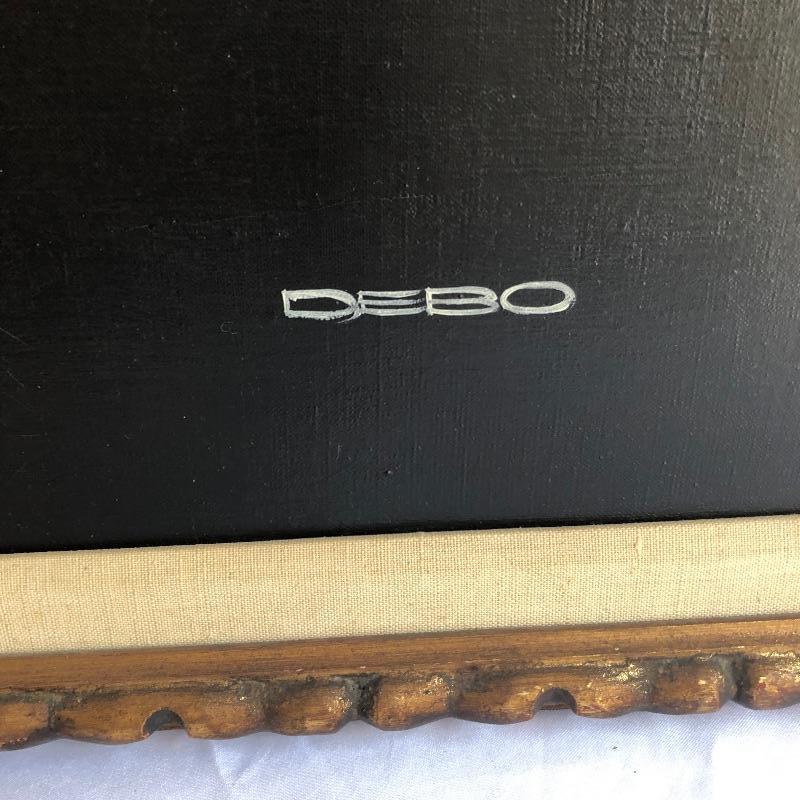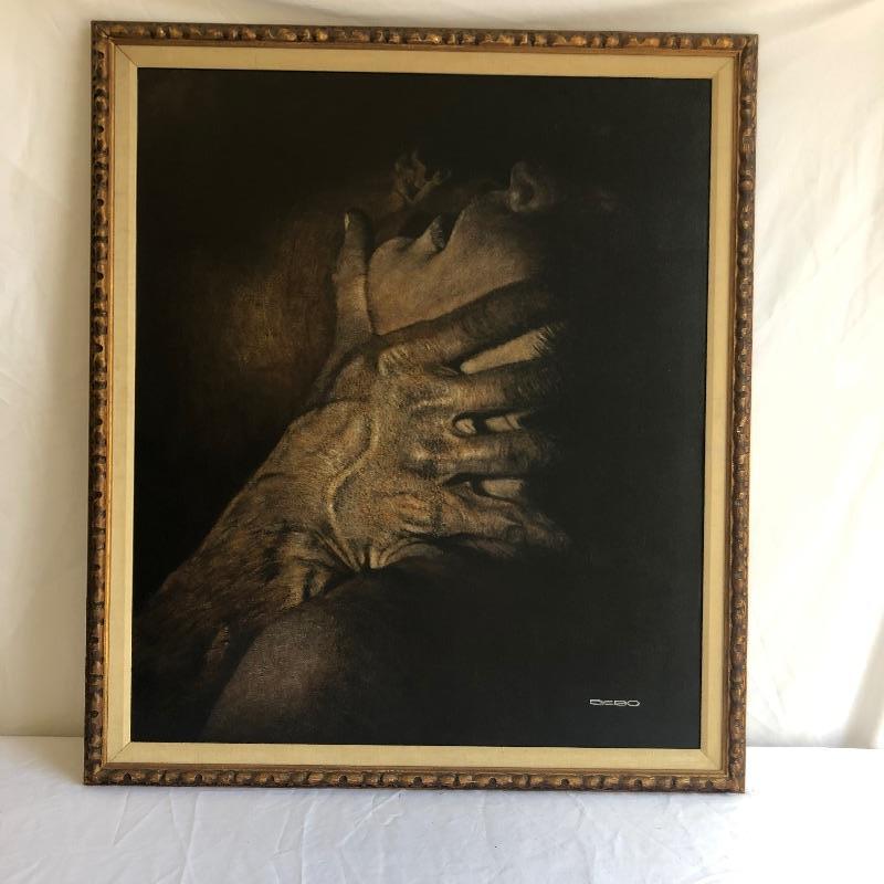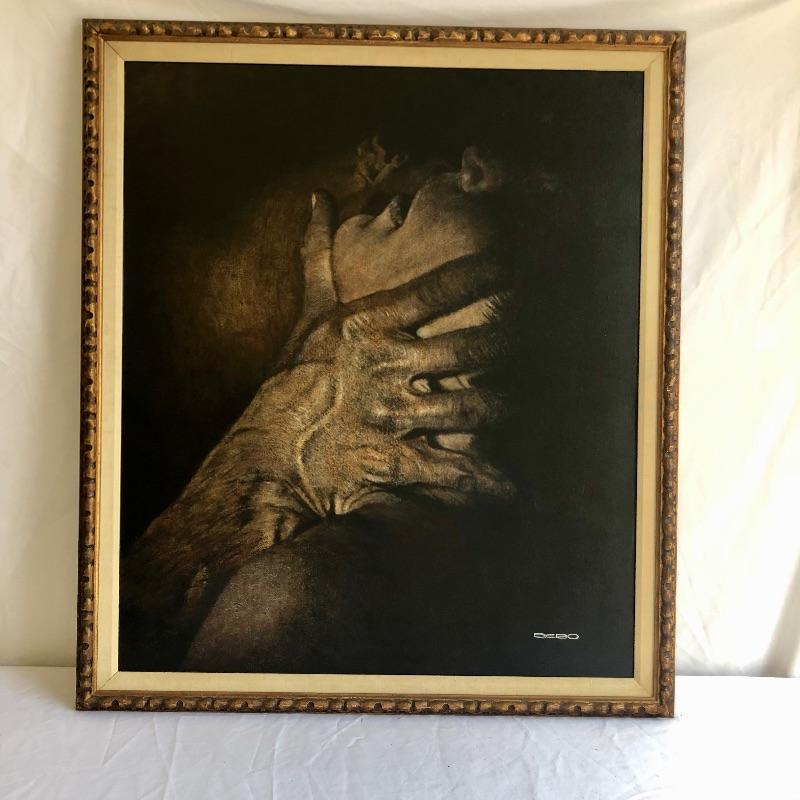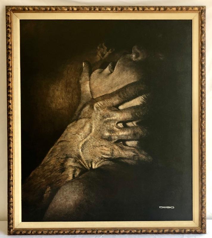 This very large painting is unusual and dramatic. Signed “Debo” by Dennis Debo Clark. It is titled "Time Enough to Sleep". It is an oil on canvas. It has been beautifully framed which we all know is very costly. Frame appears to be painted wood with a hint of gold and it’s got heavy duty hanging apparatus on the back. Very Large nicely framed. Painting is circa 1968 and had some restoration done in 2010.