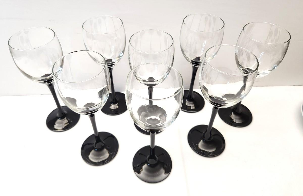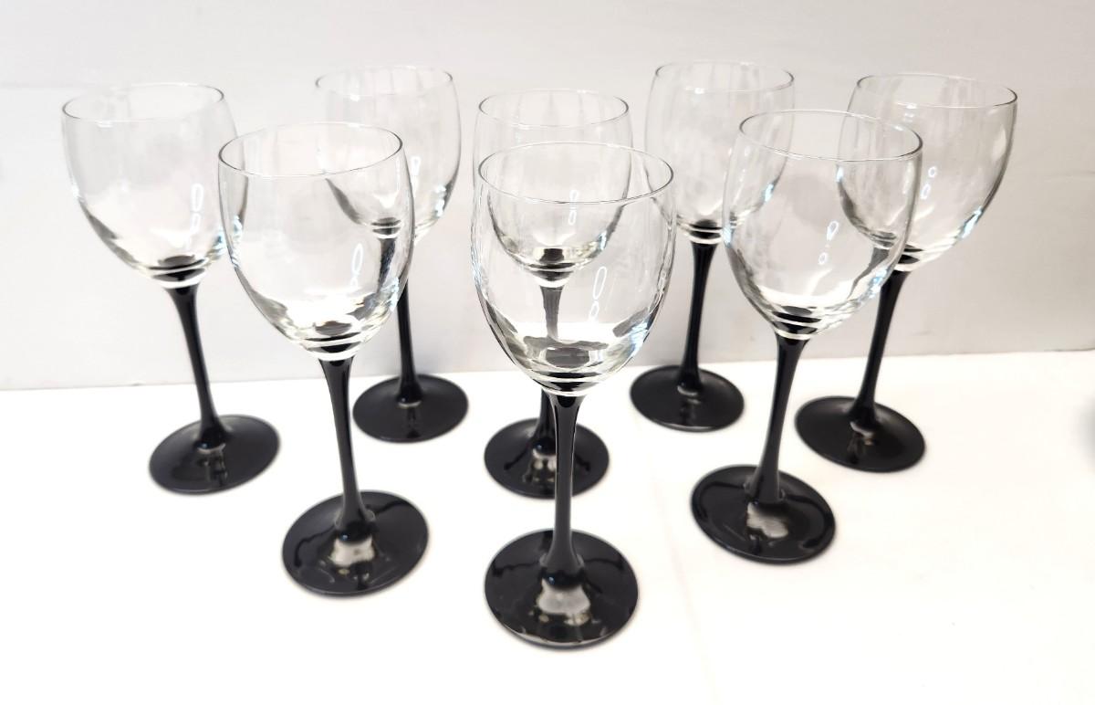 Made in France, likely Luminarc - lot of 8 wine glasses, each 8" tall, black stems, clear goblet.