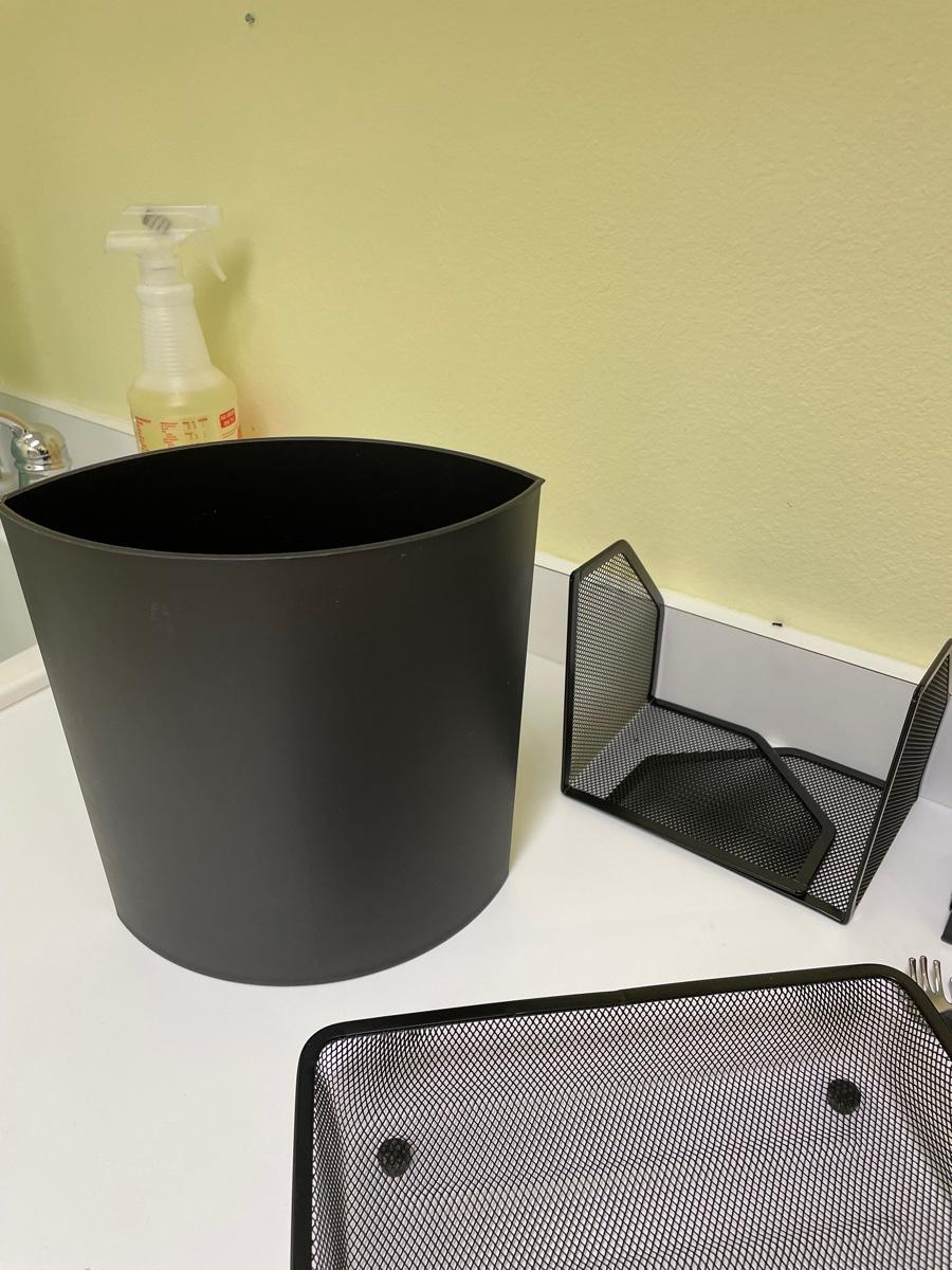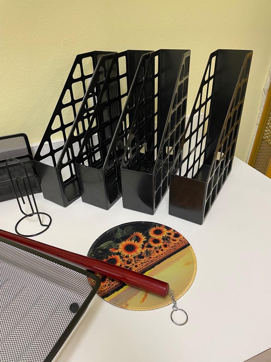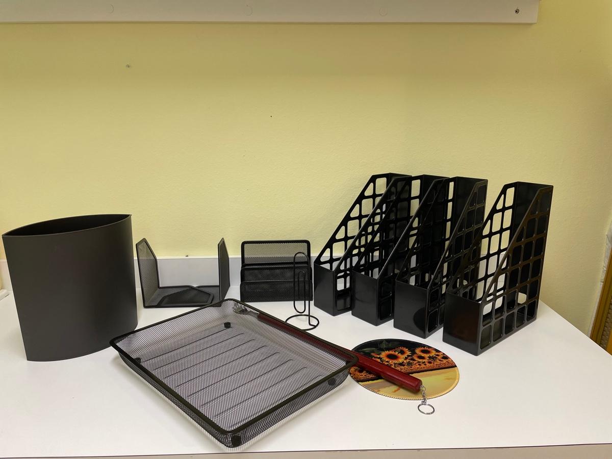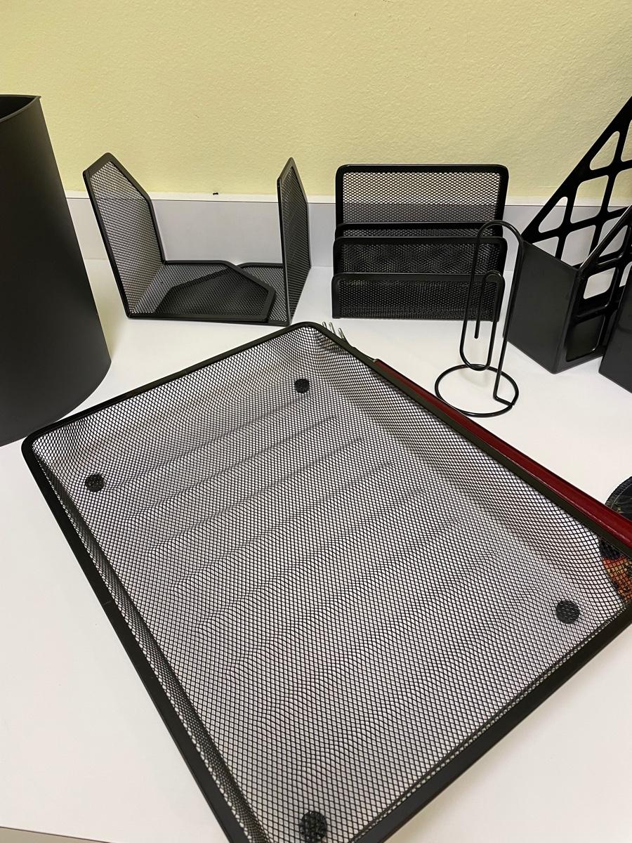 Four magazine holders, mesh tray bookends, letter holder, waste basket, mouse pad, back scratcher