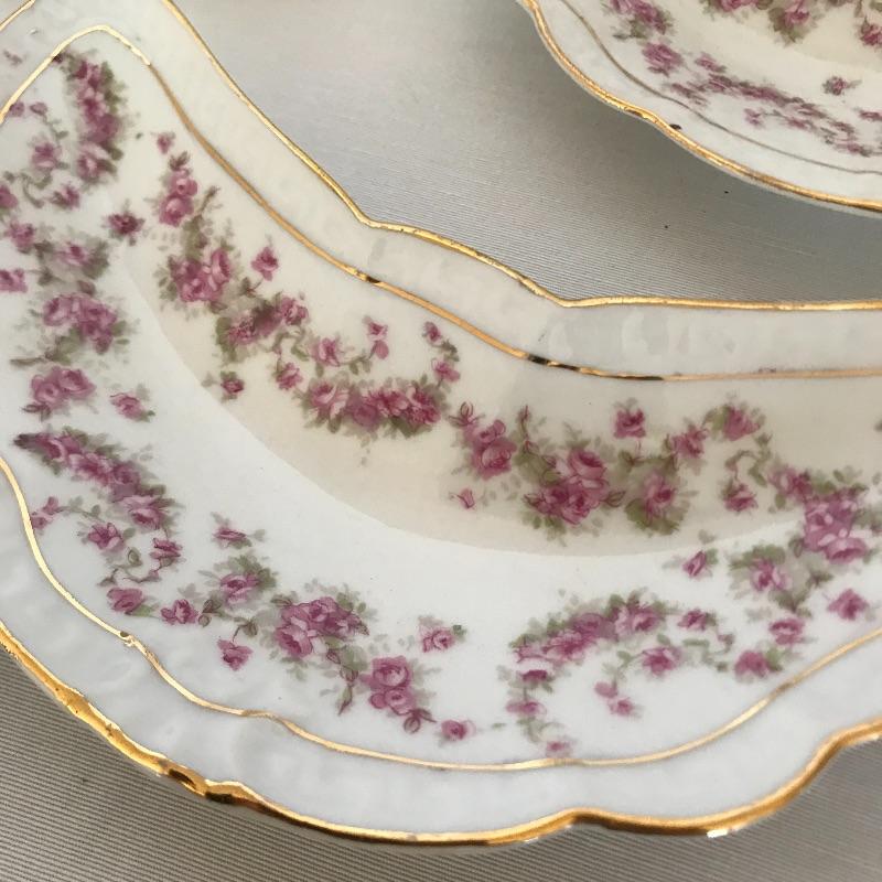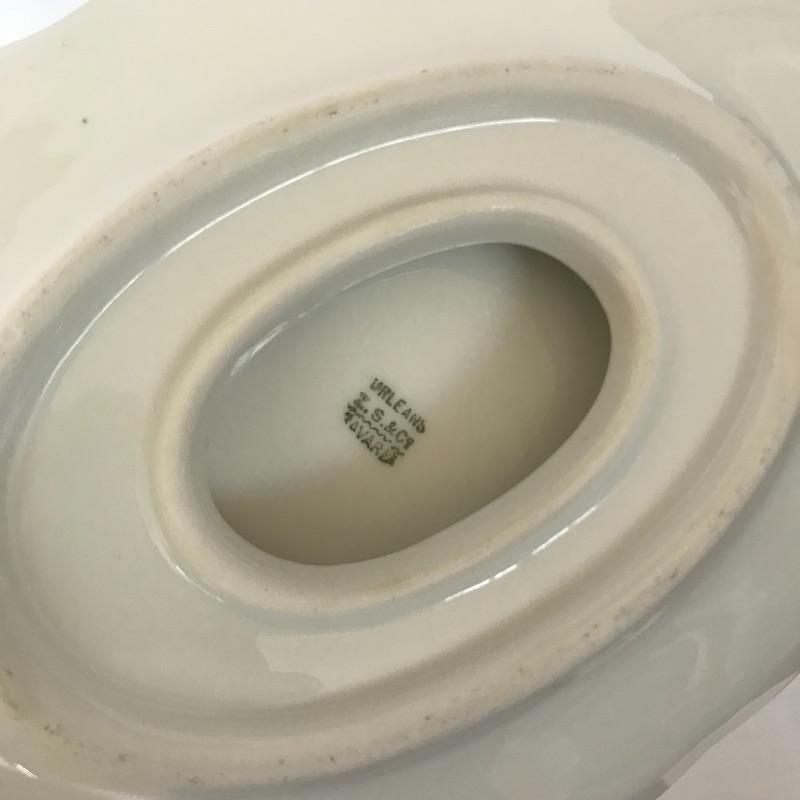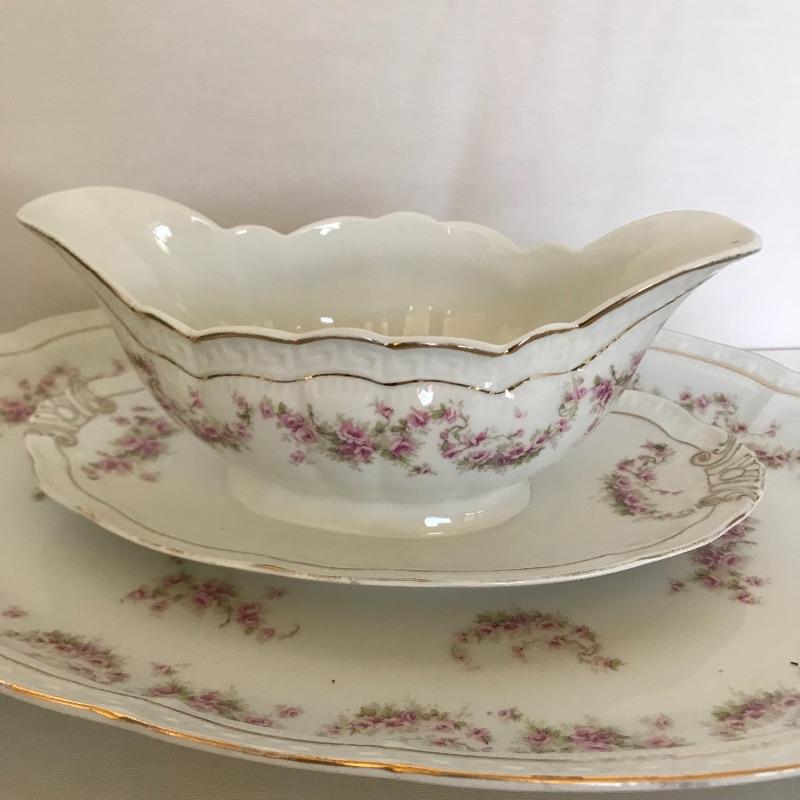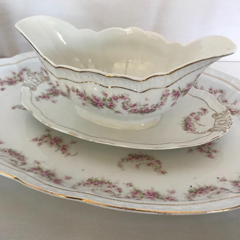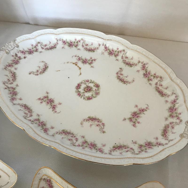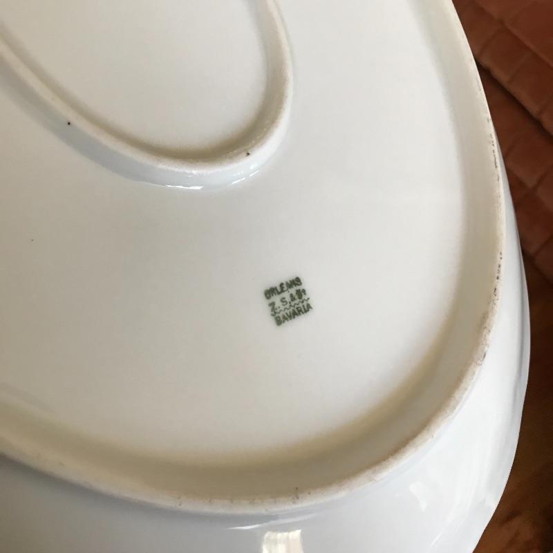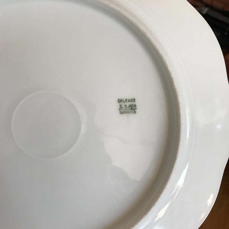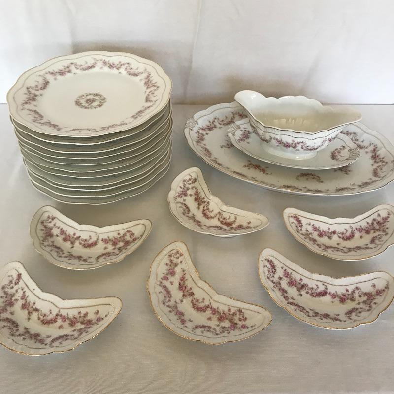 This 19-piece set of Orleans Bavaria China includes 11 dinner plates, 6 moon shaped serving dishes, a large oval serving plate and a gravy boat with affixed bottom plate. Serving dish is approx. 15” x 10”. See pics. Shipping available.