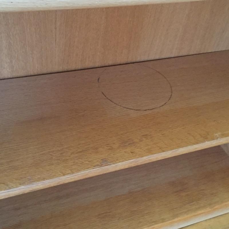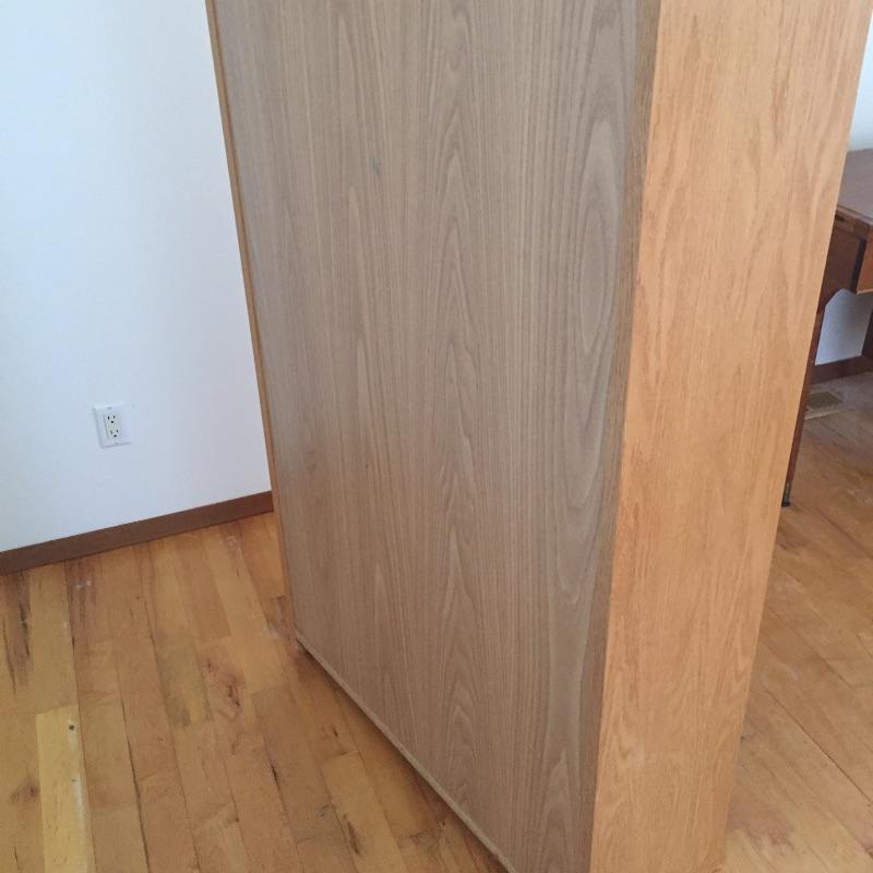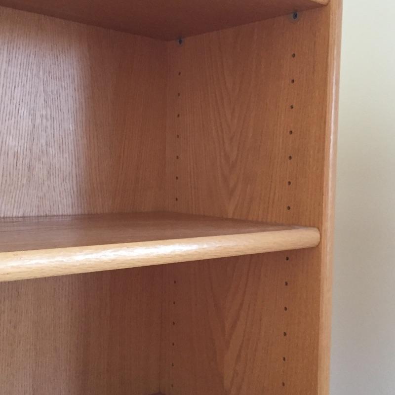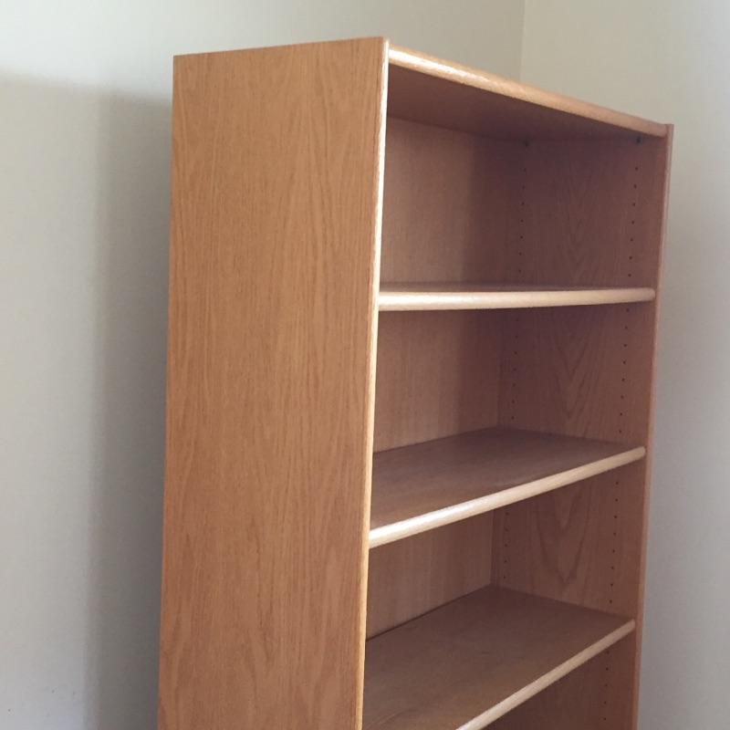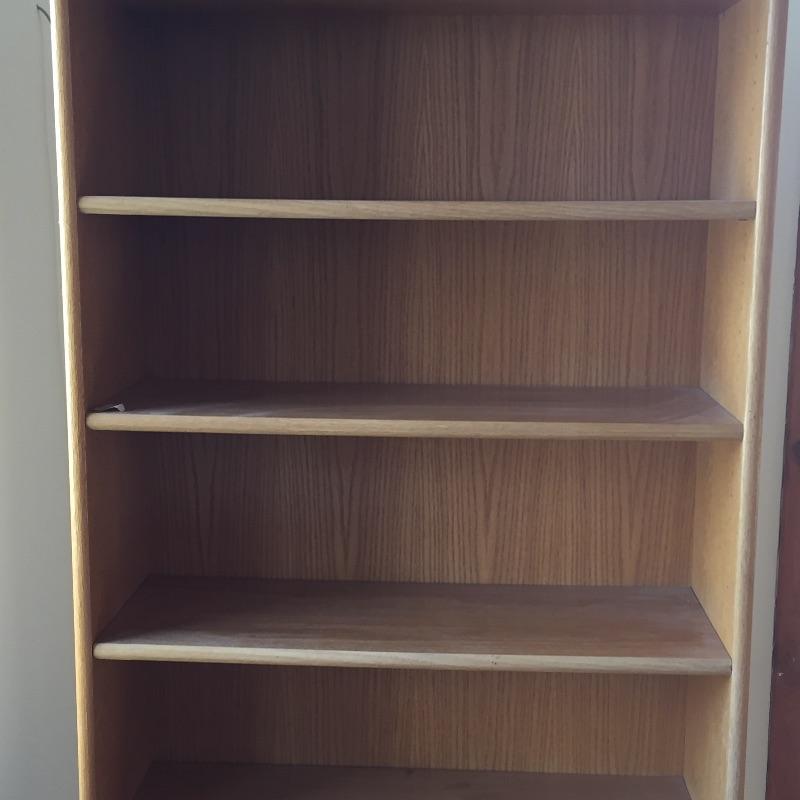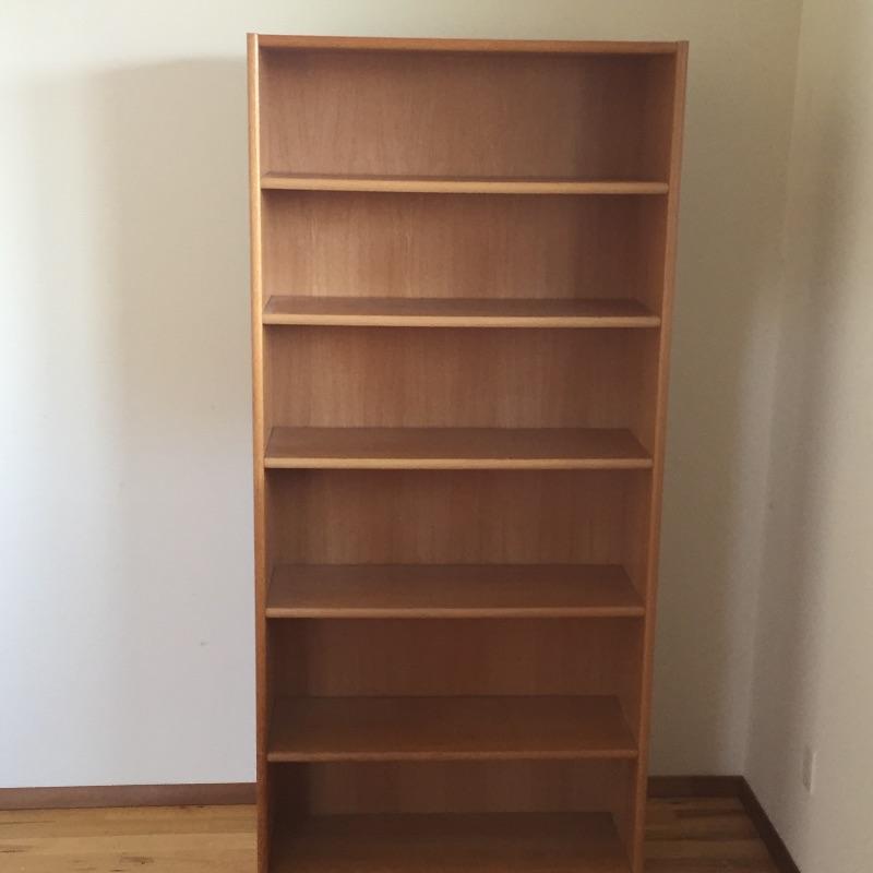 Two wooden matching bookcases. These bookcases will hold a lot of books with six shelves each. They are sturdy and in great condition. Great matching pair. One shelf has a small stain - See pictures. Bookcases measure 36” x 79” x 12.5”.