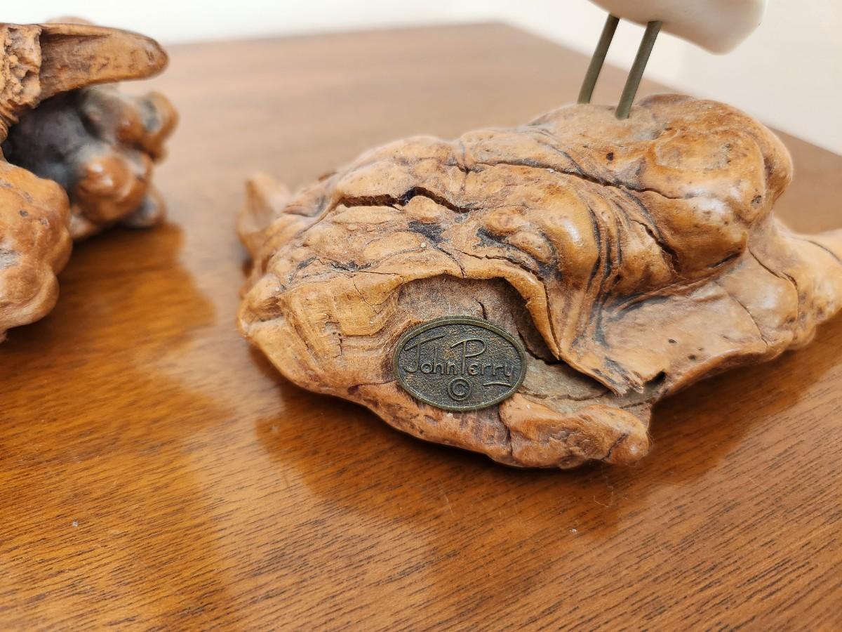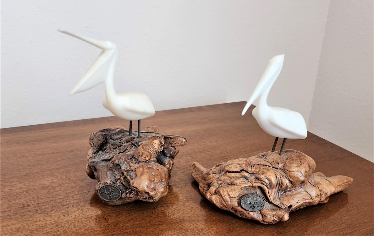Nice lot of 2 mid-century signed John Perry Pelican sculptures. Both are mounted on burled wood. They each stand about 6" tall. Both in good condition.