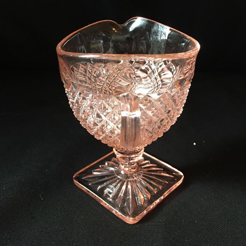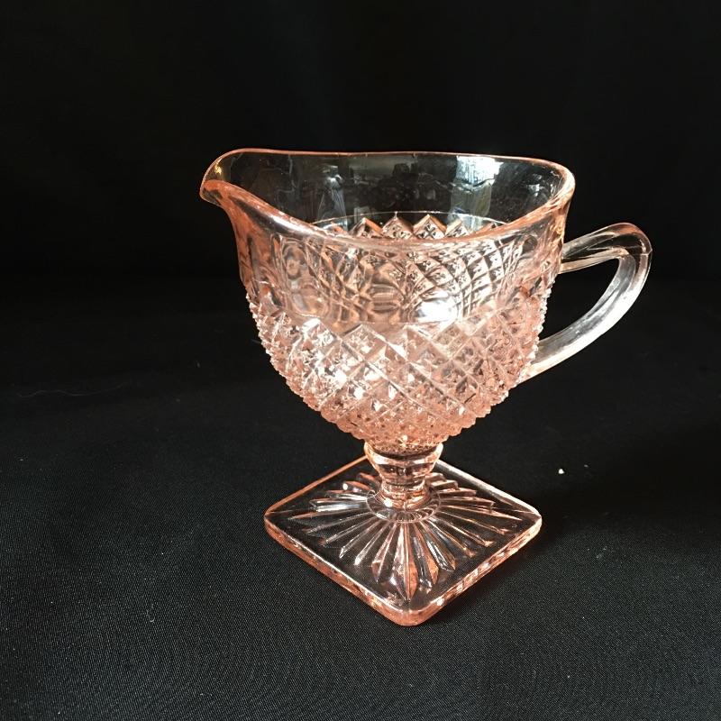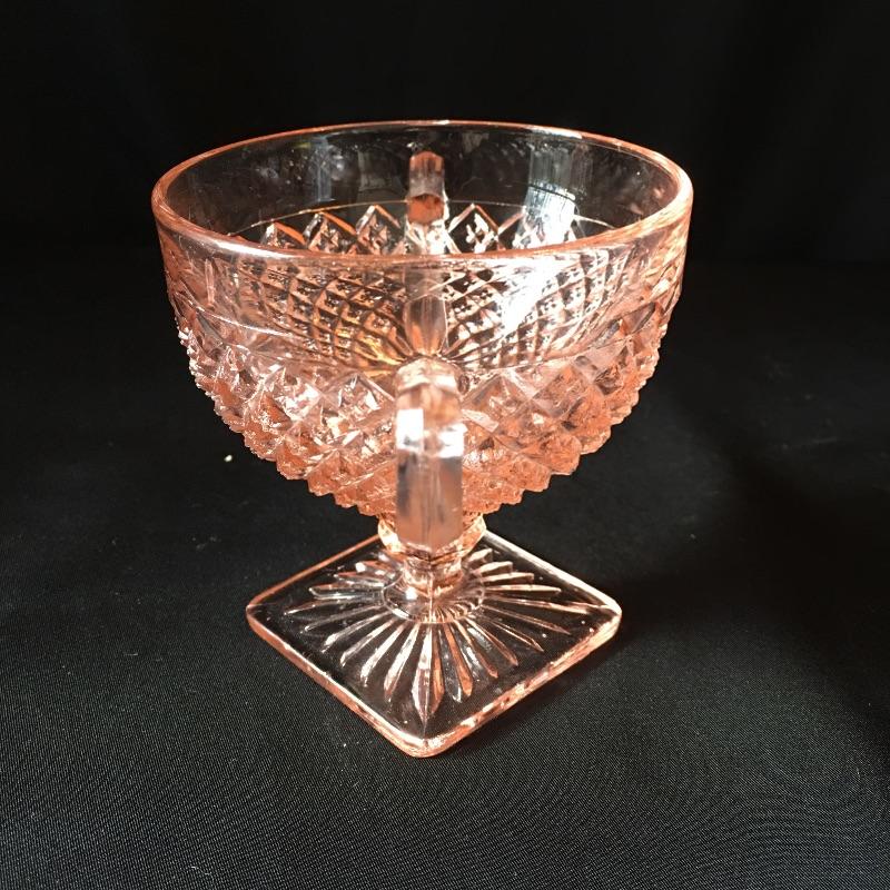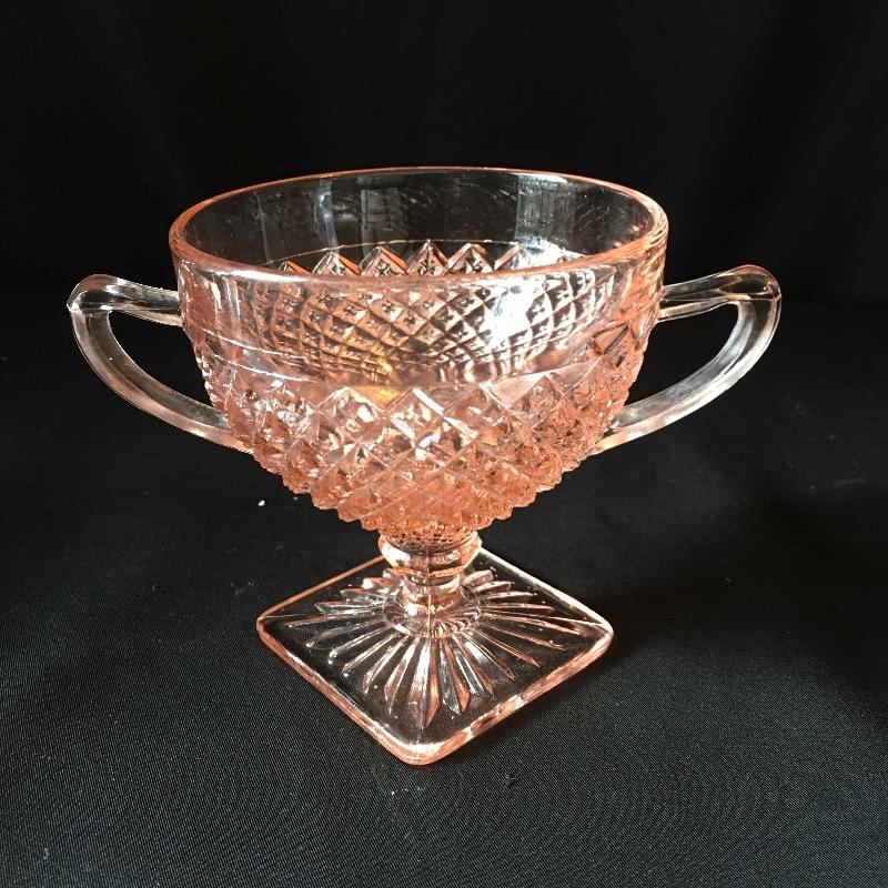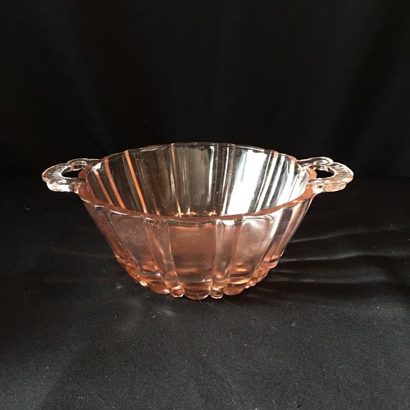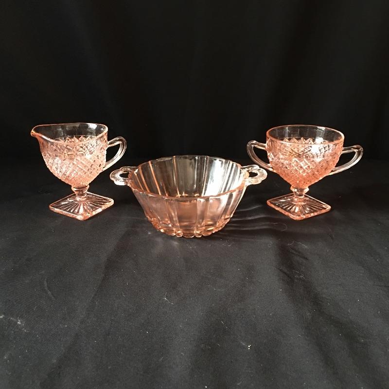 Three pieces of pink colored depression glass includes two stemmed cream and sugar bowls and one bowl. A great girly delicate classic style to host your book club or afternoon tea. Bowl measures 5.5”D x 2.25” tall.