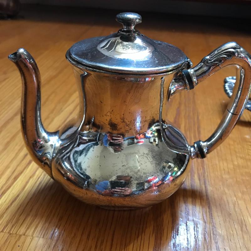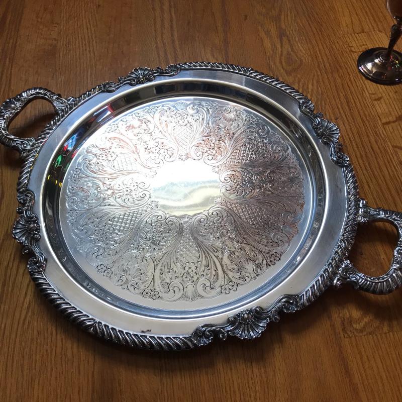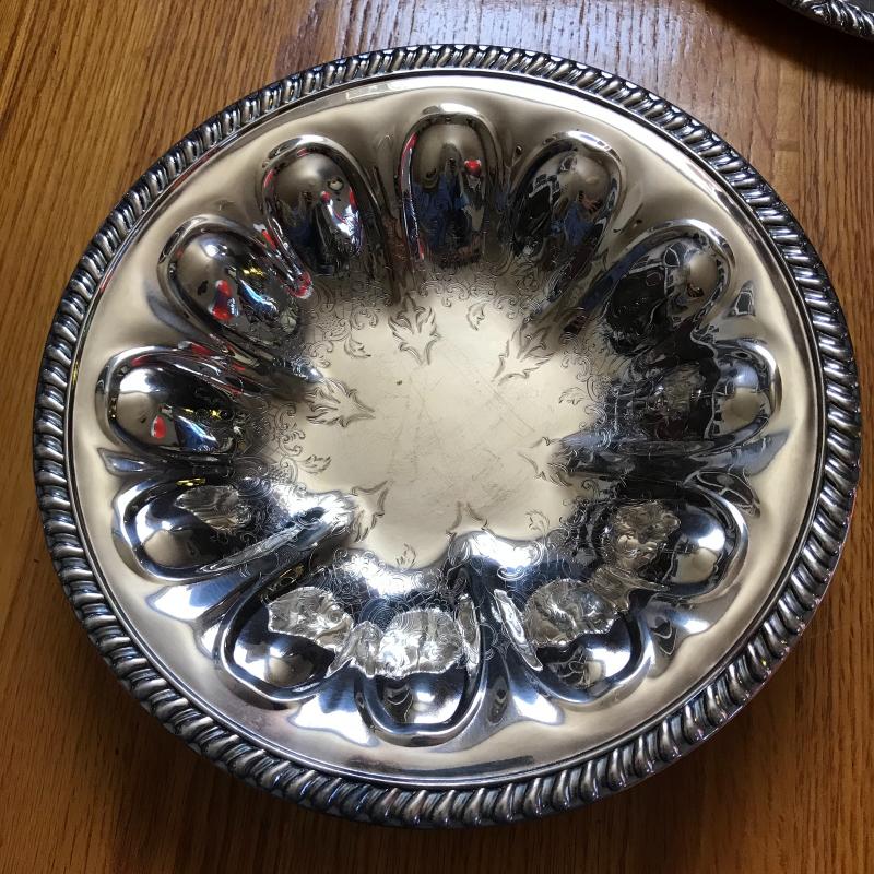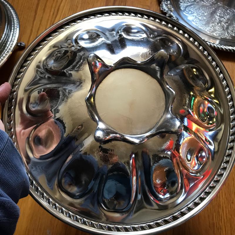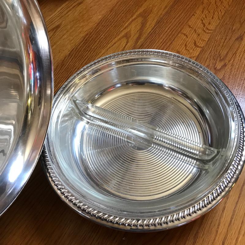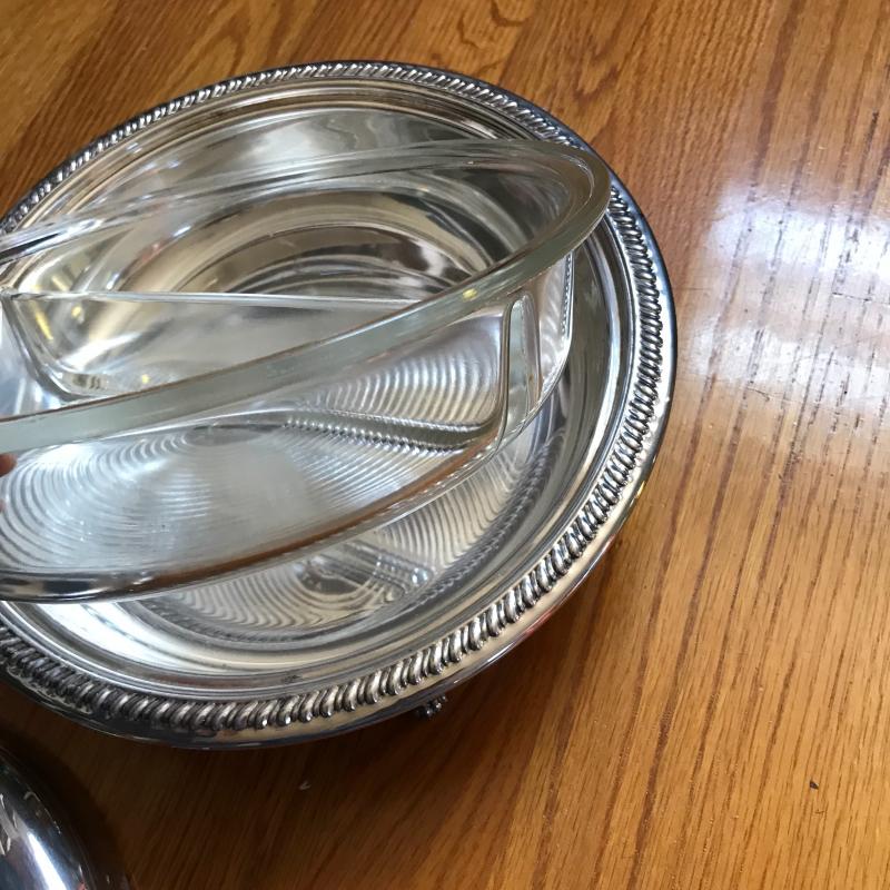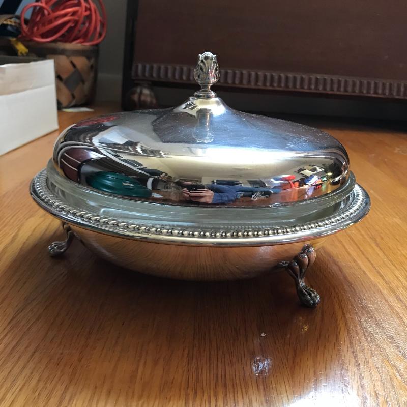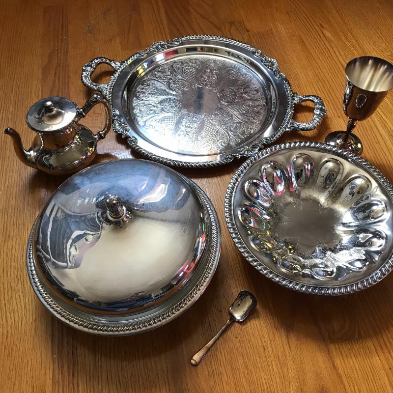 Lot includes serving tray, covered serving dish with glass insert, shallow bowl with feet, goblet and tea pot. No shipping available. Local pickup only in Asheville, NC.
