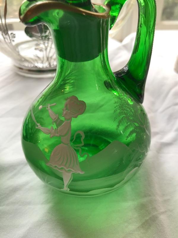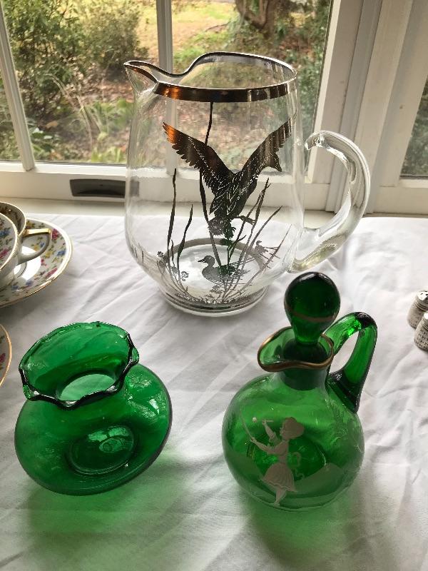 Silver overlay on glass duck pitcher and Mary Gregory cruet with green glass vase