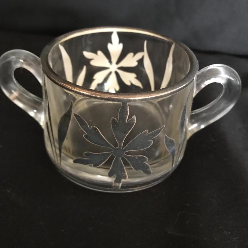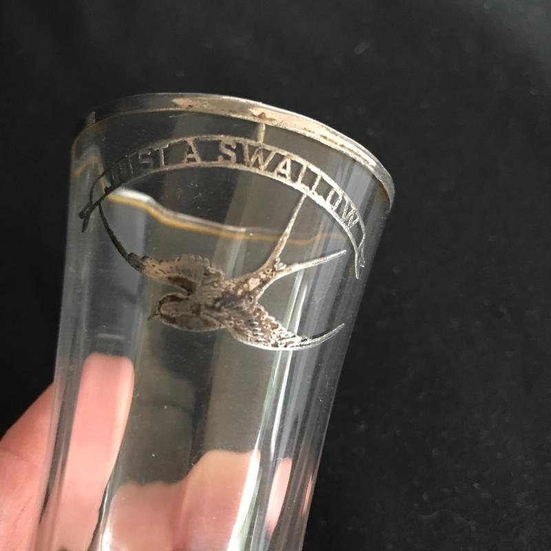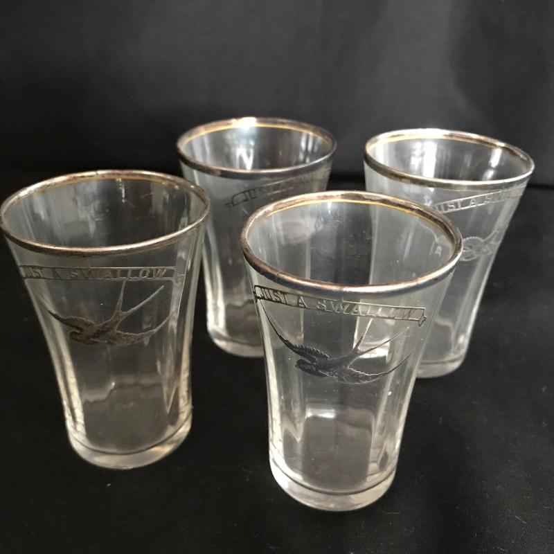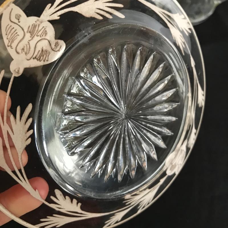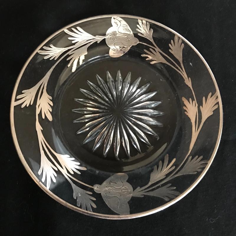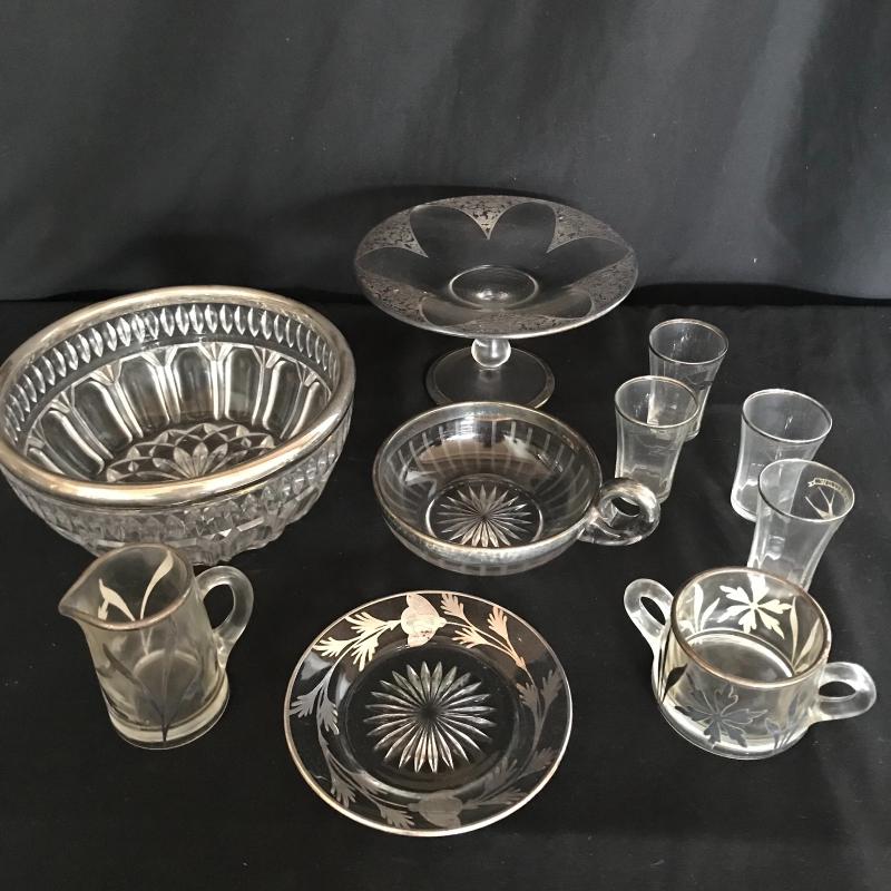 Lot includes ten pieces of crystal/glassware with silver overlay in various patterns. Small glasses have swallows on them and read “tiny swallow.” Local pickup only.