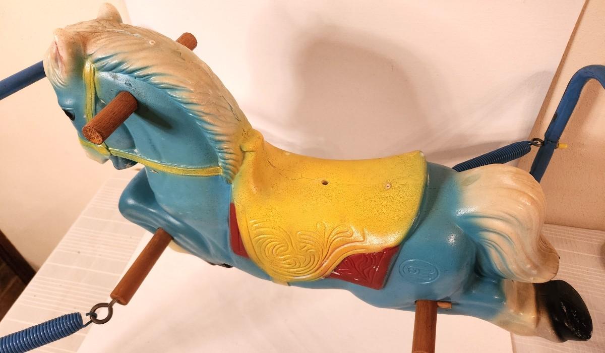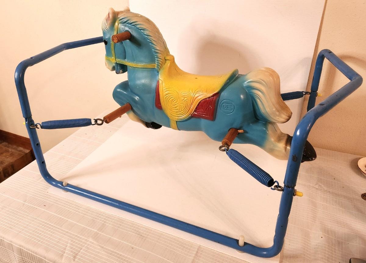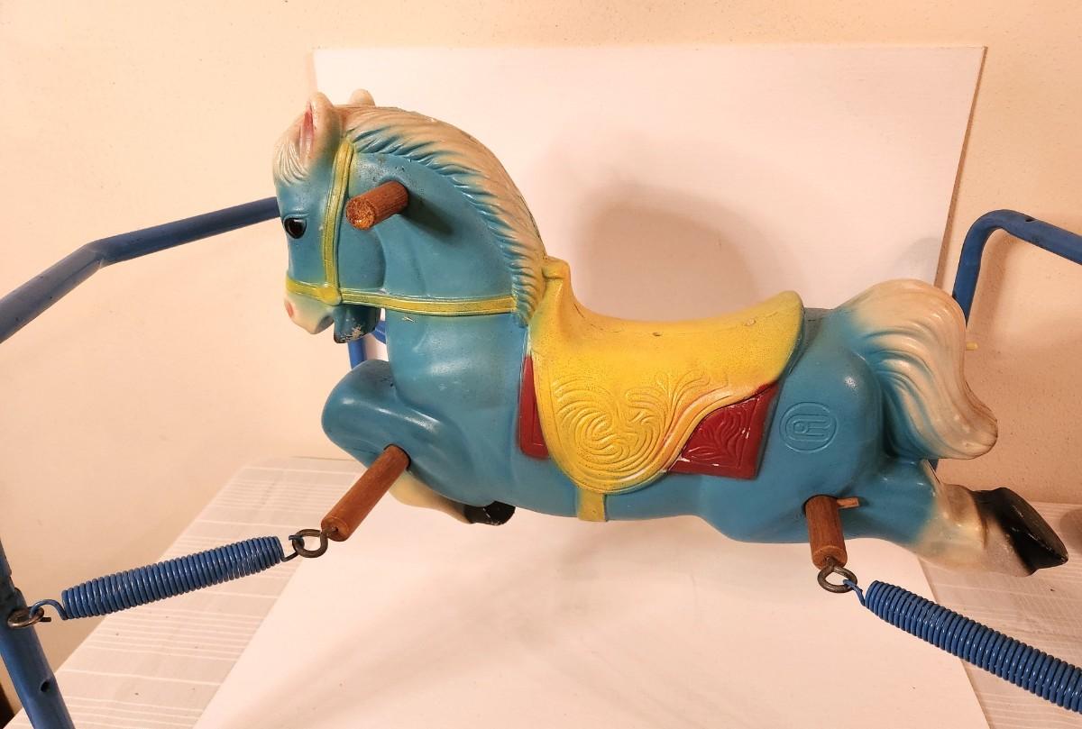 Small vintage "Wonder Horse" type spring-based riding toy. Metal frame. 17" tall, 30" long - this one is for a little guy. Good vintage condition.