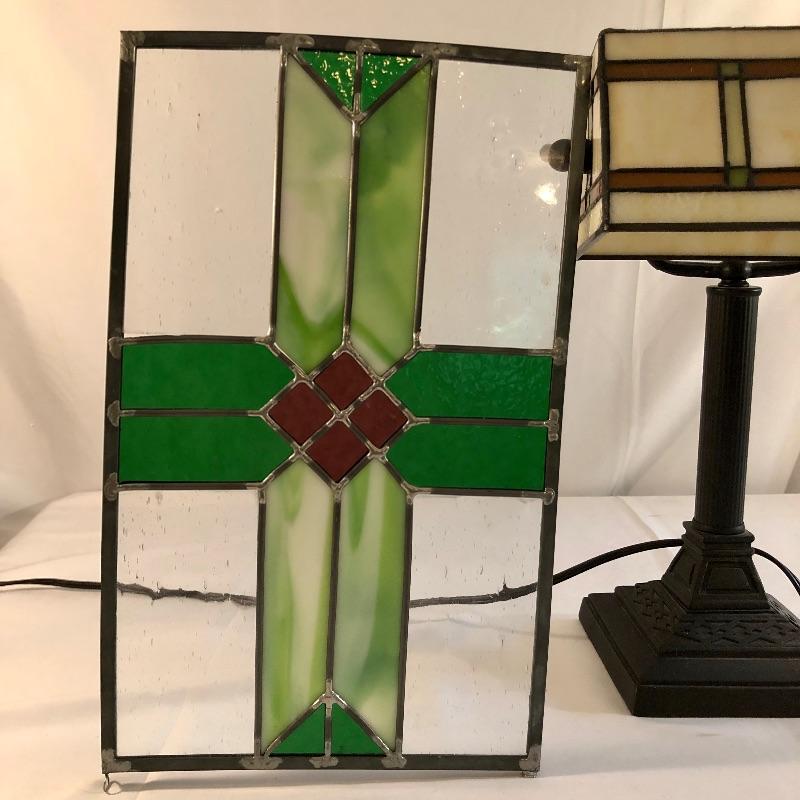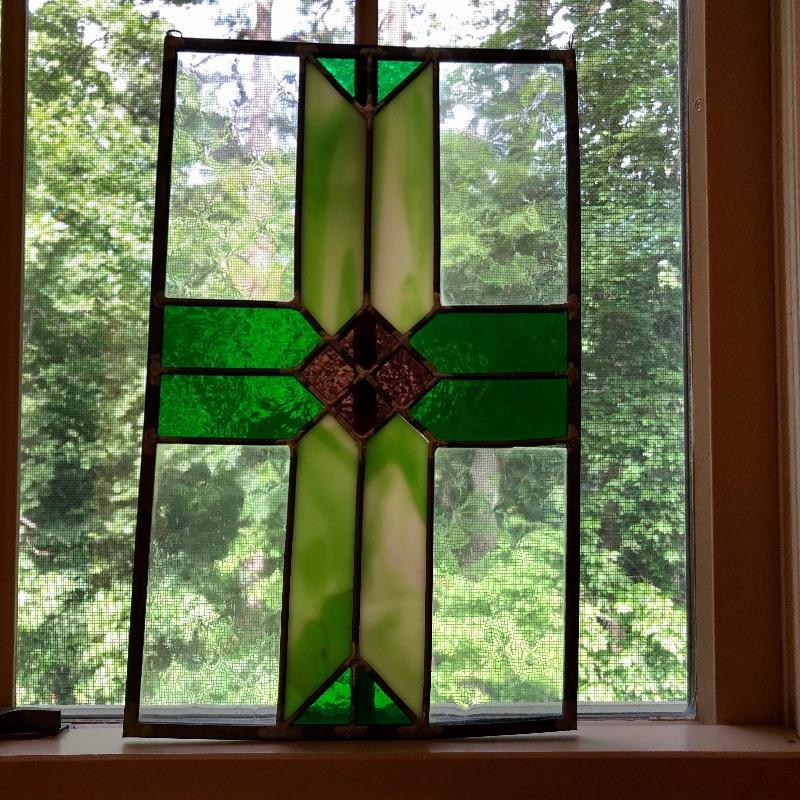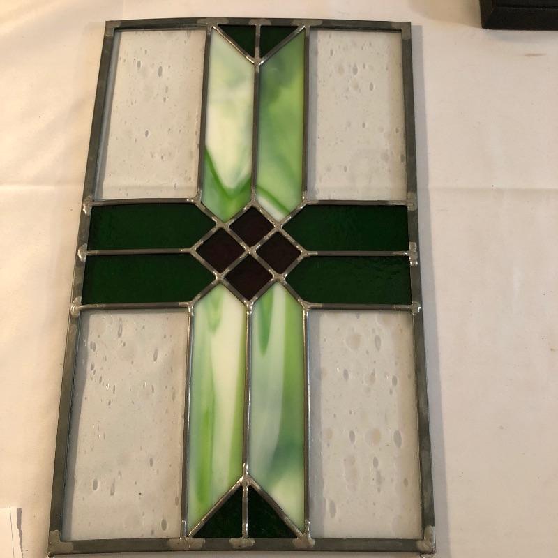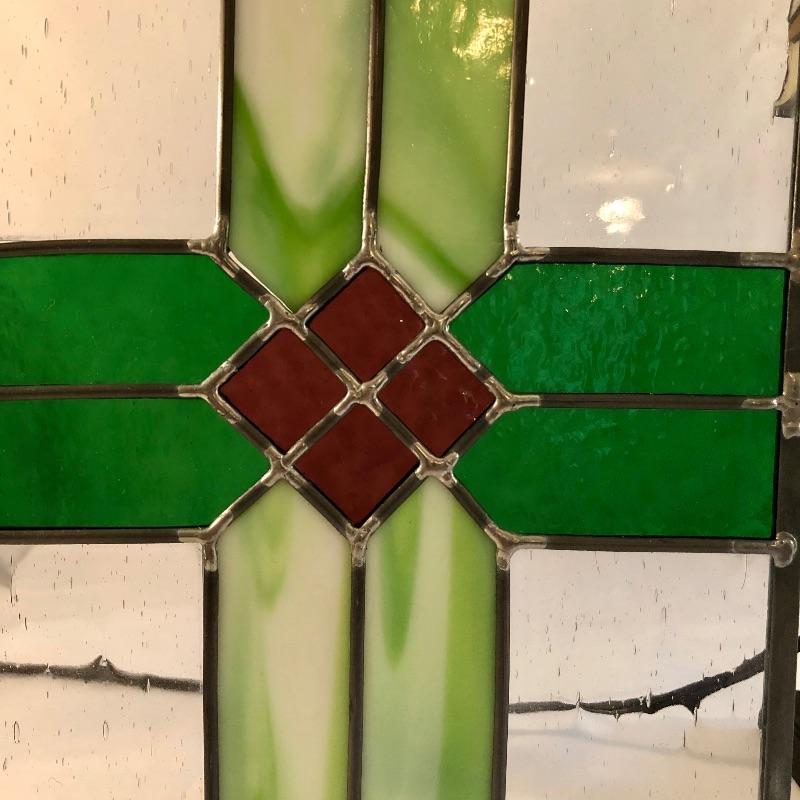 This stained glass accent piece is a perfect size to hang in most any sizes window. Extremely attractive shades of green with a ruby red center it’s a beauty!