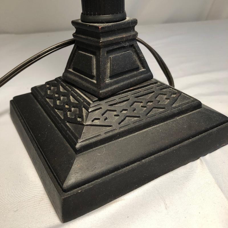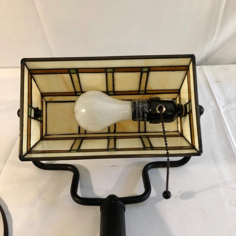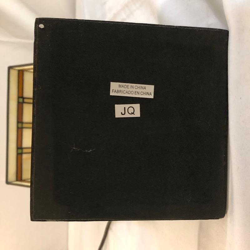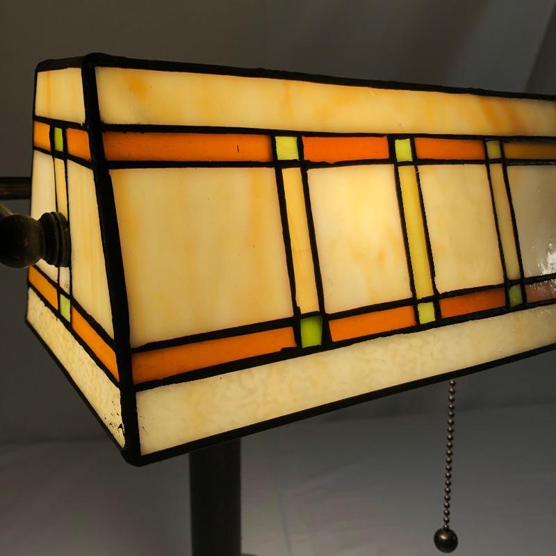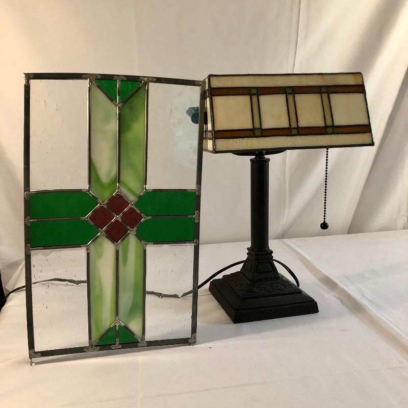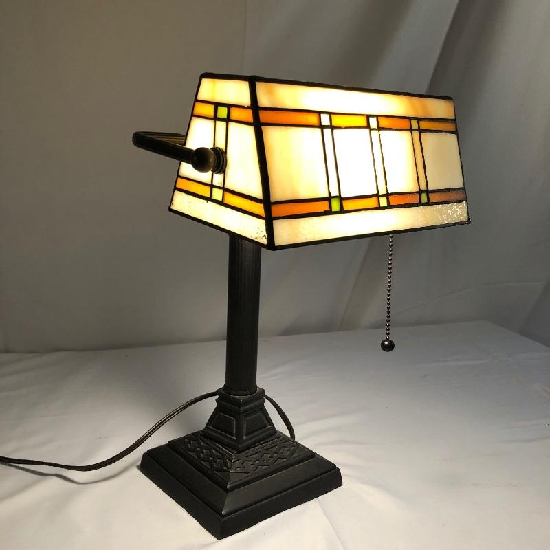We have paired this with a lamp that has a stained glass appearance in neutral tan and brown tones.
