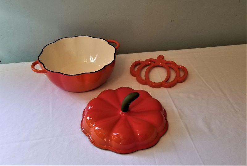 Techniques Enamel casserole in the form of a pumpkin - has lid and matching trivet. Good condition. 12" across, 5" tall.
